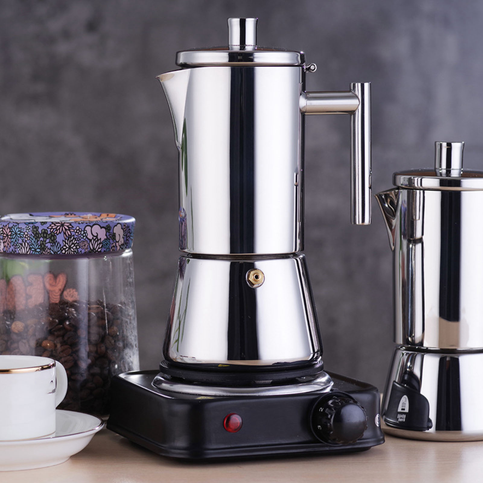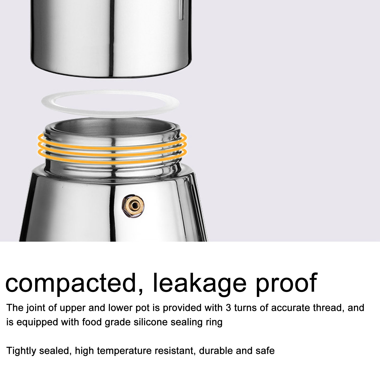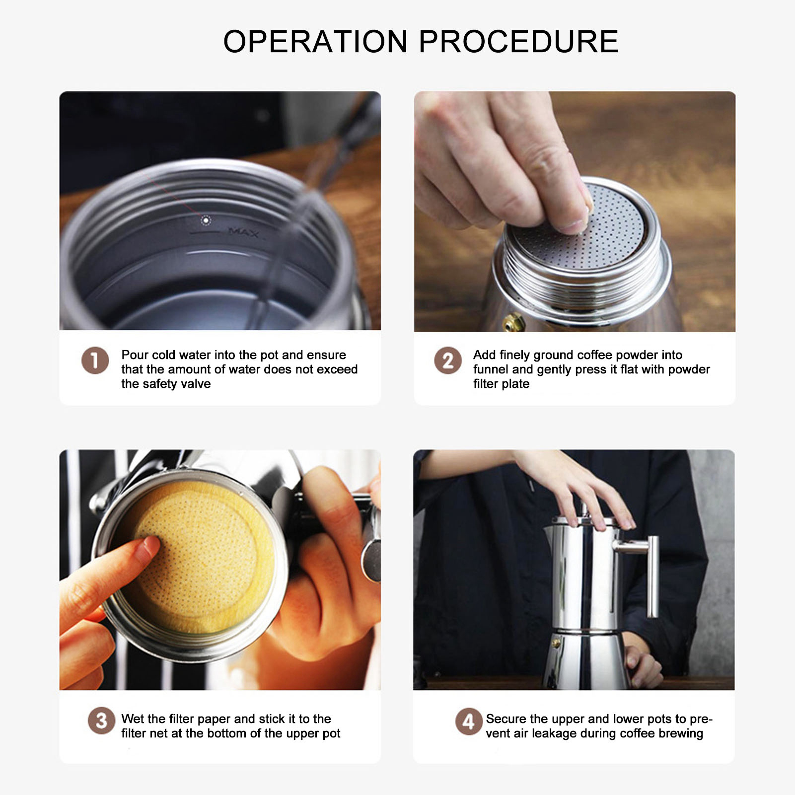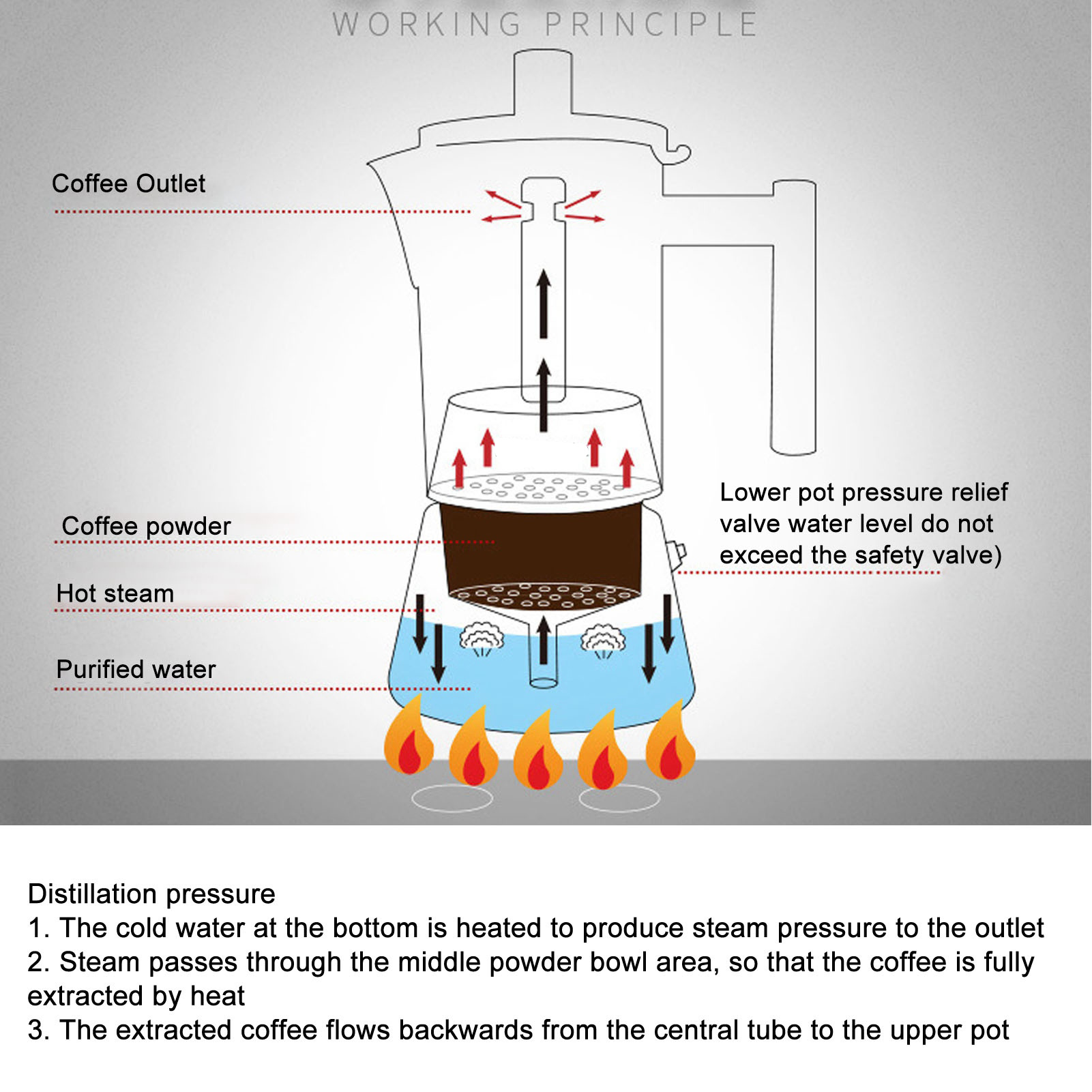 1、Premium Material: Made of premium 304 stainless steel, the coffee making pot adopts high mirror polishing treatment, rustproof and corrosion resistant. 2、Wide Application: The stainless steel coffee making pot is suitable for gas stove, induction stove, electric stove and so on, dishwasher safe. 3、Heatproof: The coffee maker kettle adopts exquisite craftsmanship, has heat resistant handle and insulation lid, can be used for a long time. 4、Safety Valve: The stainless steel coffee maker adopts safety valve design, with dual safety, takes less than five minutes to heat and brew. 5、Leakage Proof: The spout of polished coffee pot adopts the aquiline design, the water flow is clear, leakage prevention, overflow proof, not easy to splashing.