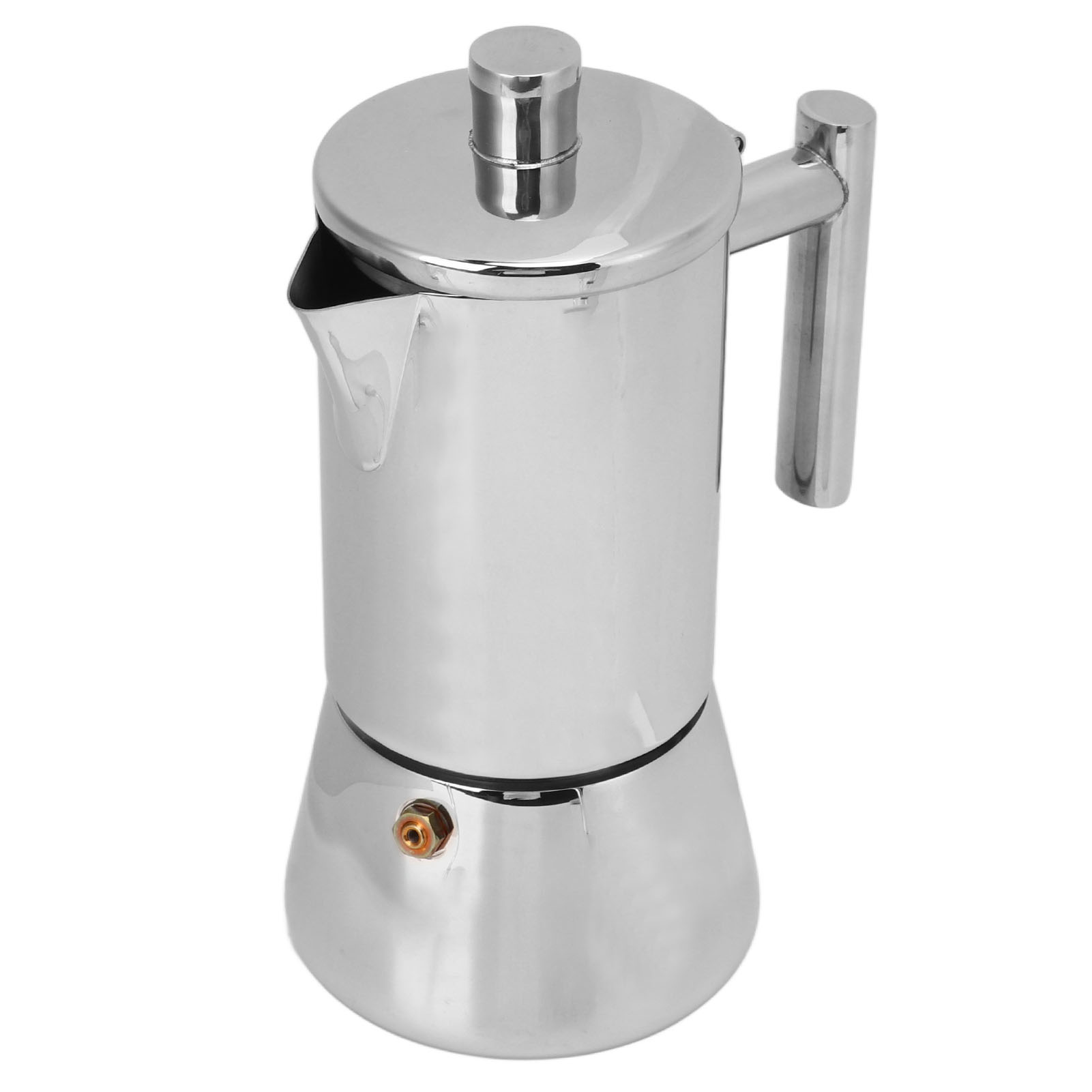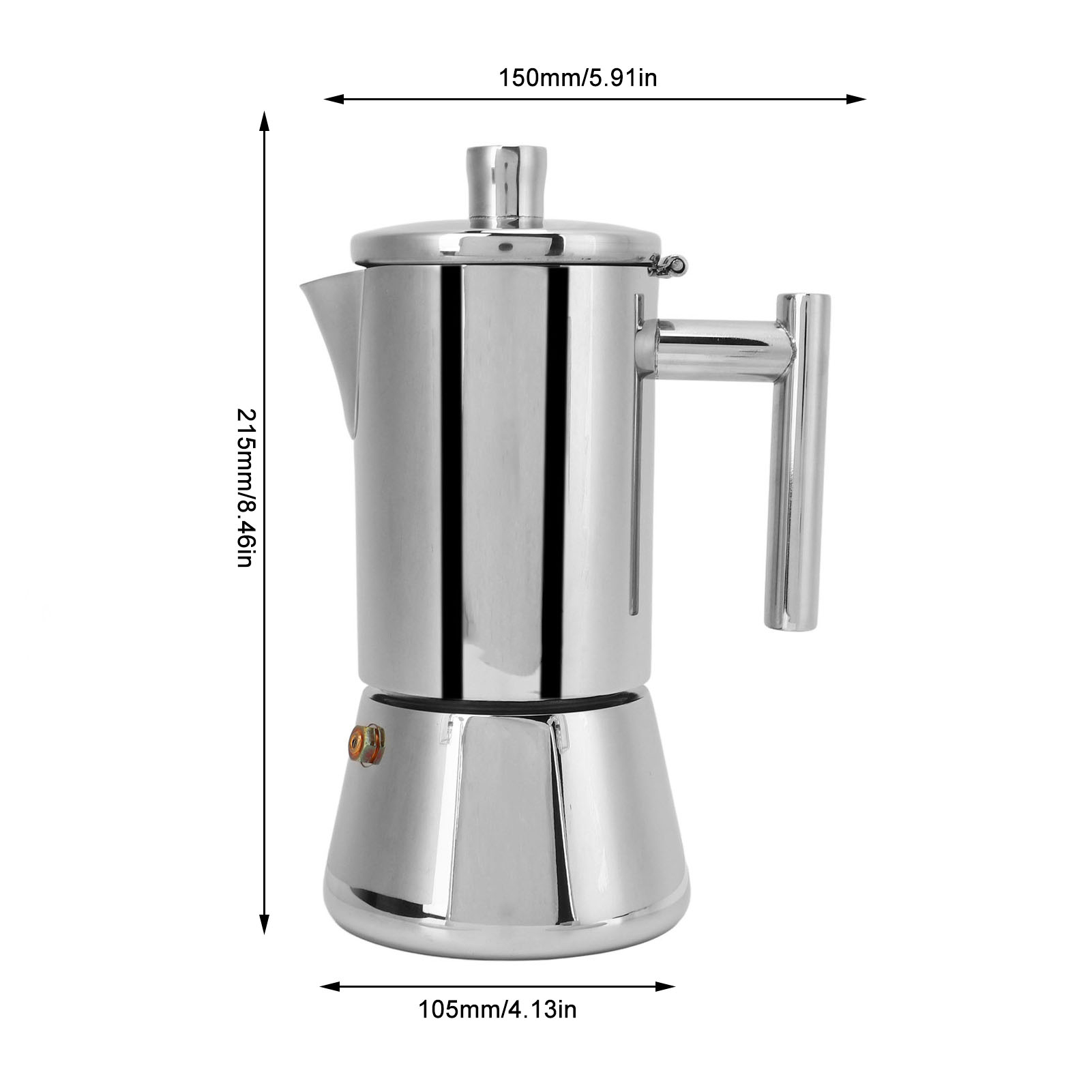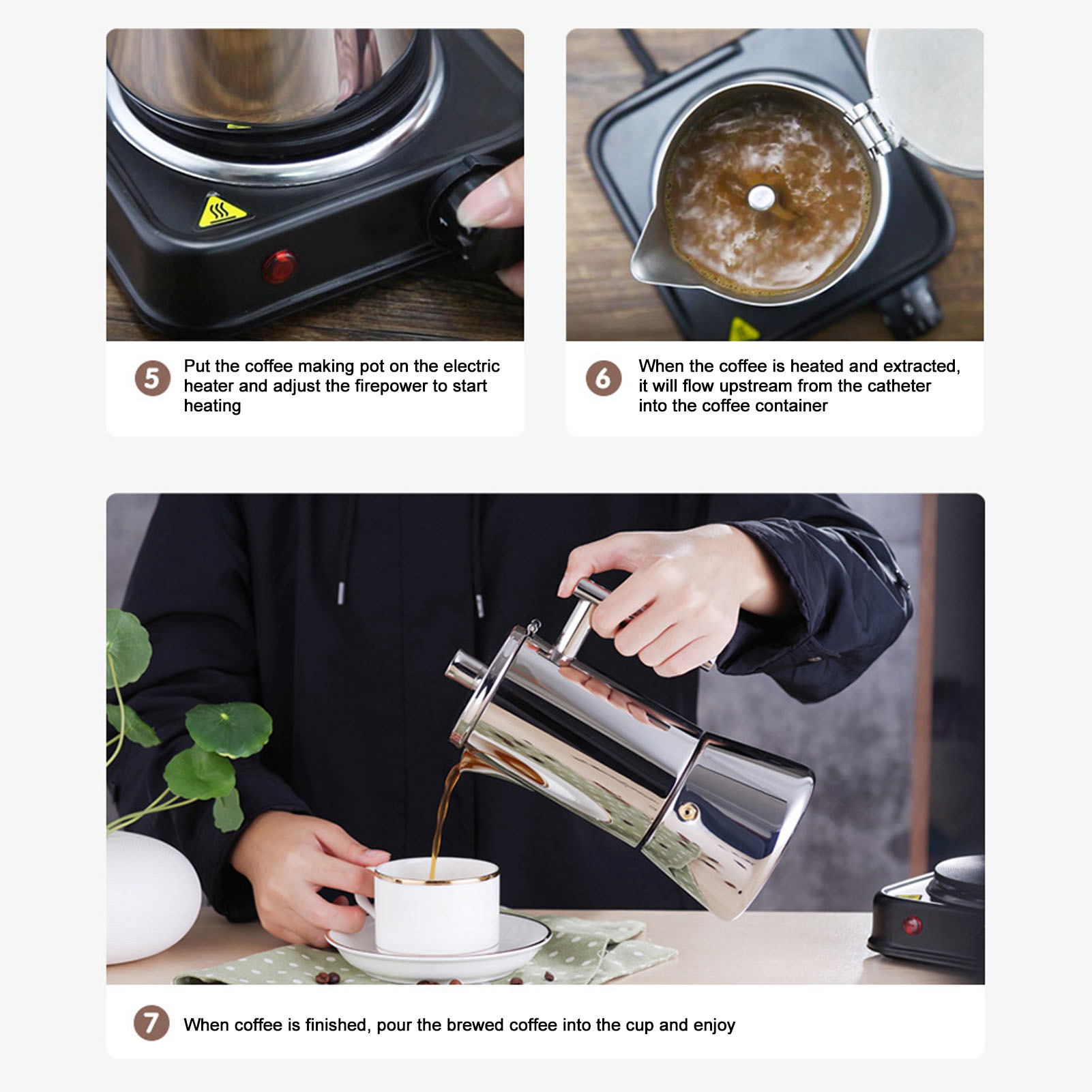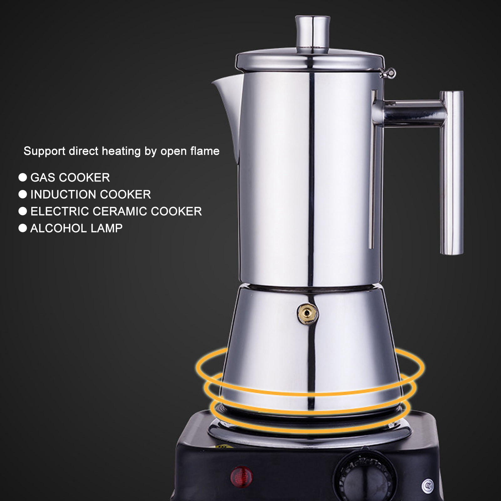 1、Premium Material: Made of premium 304 stainless steel, the coffee making pot adopts high mirror polishing treatment, rustproof and corrosion resistant. 2、Wide Application: The stainless steel coffee making pot is suitable for gas stove, induction stove, electric stove and so on, dishwasher safe. 3、Heatproof: The coffee maker kettle adopts exquisite craftsmanship, has heat resistant handle and insulation lid, can be used for a long time. 4、Safety Valve: The stainless steel coffee maker adopts safety valve design, with dual safety, takes less than five minutes to heat and brew. 5、Leakage Proof: The spout of polished coffee pot adopts the aquiline design, the water flow is clear, leakage prevention, overflow proof, not easy to splashing.