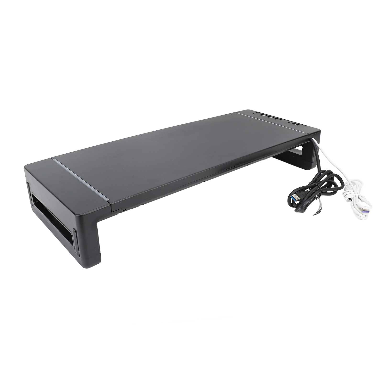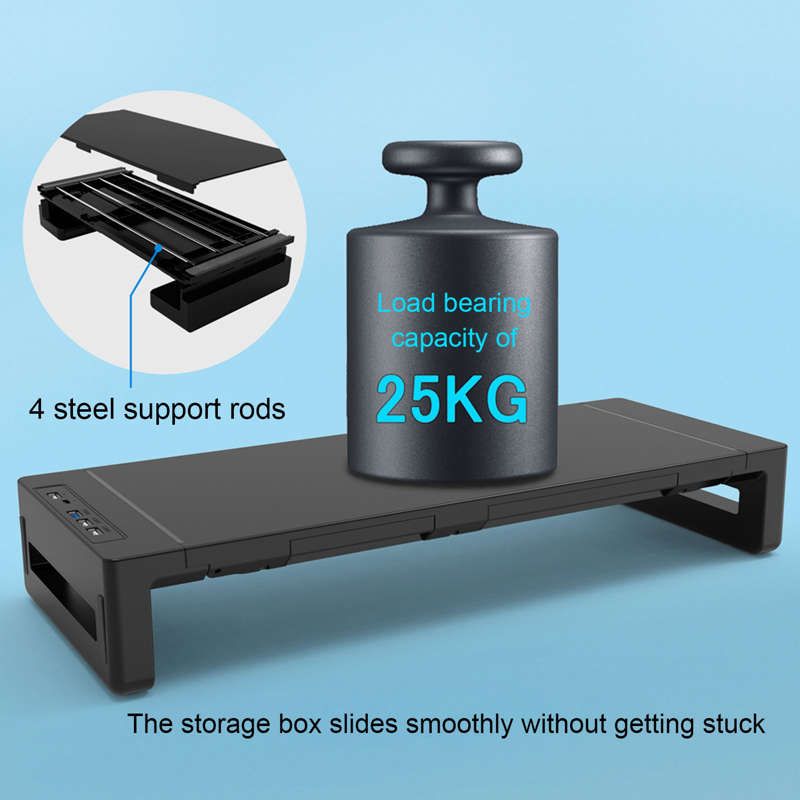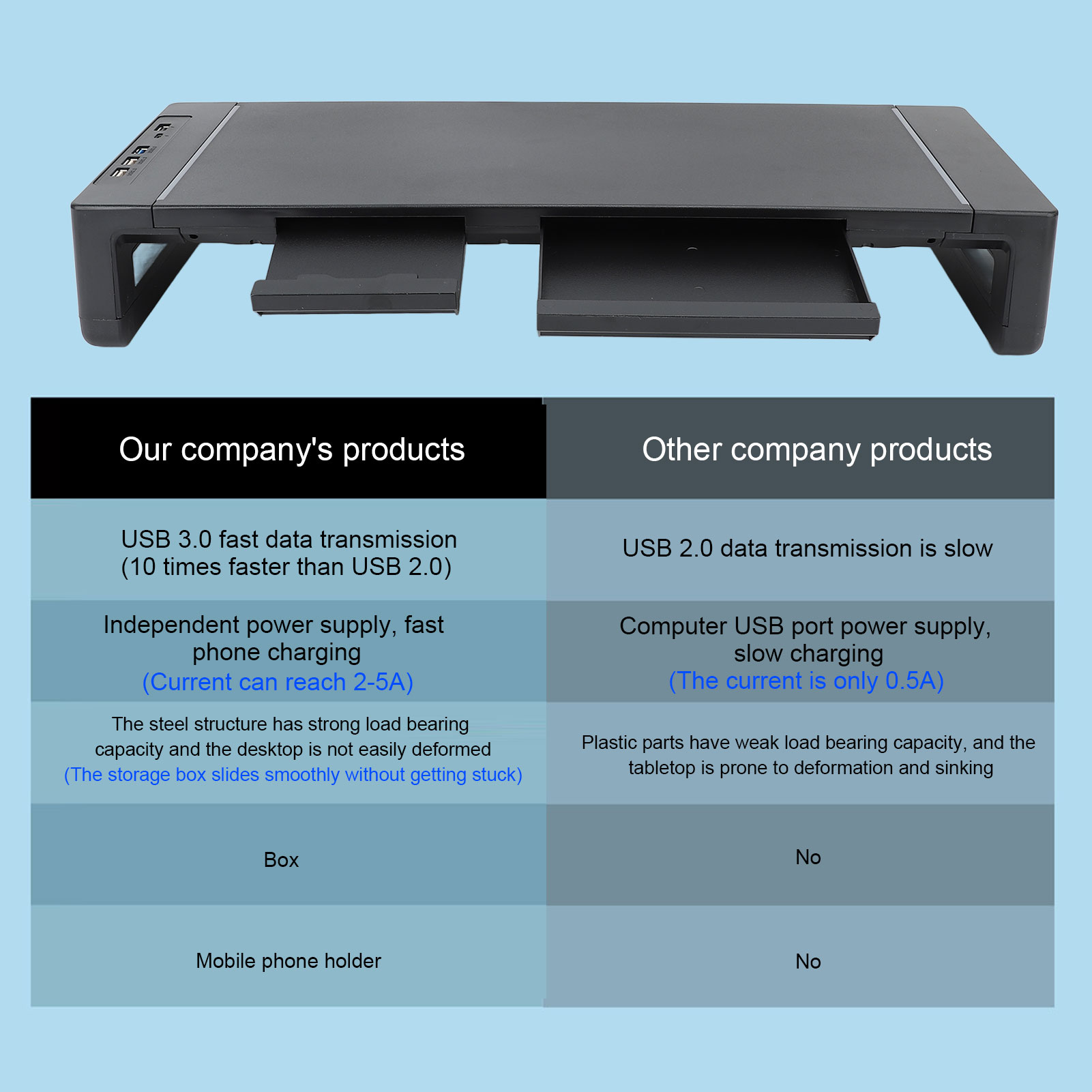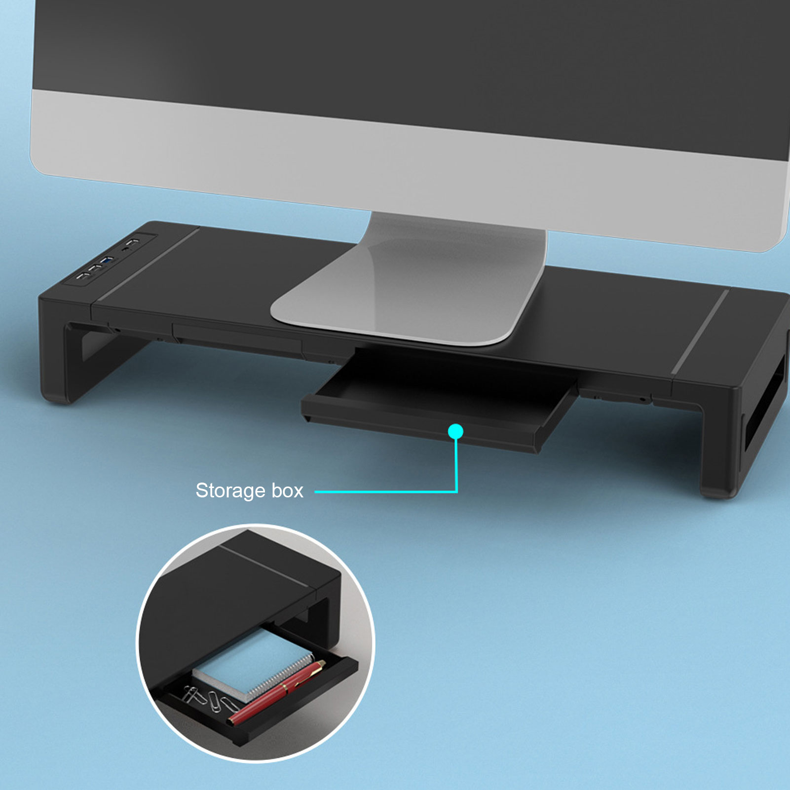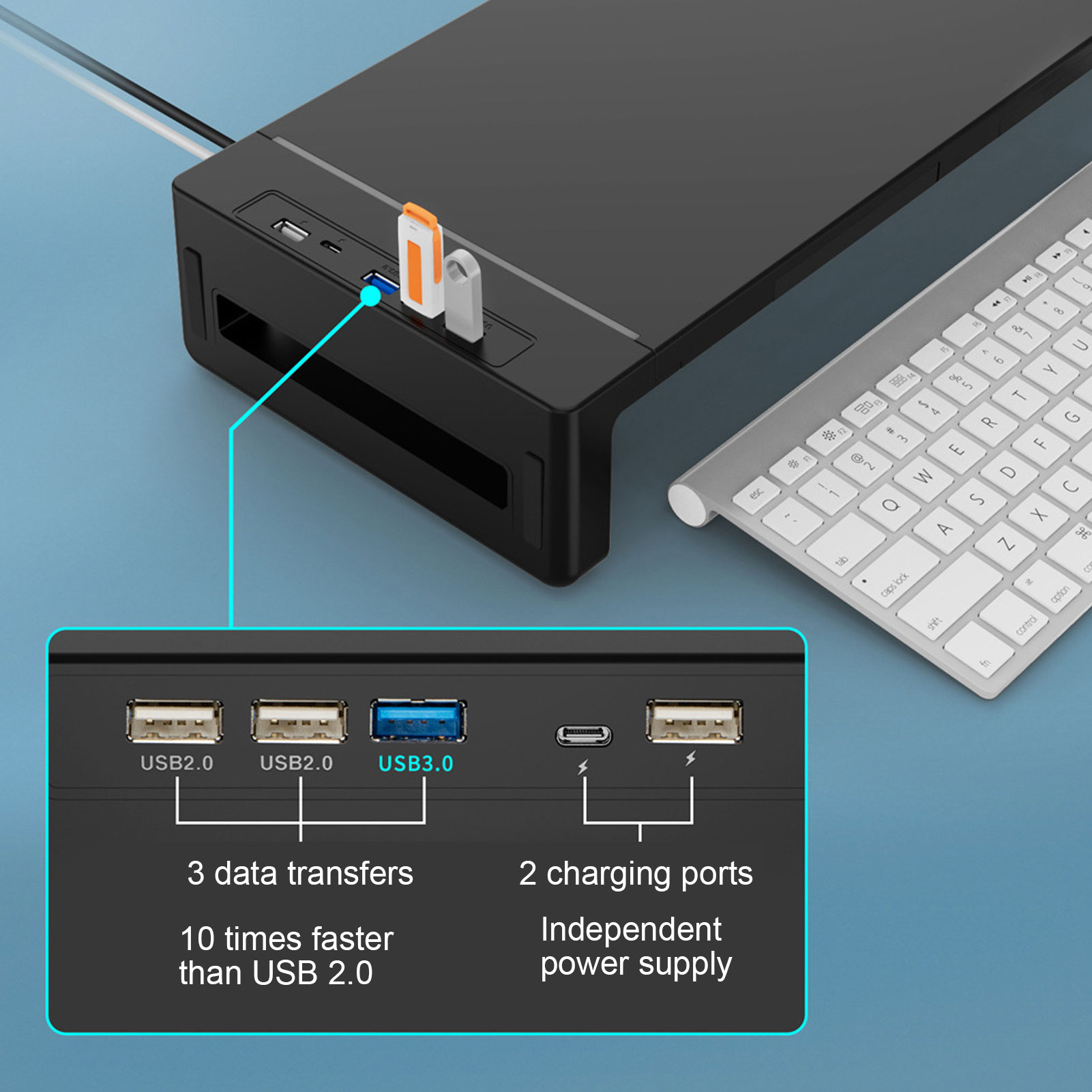 1、EFFICIENT ORGANIZATION: Our monitor stand provides you with more work space, making your desk tidier and more organized. It conveniently stores important files, notebooks, and more in an orderly manner. 2、VISUAL COMFORT: The monitor stand raises your screen to the most comfortable viewing height, preventing neck and eye fatigue caused by prolonged computer use. With a height adjustment of up to 90mm, it offers an ergonomic visual experience, relieving tension in the neck and back. 3、POWERFUL FAST CHARGING: With independent USB 3.0 power supply fast charging, our monitor stand can quickly charge your devices, meeting the demands of your fast paced work. It includes both TYPE C and USB ports, catering to all your charging needs. 4、CONVENIENT USAGE: Equipped with a drawer phone holder, it securely holds your phone in front of you, allowing easy access to phone information without the need to hold it manually. This enhances work efficiency. It can effortlessly withstand a weight of 25KG without deformation, remaining stable and sturdy even after prolonged use. 5、MULTI FUNCTIONAL HUB: Our monitor stand comes with an eight in one hub, enabling you to connect multiple devices simultaneously and meet various usage requirements. Whether it's connecting a mouse, keyboard, USB drive, or headphones, it provides seamless connectivity.