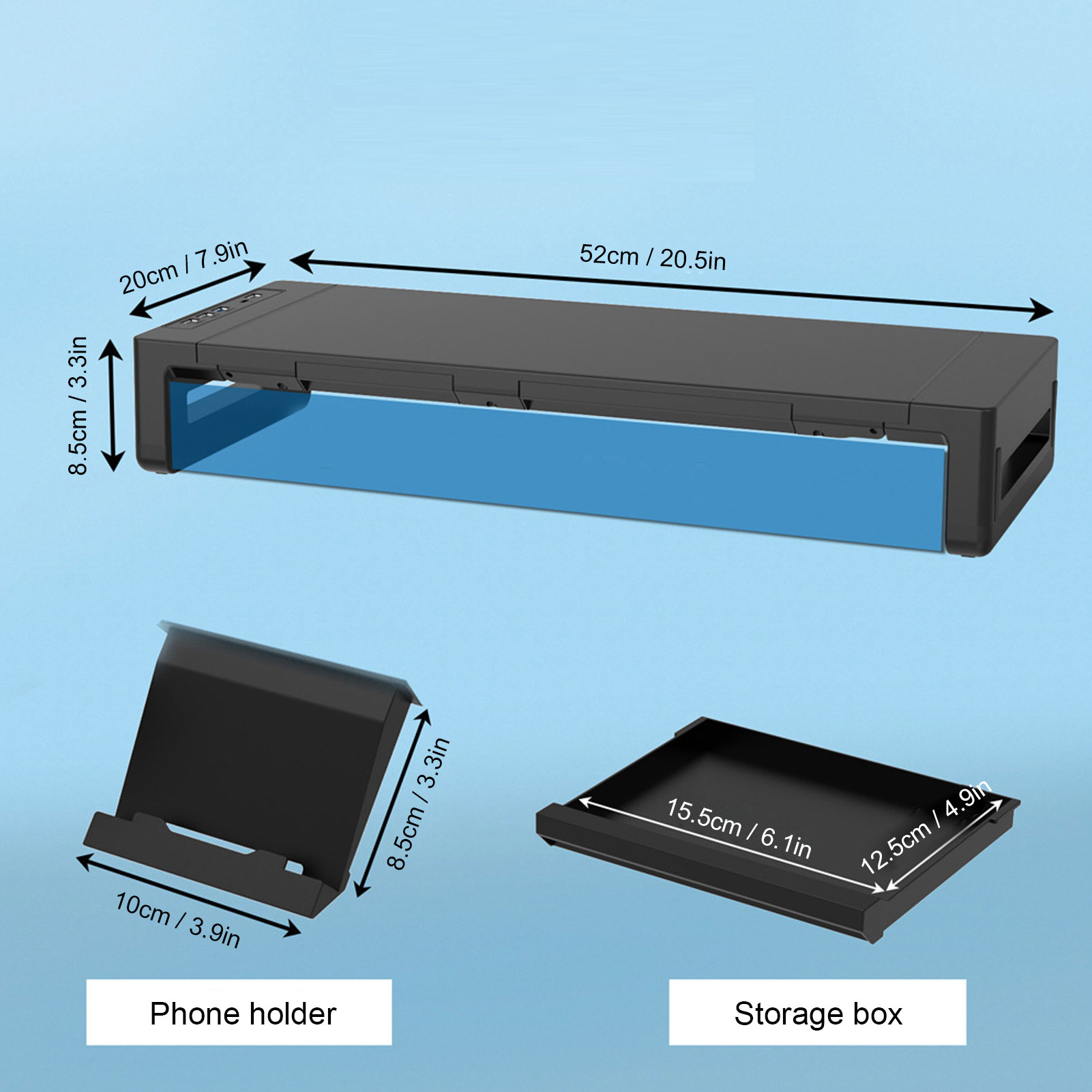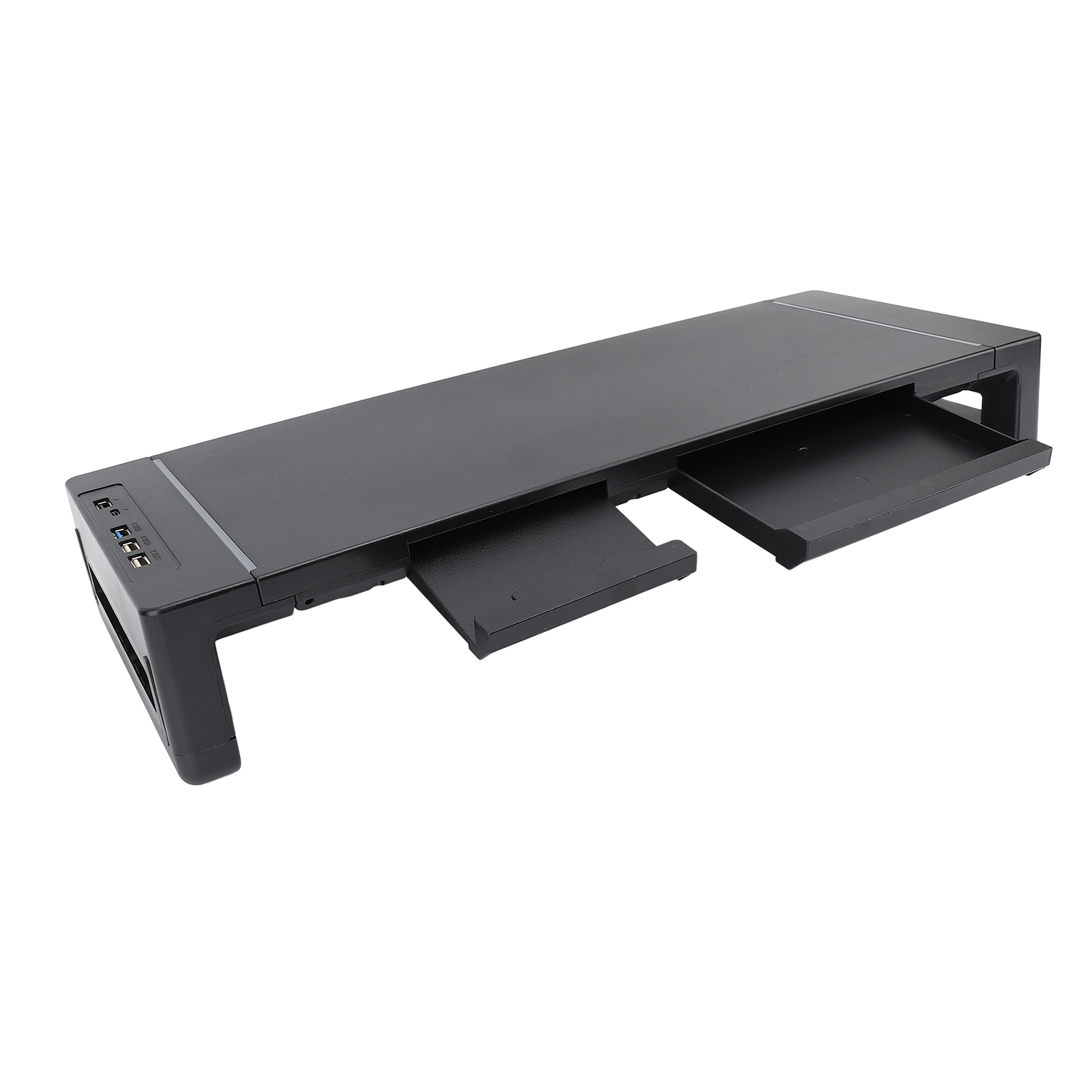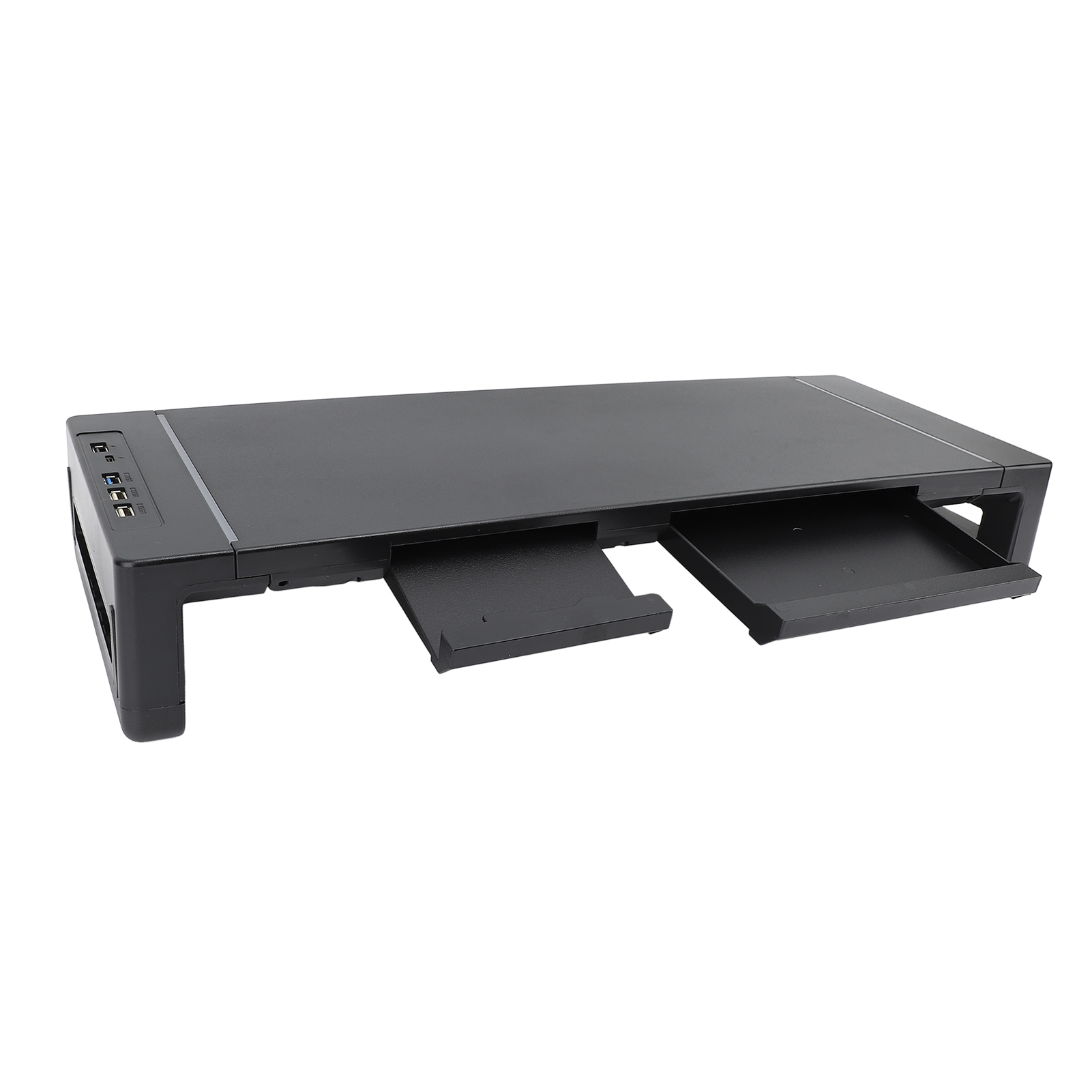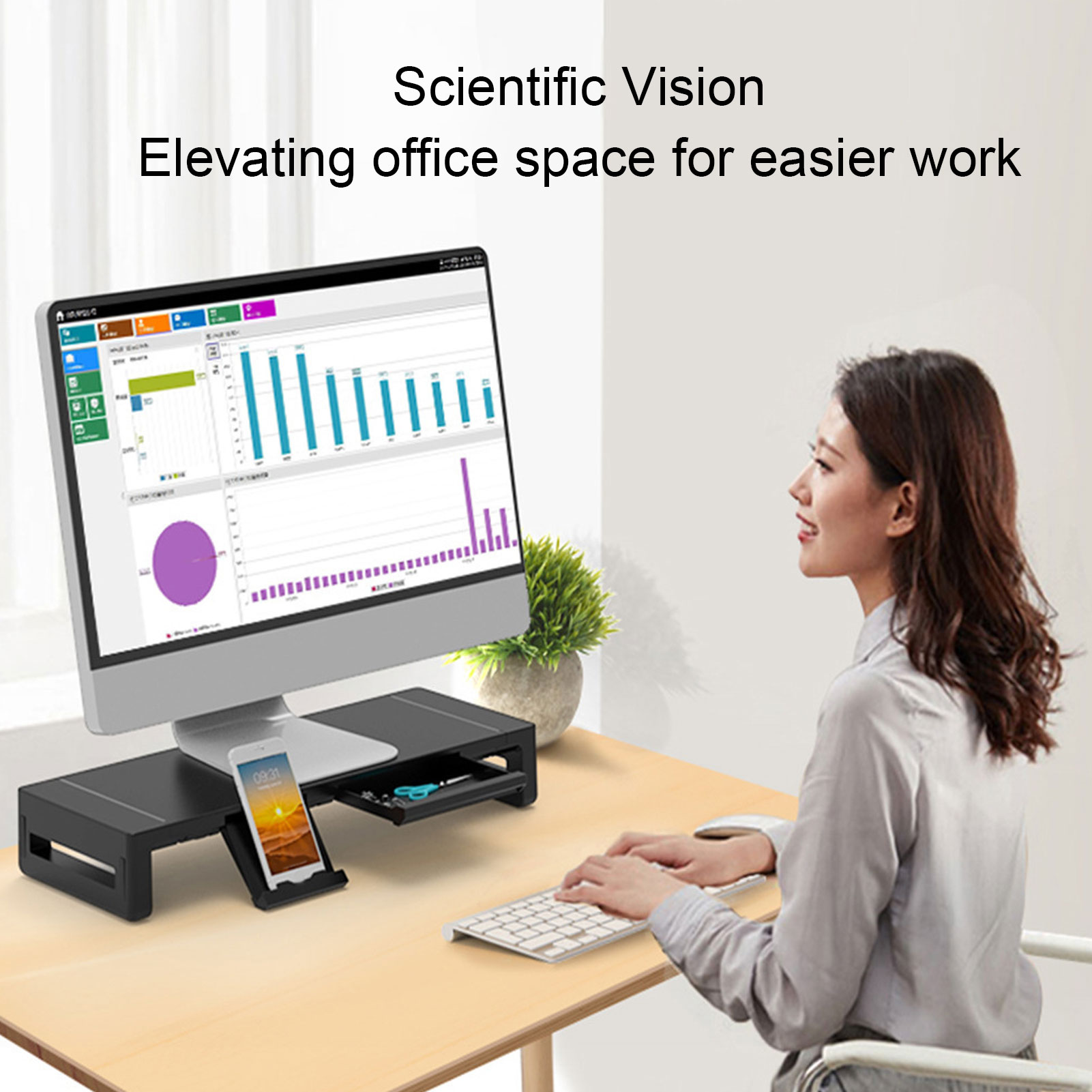 1、EFFICIENT ORGANIZATION: Our monitor stand provides you with more work space, making your desk tidier and more organized. It conveniently stores important files, notebooks, and more in an orderly manner. 2、VISUAL COMFORT: The monitor stand raises your screen to the most comfortable viewing height, preventing neck and eye fatigue caused by prolonged computer use. With a height adjustment of up to 90mm, it offers an ergonomic visual experience, relieving tension in the neck and back. 3、POWERFUL FAST CHARGING: With independent USB 3.0 power supply fast charging, our monitor stand can quickly charge your devices, meeting the demands of your fast paced work. It includes both TYPE C and USB ports, catering to all your charging needs. 4、CONVENIENT USAGE: Equipped with a drawer phone holder, it securely holds your phone in front of you, allowing easy access to phone information without the need to hold it manually. This enhances work efficiency. It can effortlessly withstand a weight of 25KG without deformation, remaining stable and sturdy even after prolonged use. 5、MULTI FUNCTIONAL HUB: Our monitor stand comes with an eight in one hub, enabling you to connect multiple devices simultaneously and meet various usage requirements. Whether it's connecting a mouse, keyboard, USB drive, or headphones, it provides seamless connectivity.