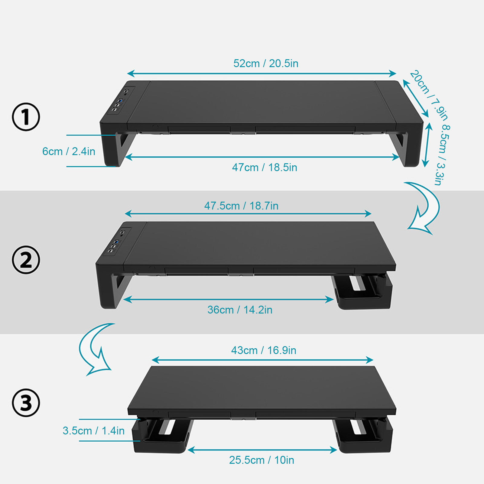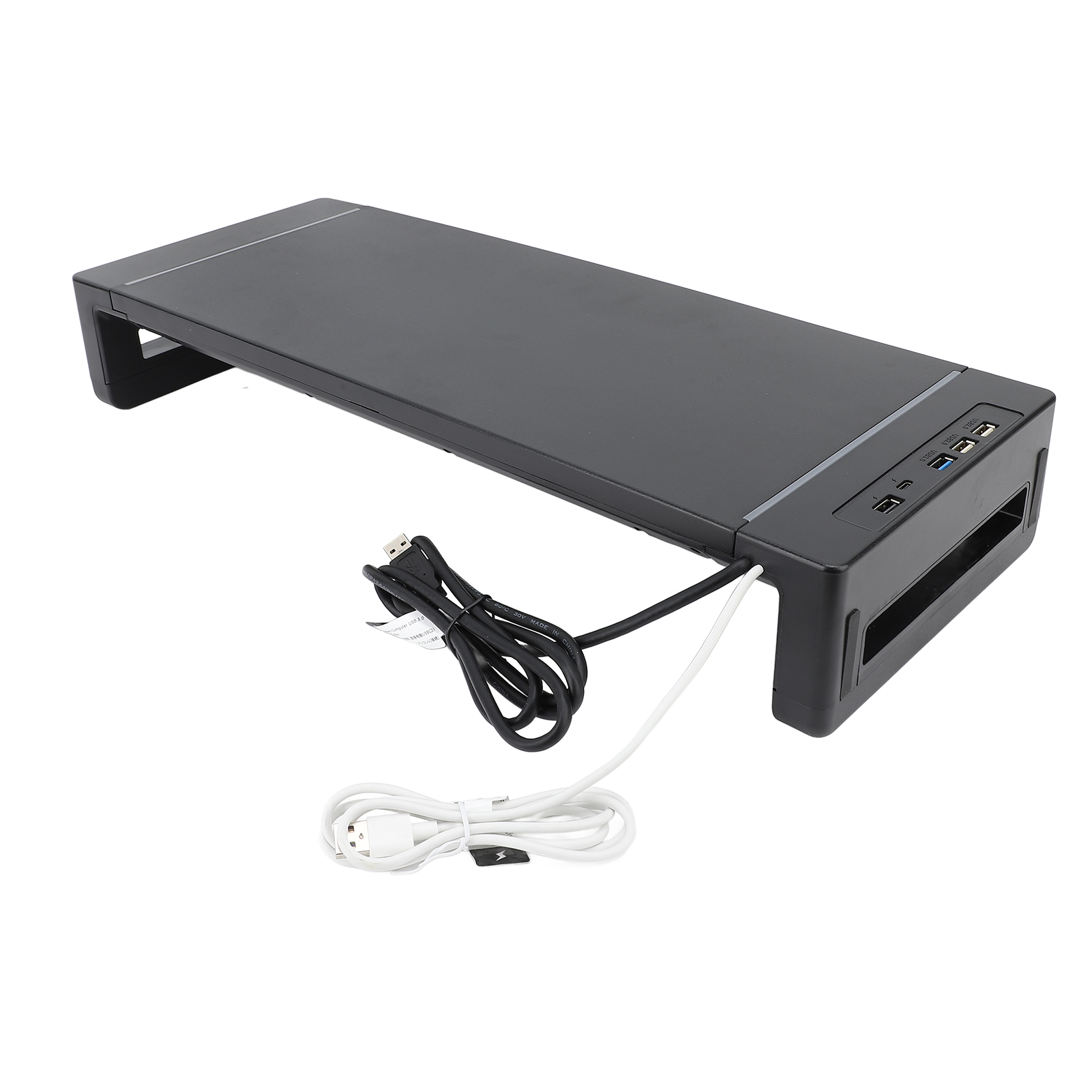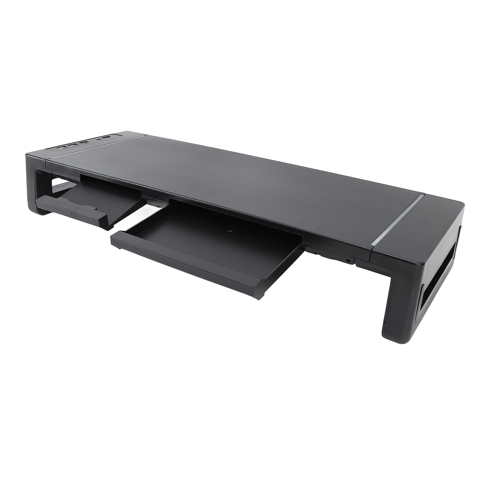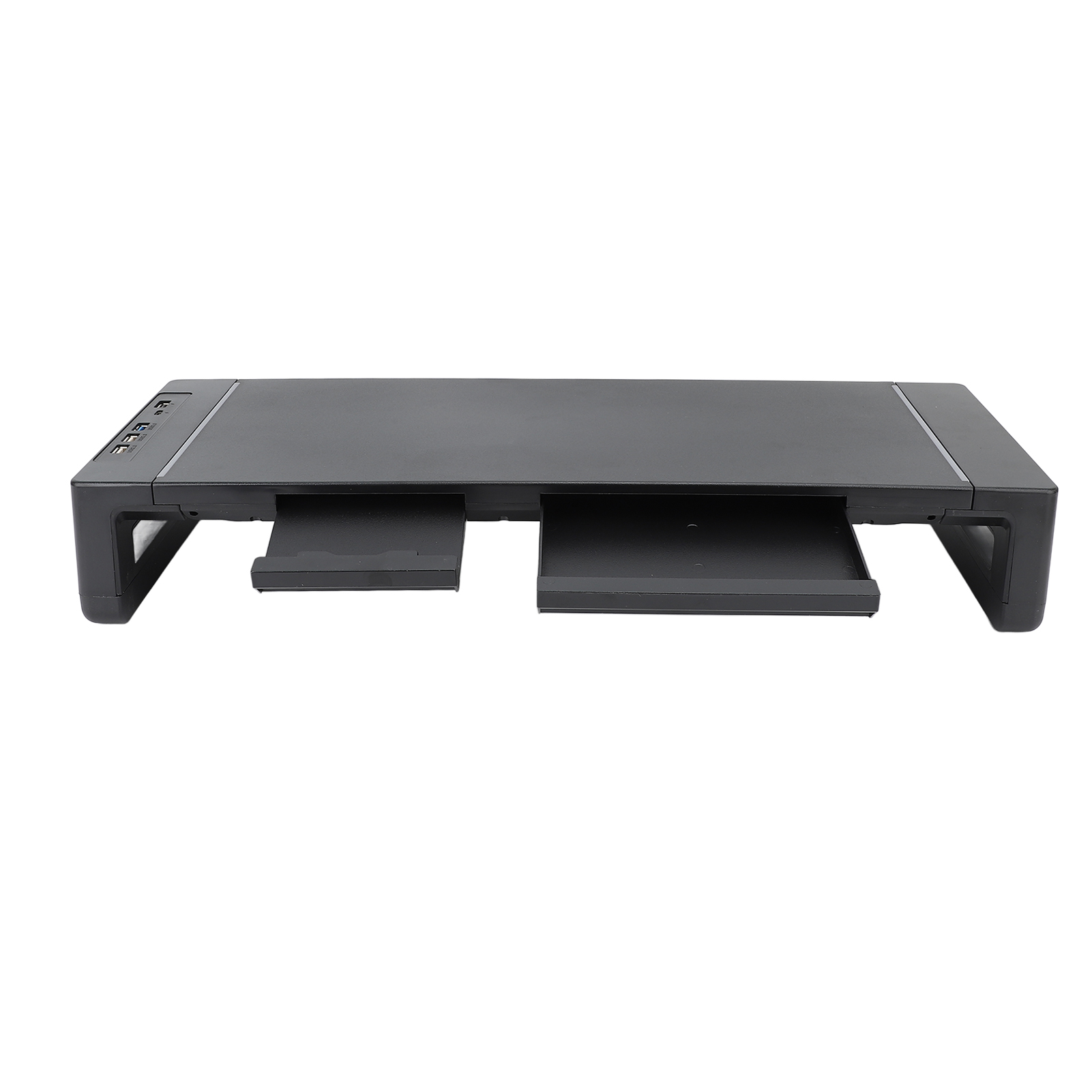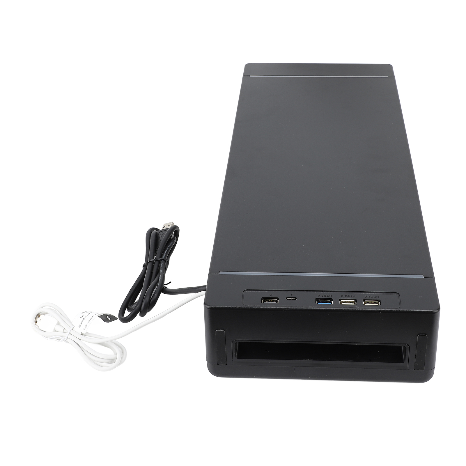 1、EFFICIENT ORGANIZATION: Our monitor stand provides you with more work space, making your desk tidier and more organized. It conveniently stores important files, notebooks, and more in an orderly manner. 2、VISUAL COMFORT: The monitor stand raises your screen to the most comfortable viewing height, preventing neck and eye fatigue caused by prolonged computer use. With a height adjustment of up to 90mm, it offers an ergonomic visual experience, relieving tension in the neck and back. 3、POWERFUL FAST CHARGING: With independent USB 3.0 power supply fast charging, our monitor stand can quickly charge your devices, meeting the demands of your fast paced work. It includes both TYPE C and USB ports, catering to all your charging needs. 4、CONVENIENT USAGE: Equipped with a drawer phone holder, it securely holds your phone in front of you, allowing easy access to phone information without the need to hold it manually. This enhances work efficiency. It can effortlessly withstand a weight of 25KG without deformation, remaining stable and sturdy even after prolonged use. 5、MULTI FUNCTIONAL HUB: Our monitor stand comes with an eight in one hub, enabling you to connect multiple devices simultaneously and meet various usage requirements. Whether it's connecting a mouse, keyboard, USB drive, or headphones, it provides seamless connectivity.