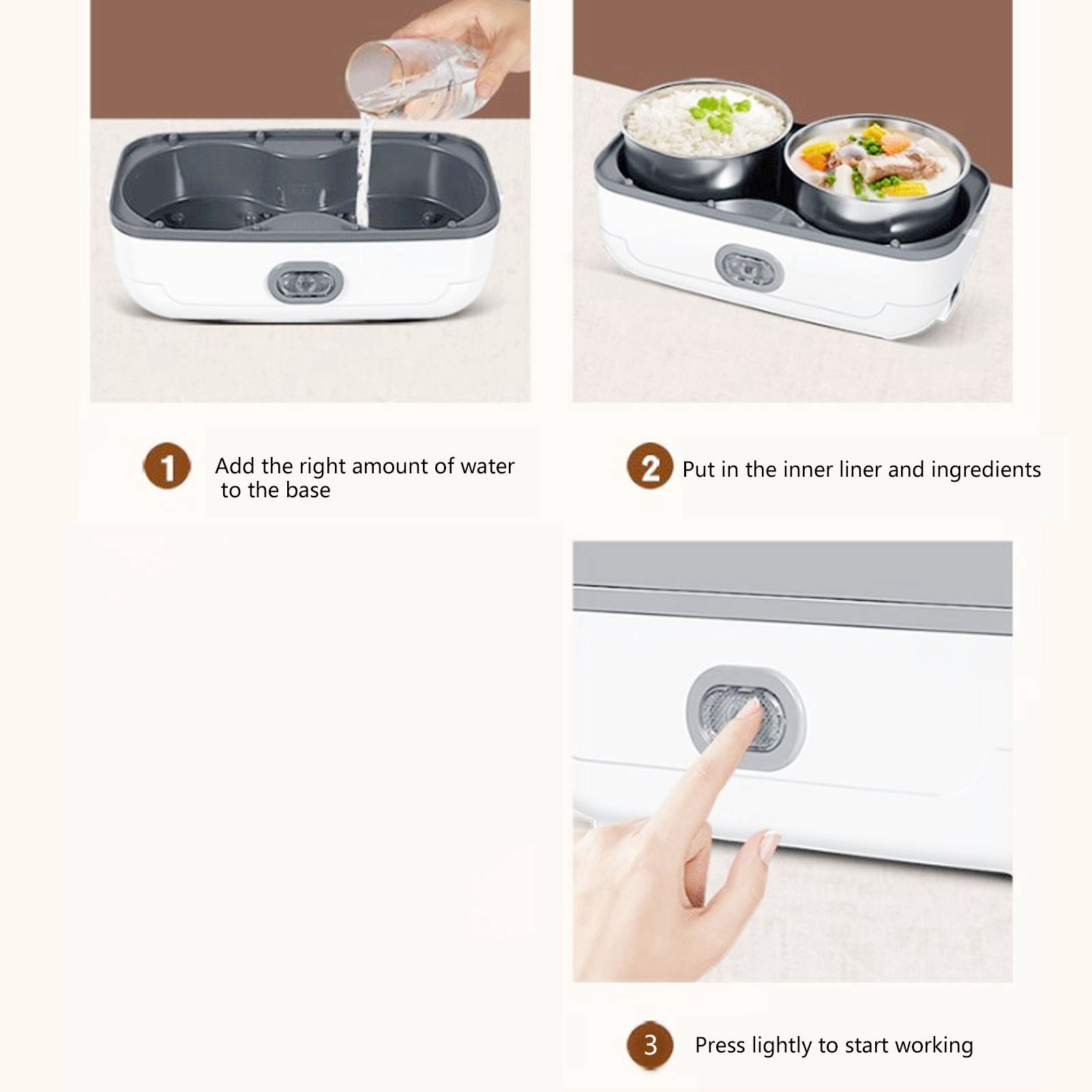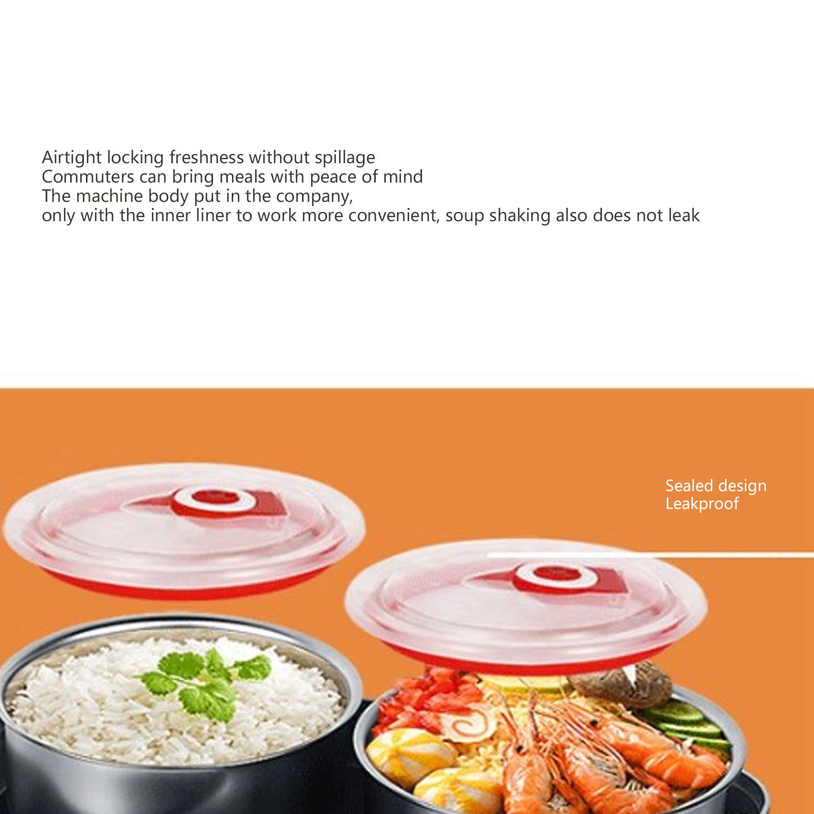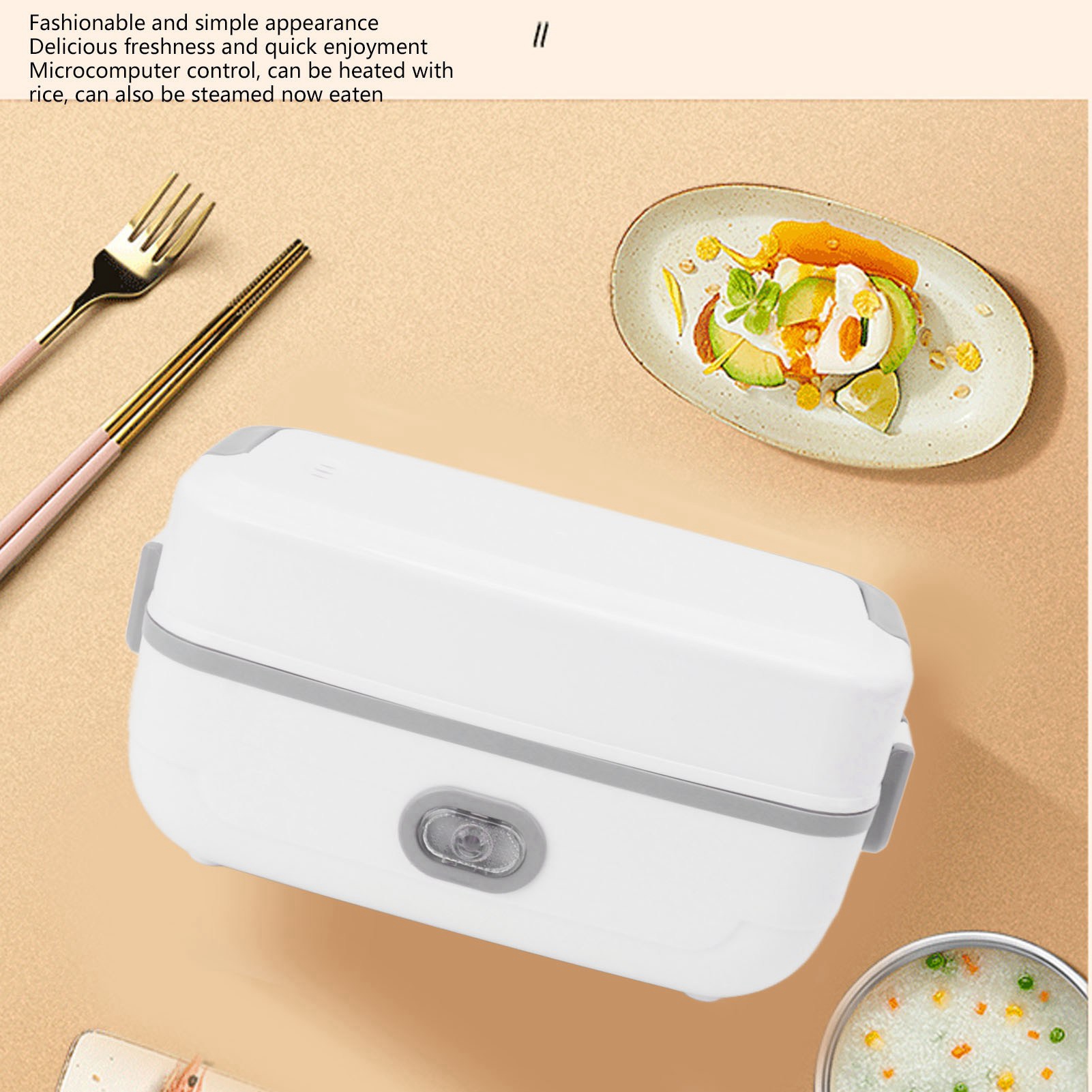 1、Easy to Use: Plug in the electric lunch box 20 to 40 minutes before your meal to heat it up and you can enjoy hot homemade food in the office or anywhere else you don't have a kitchen. 2、Easy to Clean: The electric lunch box comes with a 304 stainless steel container and inner lid, dishwasher safe and easy to clean. 3、Excellent Seal: The electric lunch box lid is fitted with a leak proof gasket to provide a better seal and prevent liquid food from spilling out when it is bumped around. 4、Multifunctional: The electric lunch box is capable of steaming, boiling, stewing and everything in between, raw rice can be cooked to maturity and heated at the touch of a button to keep it fresh without fear of letting it cool. 5、Anti Dry Burn Protection: The electric lunch box has anti dry burn safety protection to give you peace of mind, during the steaming process, the lack of water automatically stops working to ensure safe use.