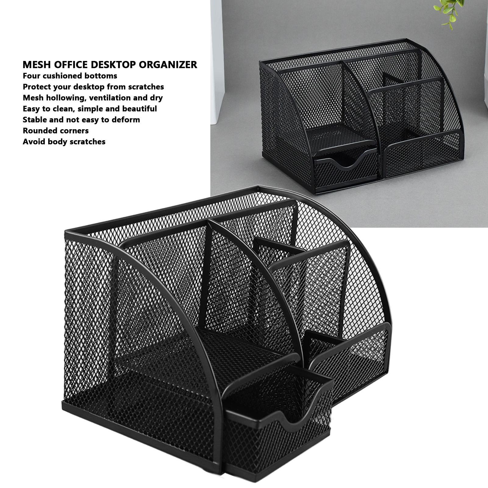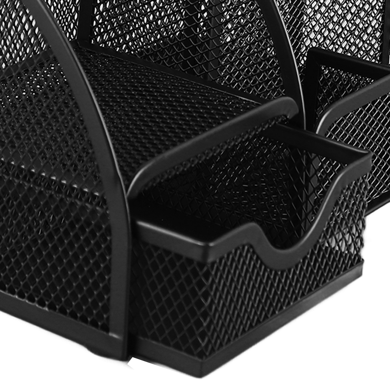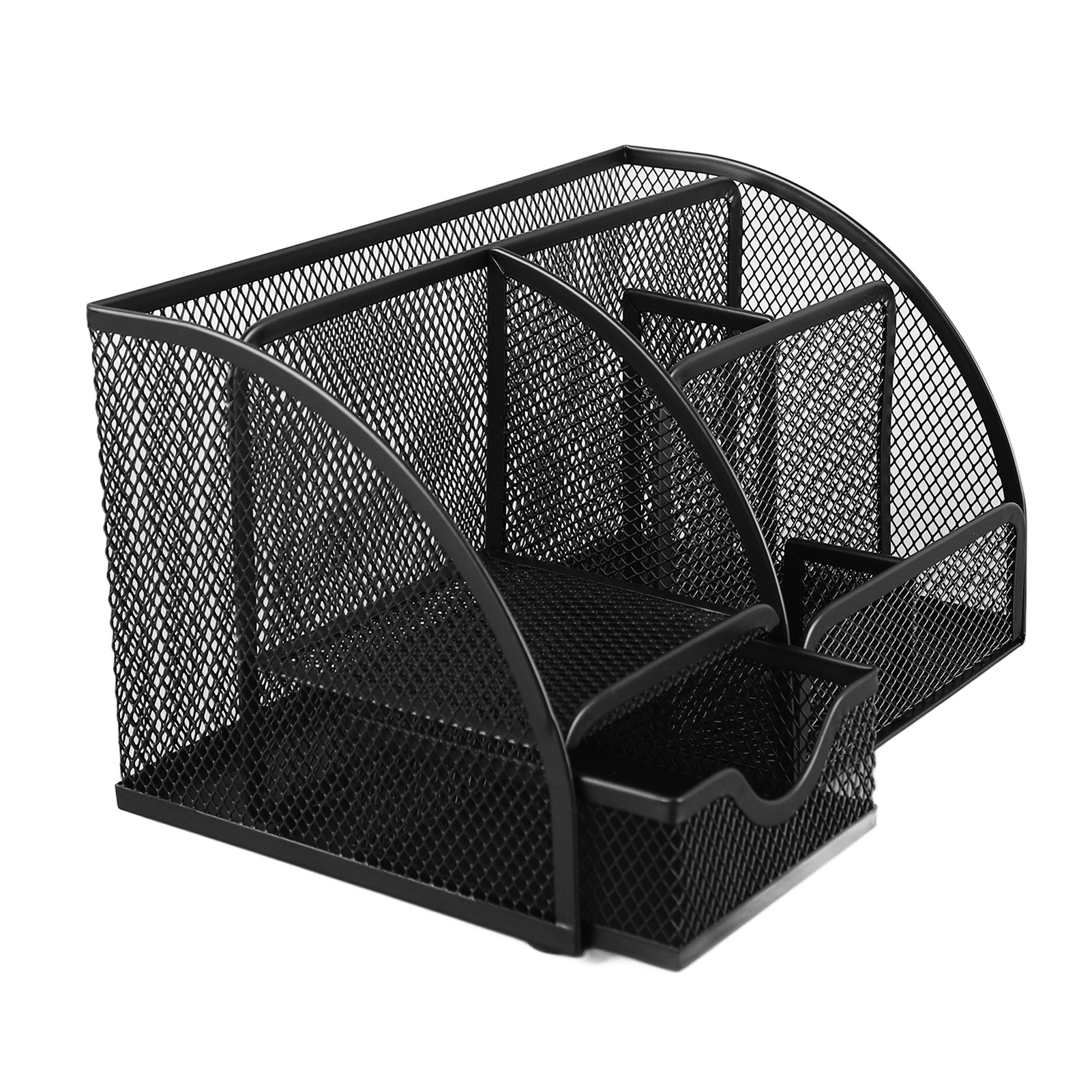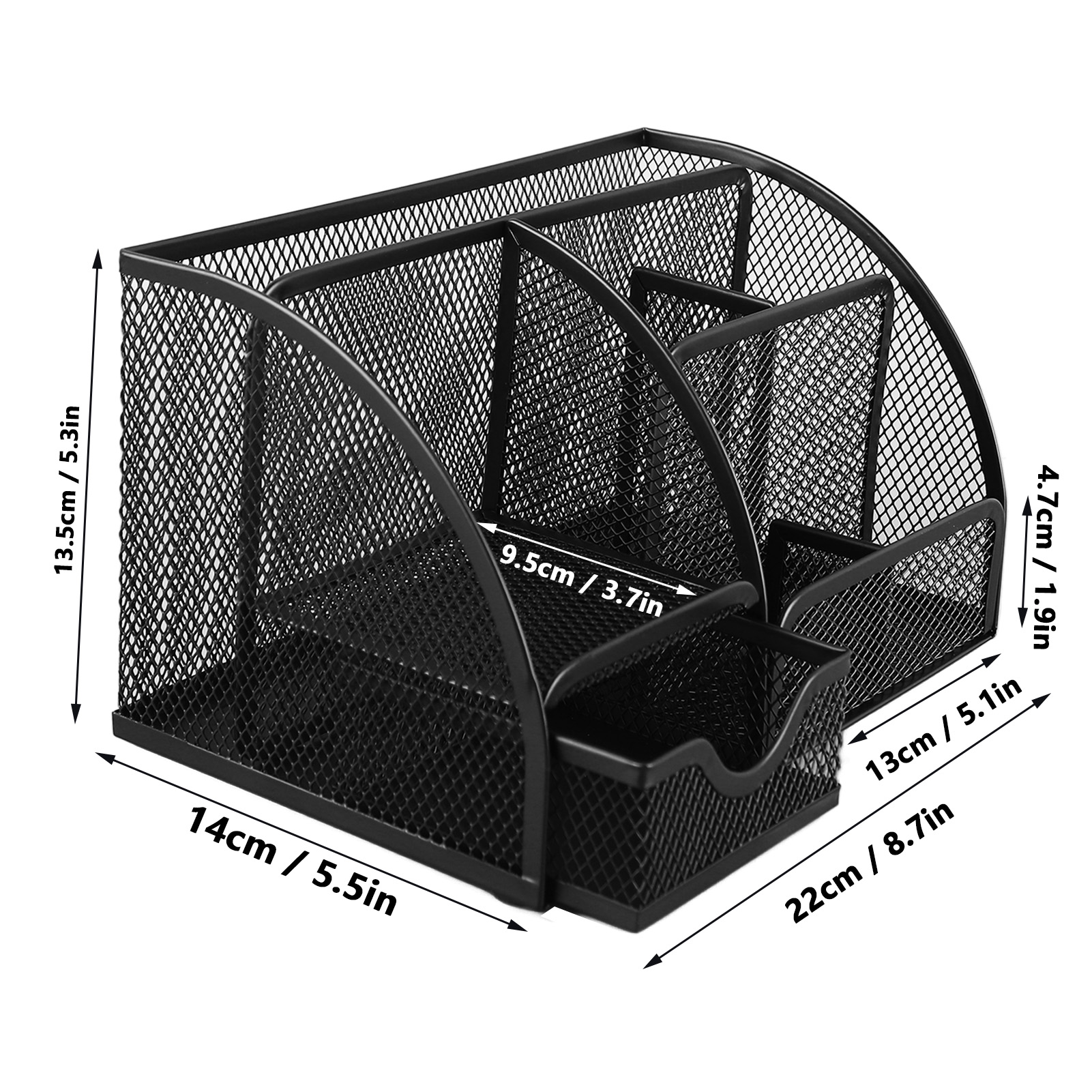 1、SPACE SAVING DESIGN: This desktop organizer is great for storing pens, pencils, markers, erasers, rulers, scissors, paper clips, thumb studs, rubber bands, tape, sticky notes, cards, and gadgets 2、DURABLE AND SMOOTH: The desk storage rack is made of sturdy mesh metal with a sturdy base. The smooth ABS coating and rounded edges make it extremely attractive 3、NON SLIP BASE: The office supply tray has four cushioned bottoms to protect your desktop from scratches 4、BEAUTIFUL WITHOUT DEFORMATION: Mesh office desktop organizer has mesh hollowing, ventilation and dry, easy to clean, simple and beautiful, stable and not easy to deform 5、ROUNDED CORNERS: 7 compartments office pen holder use rounded corners to avoid body scratches and durable