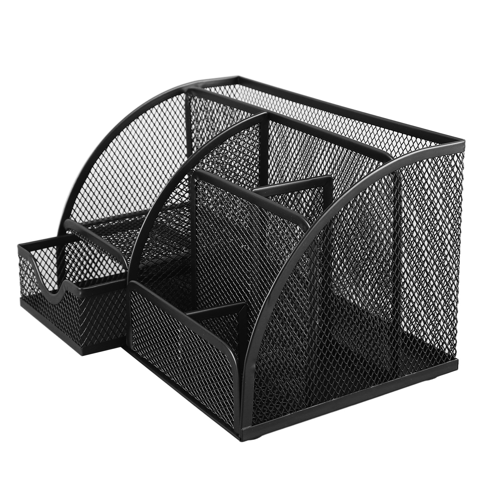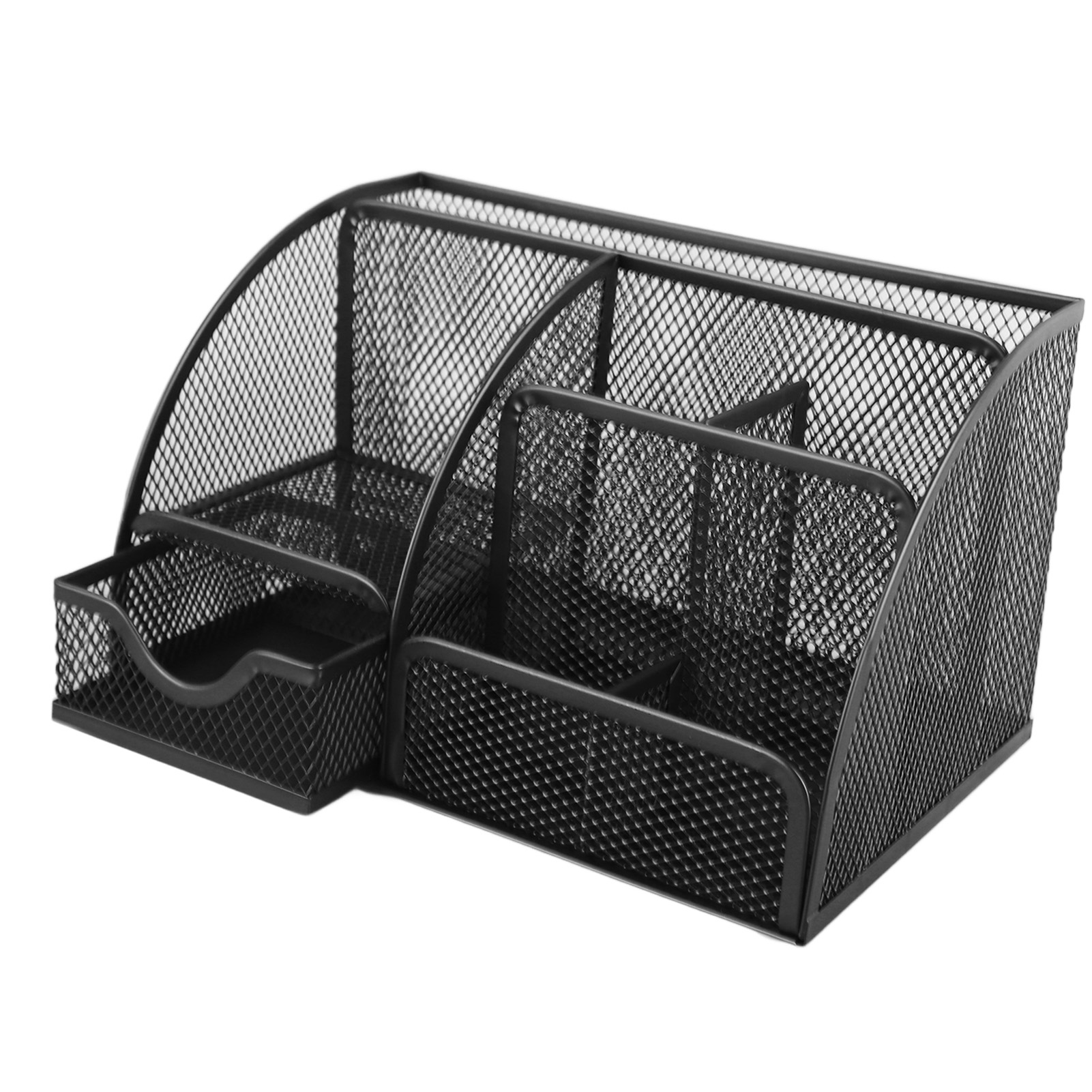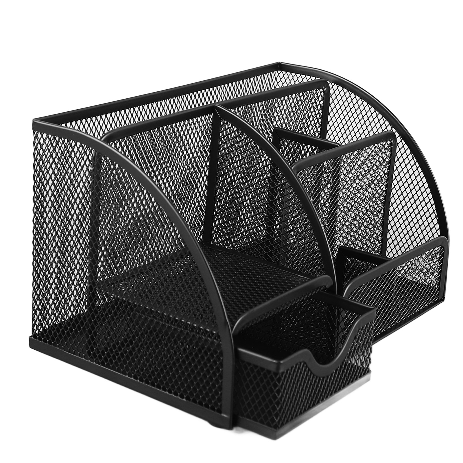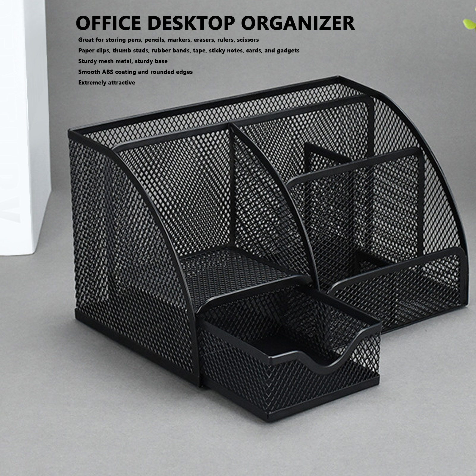 1、SPACE SAVING DESIGN: This desktop organizer is great for storing pens, pencils, markers, erasers, rulers, scissors, paper clips, thumb studs, rubber bands, tape, sticky notes, cards, and gadgets 2、DURABLE AND SMOOTH: The desk storage rack is made of sturdy mesh metal with a sturdy base. The smooth ABS coating and rounded edges make it extremely attractive 3、NON SLIP BASE: The office supply tray has four cushioned bottoms to protect your desktop from scratches 4、BEAUTIFUL WITHOUT DEFORMATION: Mesh office desktop organizer has mesh hollowing, ventilation and dry, easy to clean, simple and beautiful, stable and not easy to deform 5、ROUNDED CORNERS: 7 compartments office pen holder use rounded corners to avoid body scratches and durable