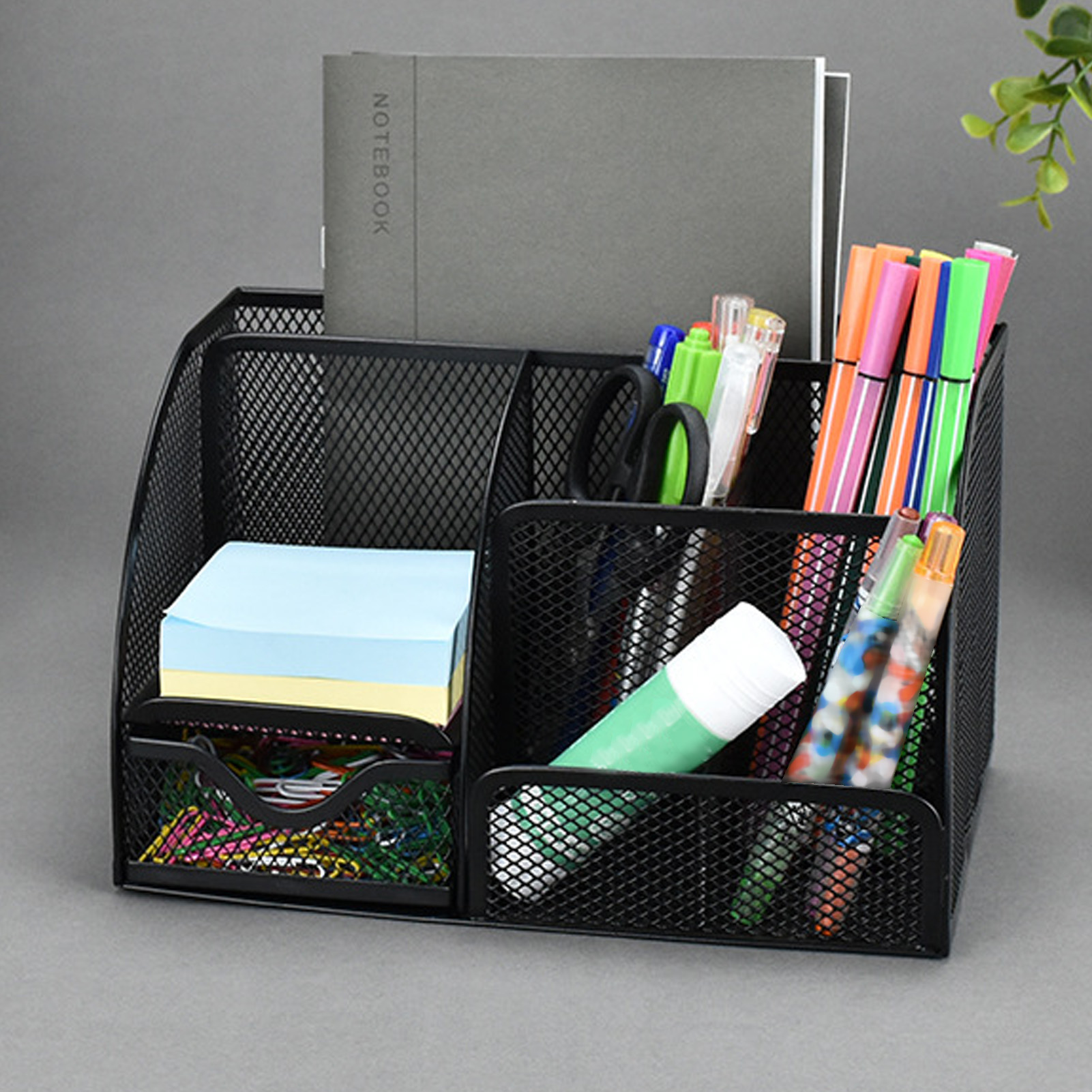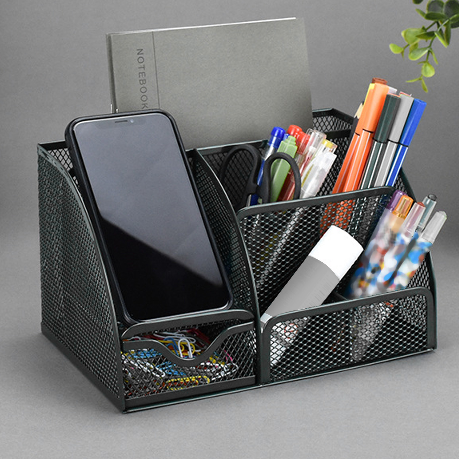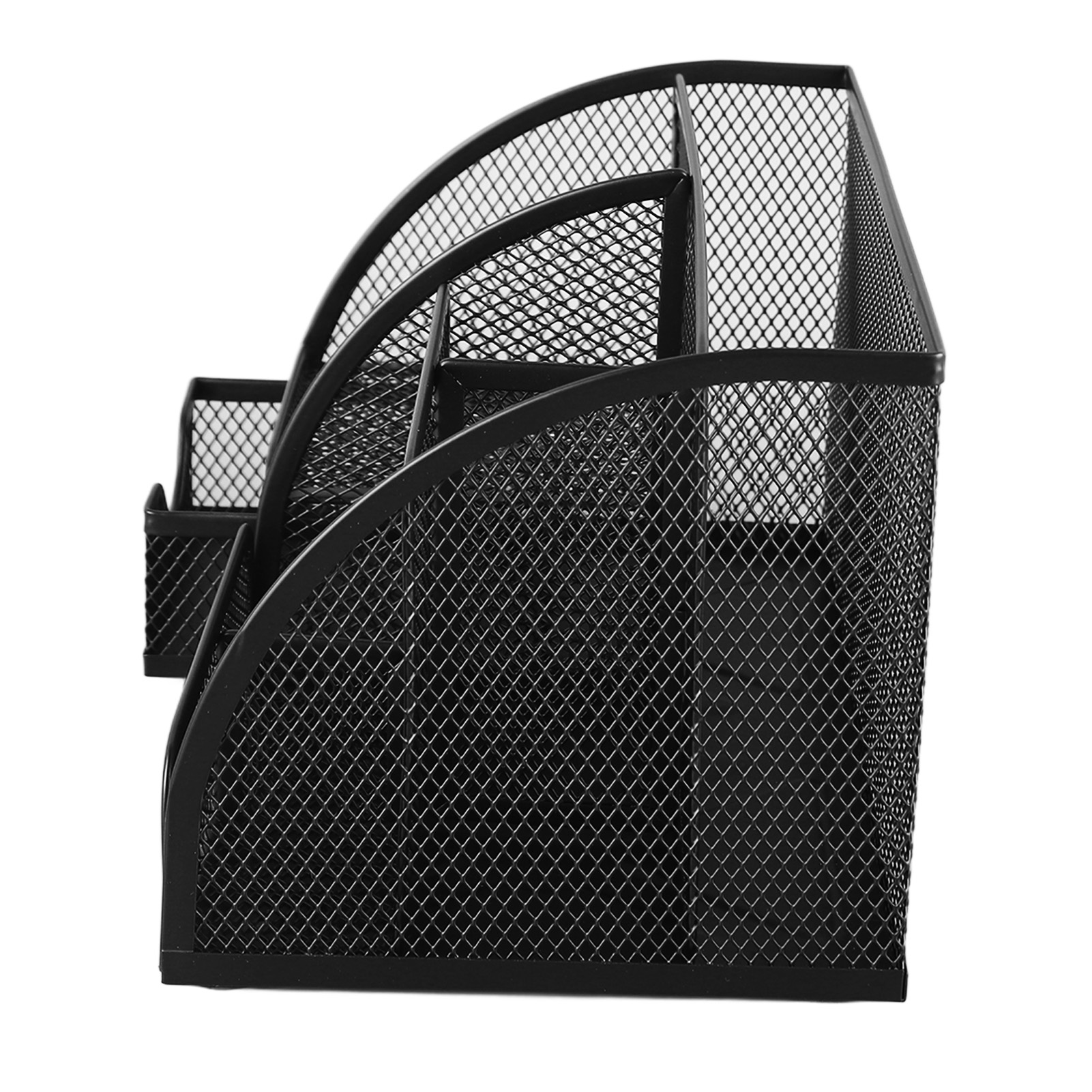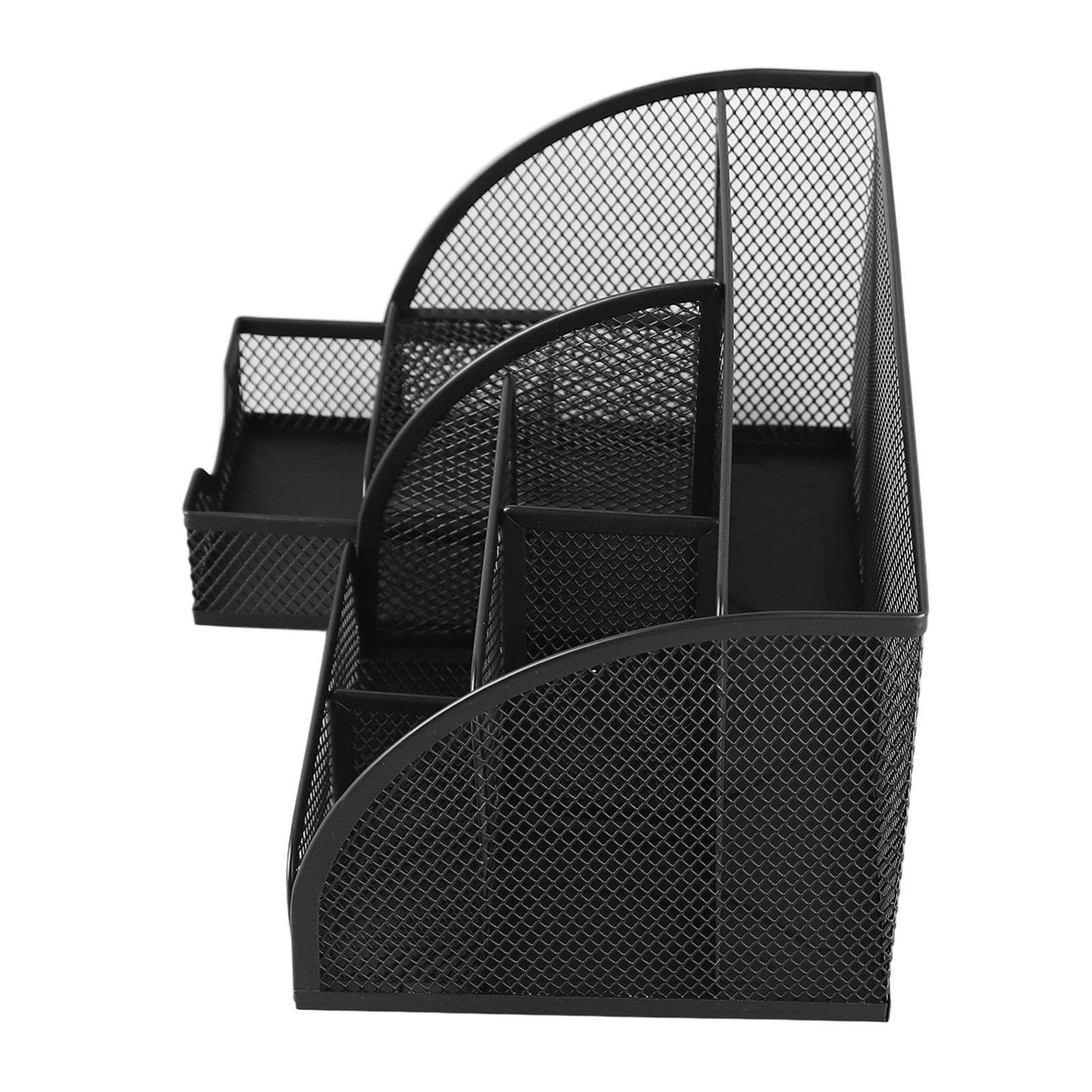 1、SPACE SAVING DESIGN: This desktop organizer is great for storing pens, pencils, markers, erasers, rulers, scissors, paper clips, thumb studs, rubber bands, tape, sticky notes, cards, and gadgets 2、DURABLE AND SMOOTH: The desk storage rack is made of sturdy mesh metal with a sturdy base. The smooth ABS coating and rounded edges make it extremely attractive 3、NON SLIP BASE: The office supply tray has four cushioned bottoms to protect your desktop from scratches 4、BEAUTIFUL WITHOUT DEFORMATION: Mesh office desktop organizer has mesh hollowing, ventilation and dry, easy to clean, simple and beautiful, stable and not easy to deform 5、ROUNDED CORNERS: 7 compartments office pen holder use rounded corners to avoid body scratches and durable
