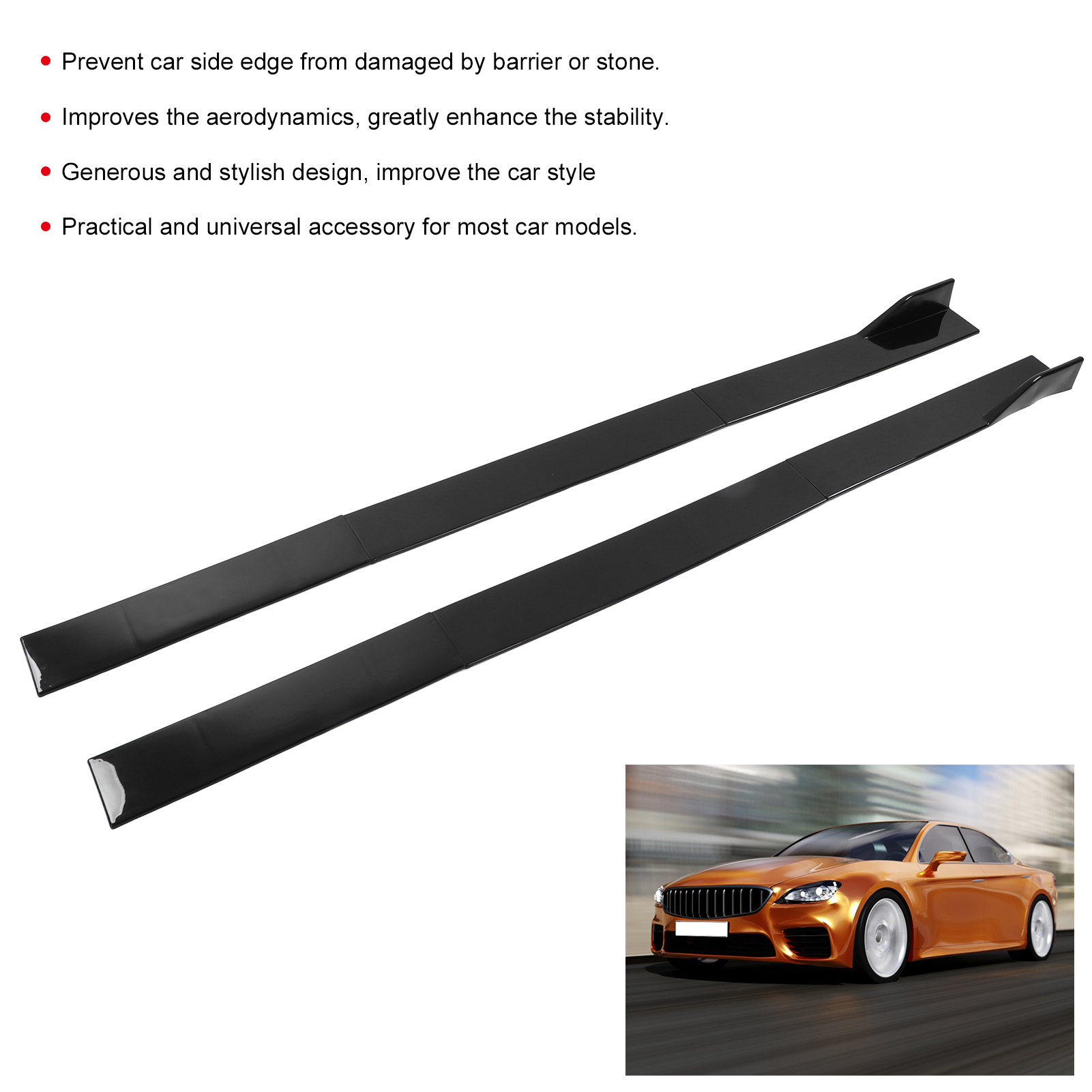 1、Effective Protection: Side skirts offer effective protection, prevent car side edge from damaged by barrier or stone. 2、Aerodynamic Design: Side rocker splitters improves the aerodynamics of your vehicle, greatly enhance the stability. 3、Durable Material: Made from high quality ABS material, rugged and durable, not easy to crack. 4、Stylish Appearance: Generous and stylish design, improve the car style, and upgrade the exterior look. 5、Wide Applications: Winglet diffusers are practical and universal accessory for most car models.