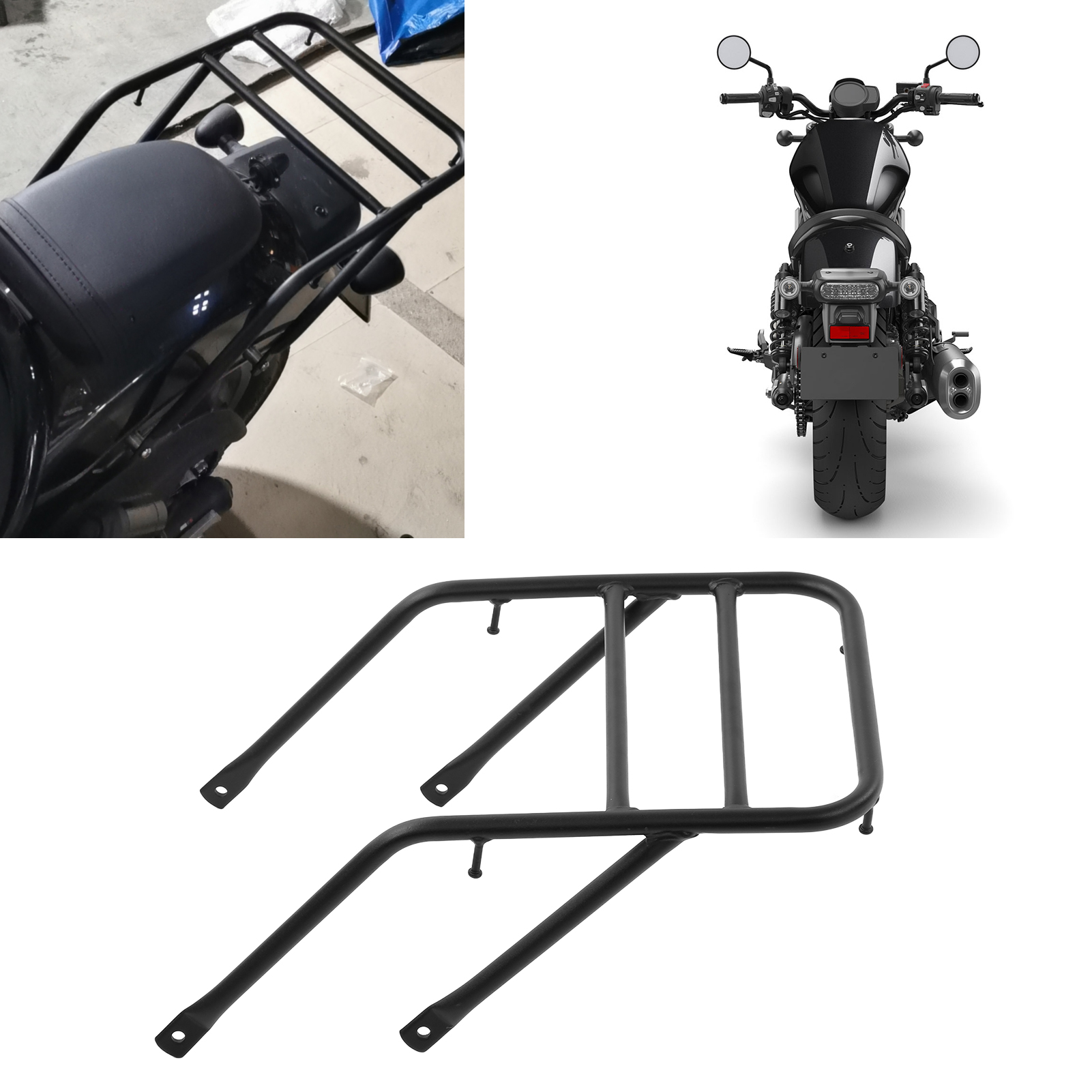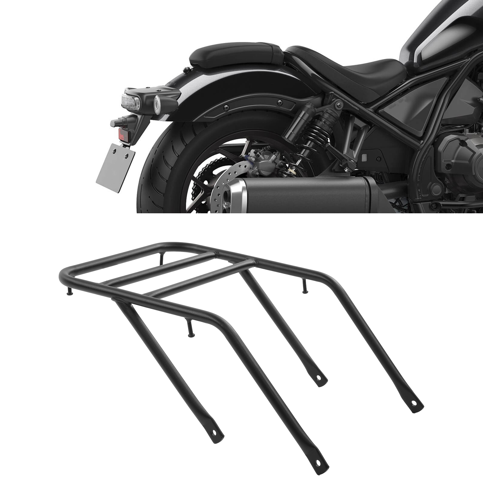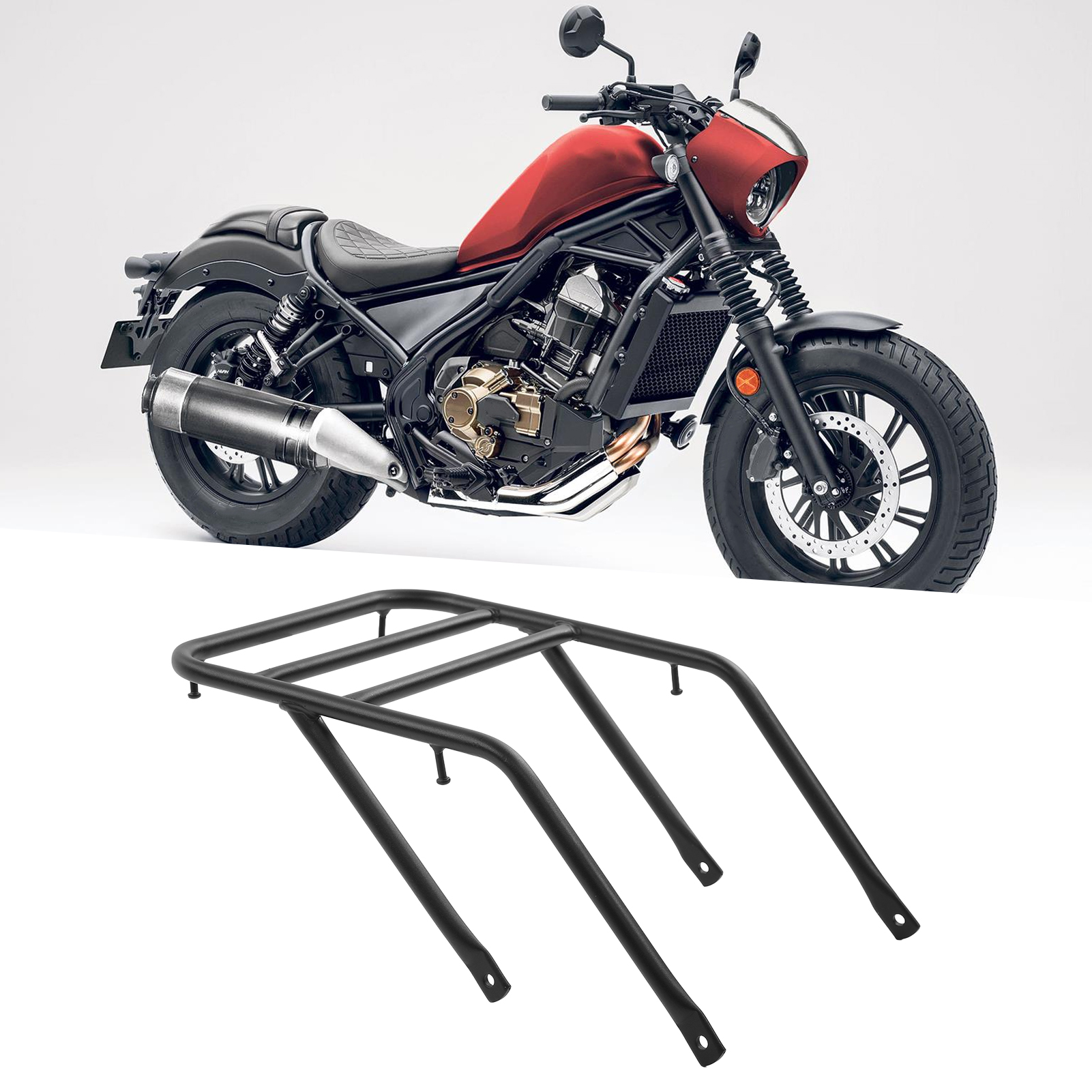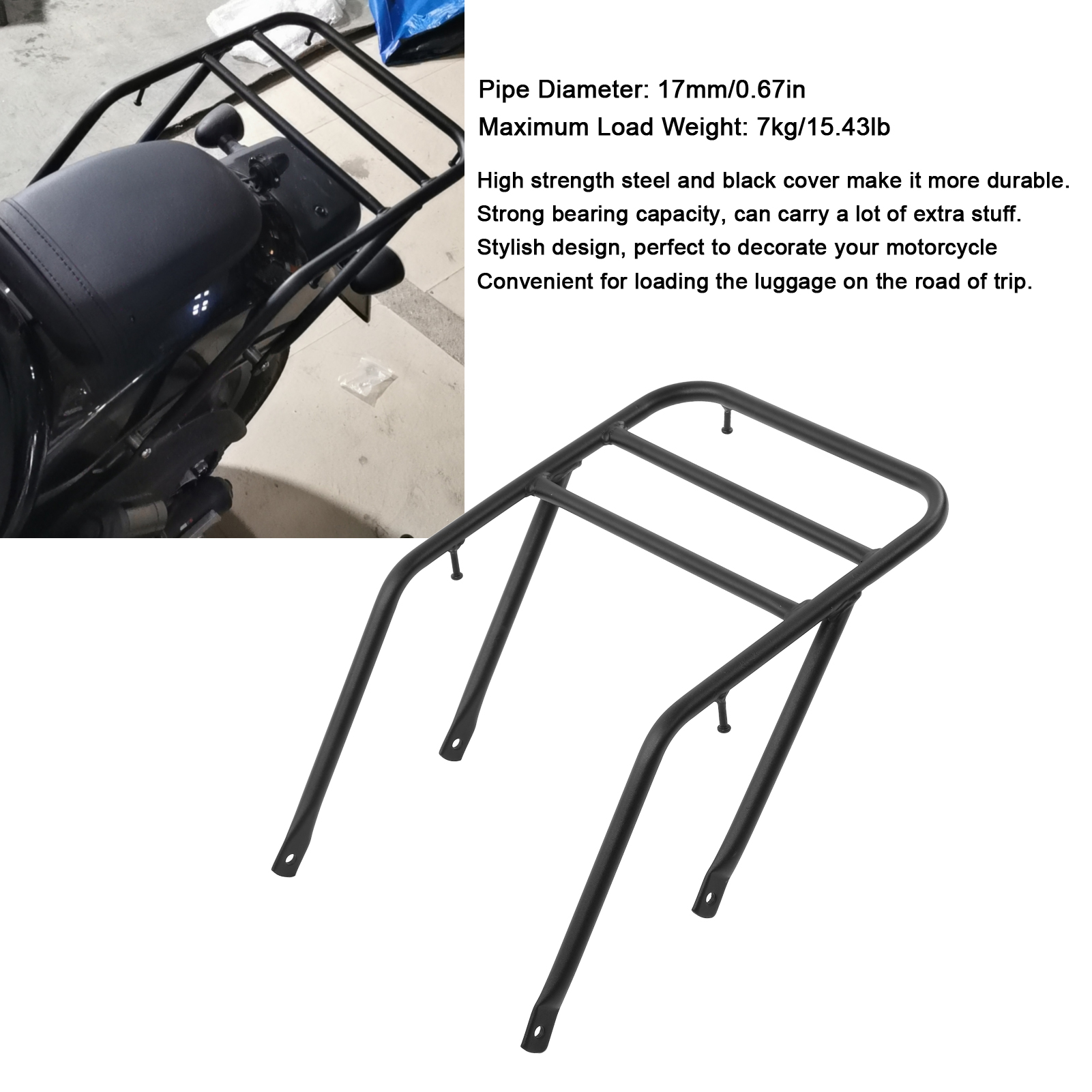 1、Applicable Model: Motorcycle rear luggage cargo carrier, replacement for Rebel 1100/DCT 2021‑2022. Quick installation and removal, no drilling required. 2、Dimensions: Pipe diameter is about 17mm/0.67in, and maximum load weight is about 7kg/15.43lb. The ability to withstand heavy objects is strong and will not break easily. 3、Premium Material: High strength steel and black cover make it more durable. Strong bearing capacity, can carry a lot of extra stuff. 4、Stylish Decoration: Stylish design, perfect to decorate your motorcycle. Waterproof and high performance design, please buy it with your confidence. 5、Strong Practicability: Great for carrying the motorcycle trunk during outside or travelling. Convenient for loading the luggage on the road of trip.