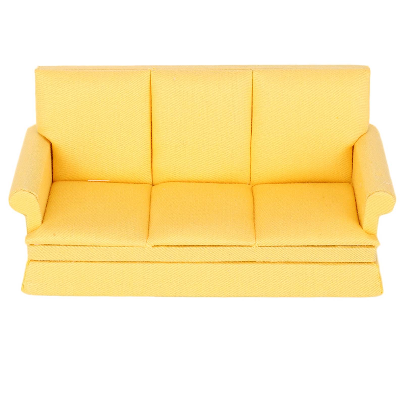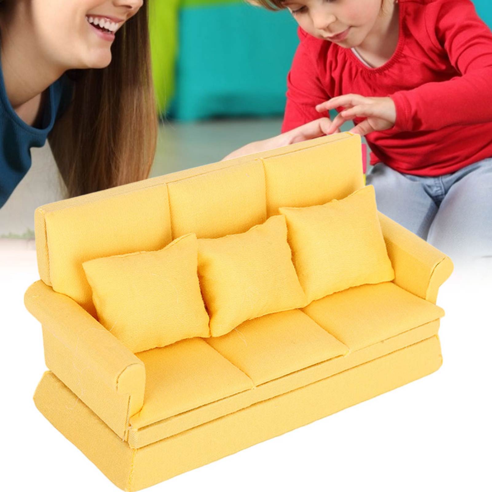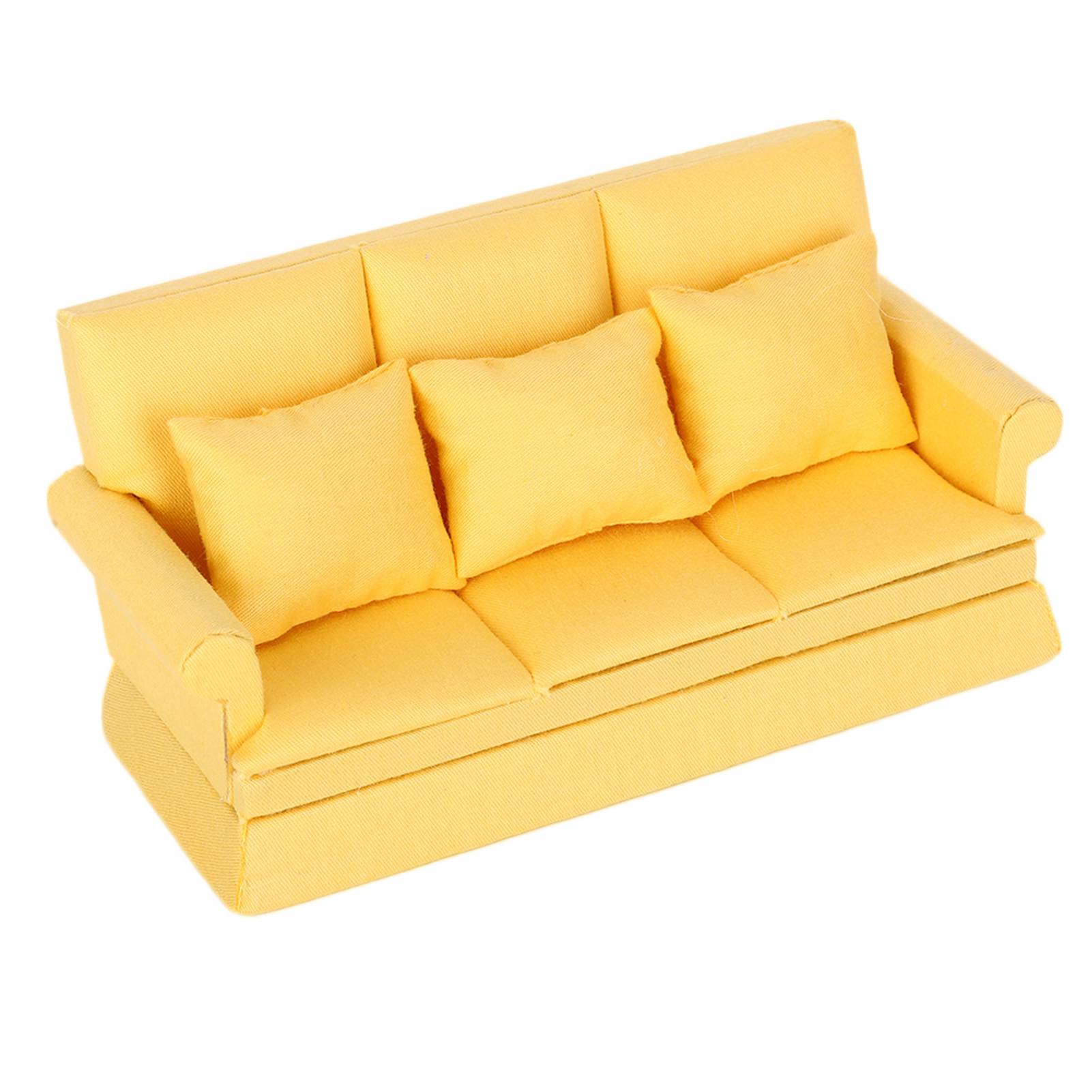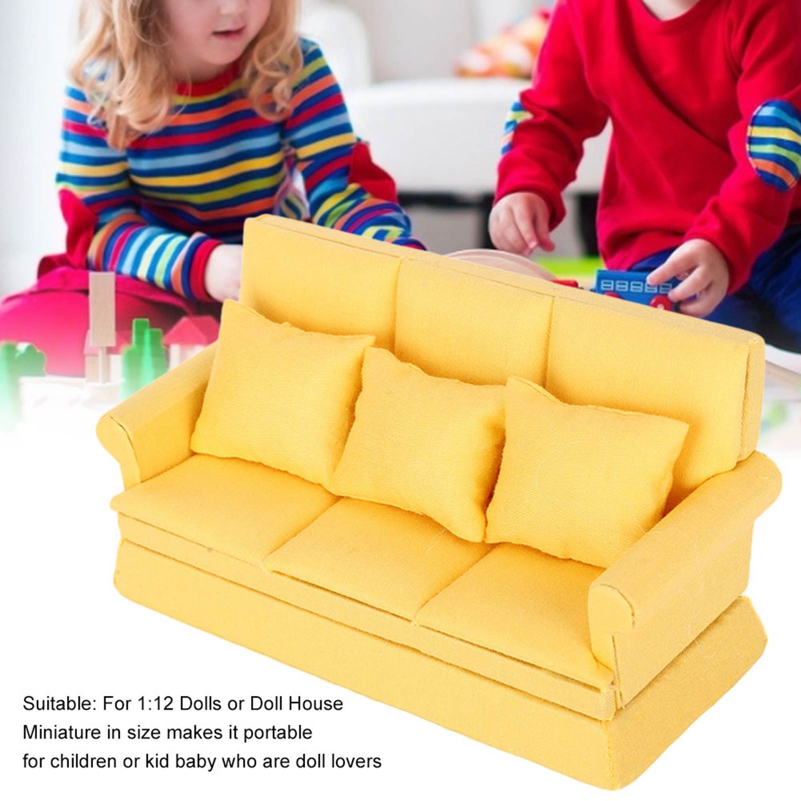 1:12 Doll House Mini Sofa with 3pcs Pillow Living Room Furniture Wooden Doll House Decoration AccessoriesYellow