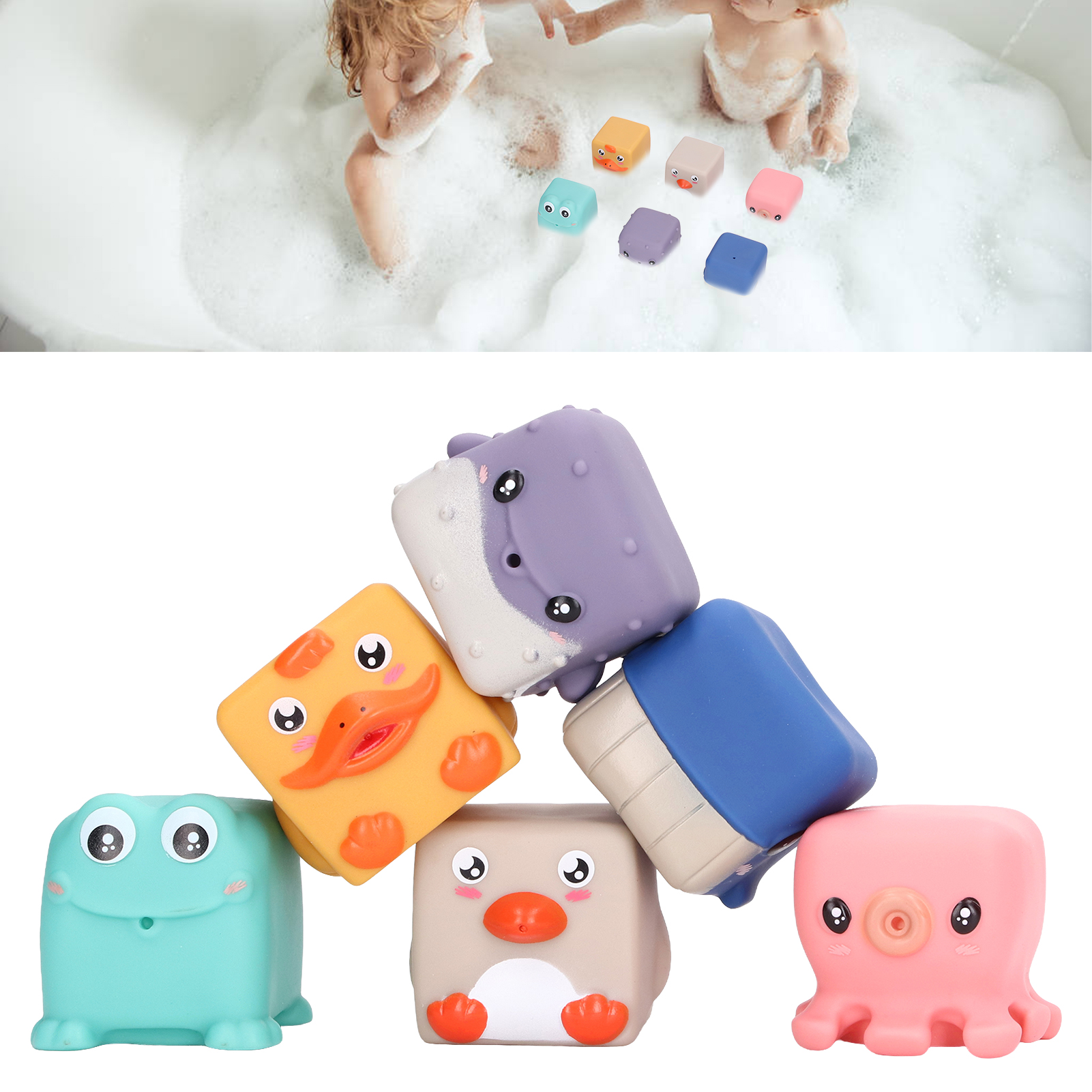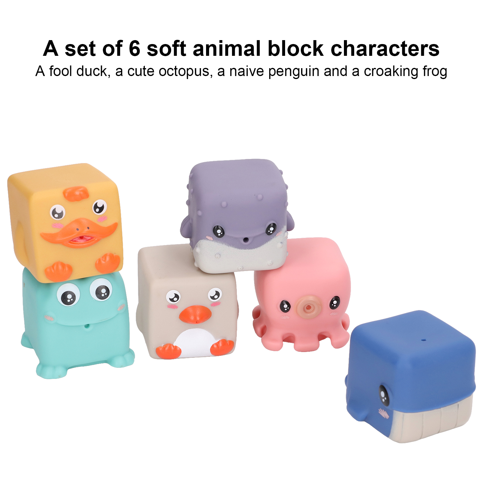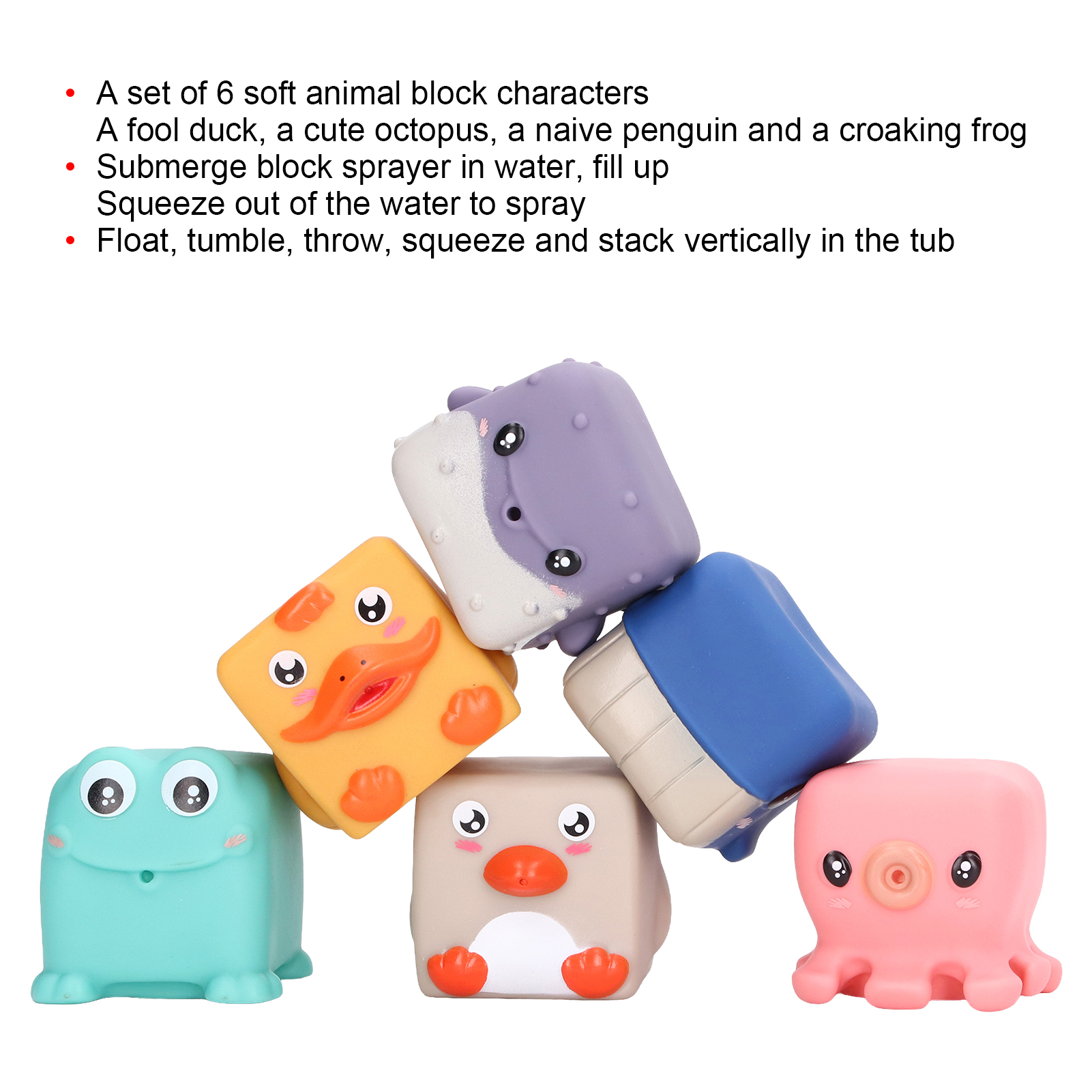 1、6 ANIMAL BLOCK CHARACTERS: A set of 6 soft animal block characters including a fool duck, a cute octopus, a naive penguin and a croaking frog 2、SUBMERGE, FILL UP AND SQUEEZE: Submerge the block sprayer in water, fill up, and squeeze out of the water to spray, easy to operate 3、VERSATILE AND INTERESTING: Bath squirters can float, tumble, throw, squeeze and stack vertically in the tub, very interesting 4、PERFECT GIFT: Made of soft PVC, safe for kids, perfect for kids Easter party favors, egg fillers, Easter basket stuffers, pinata fillers 5、EASY TO GRASP AND SQUEEZE: Compact size makes the squeeze water toys easy for little hands to grasp and squeeze easily, not easy to tired