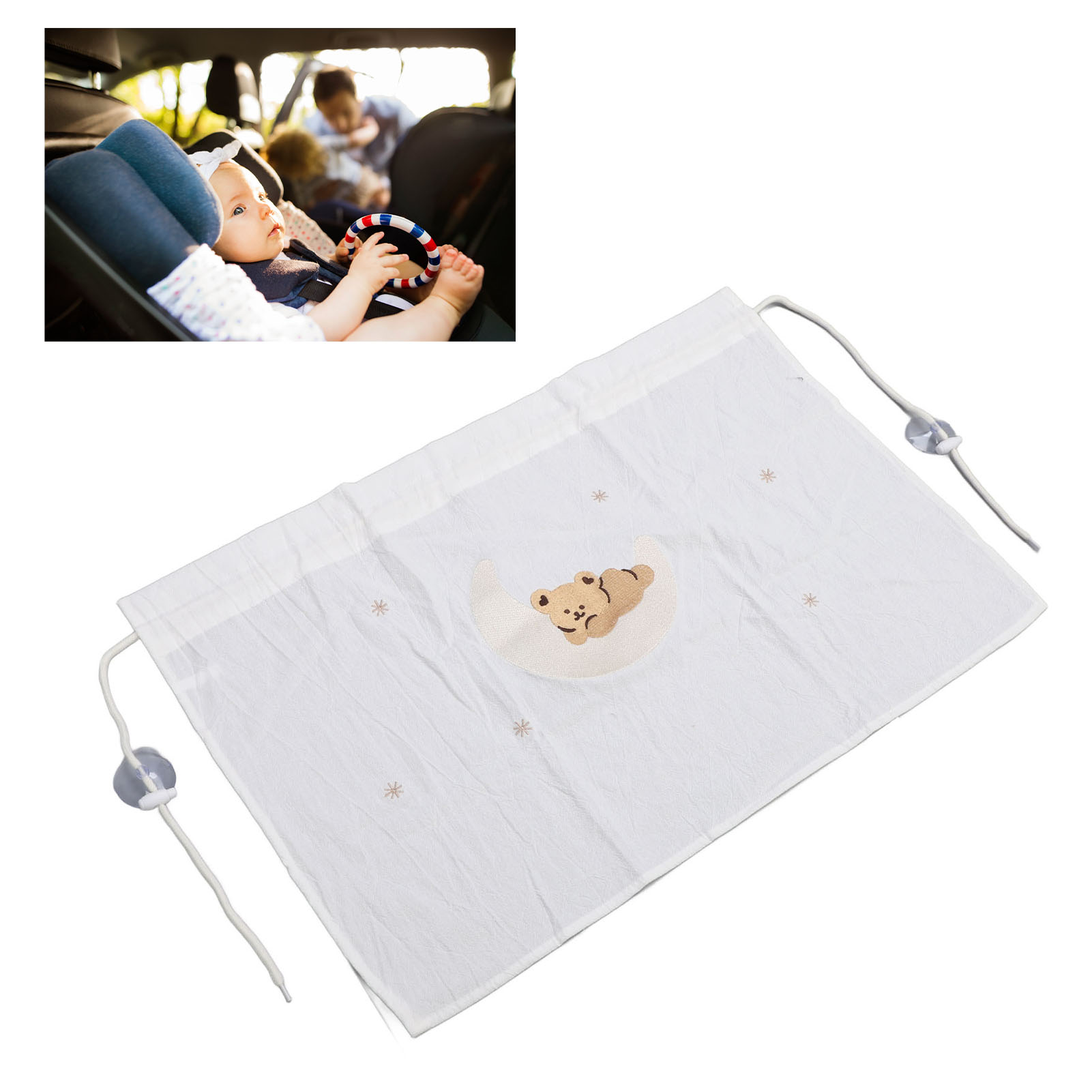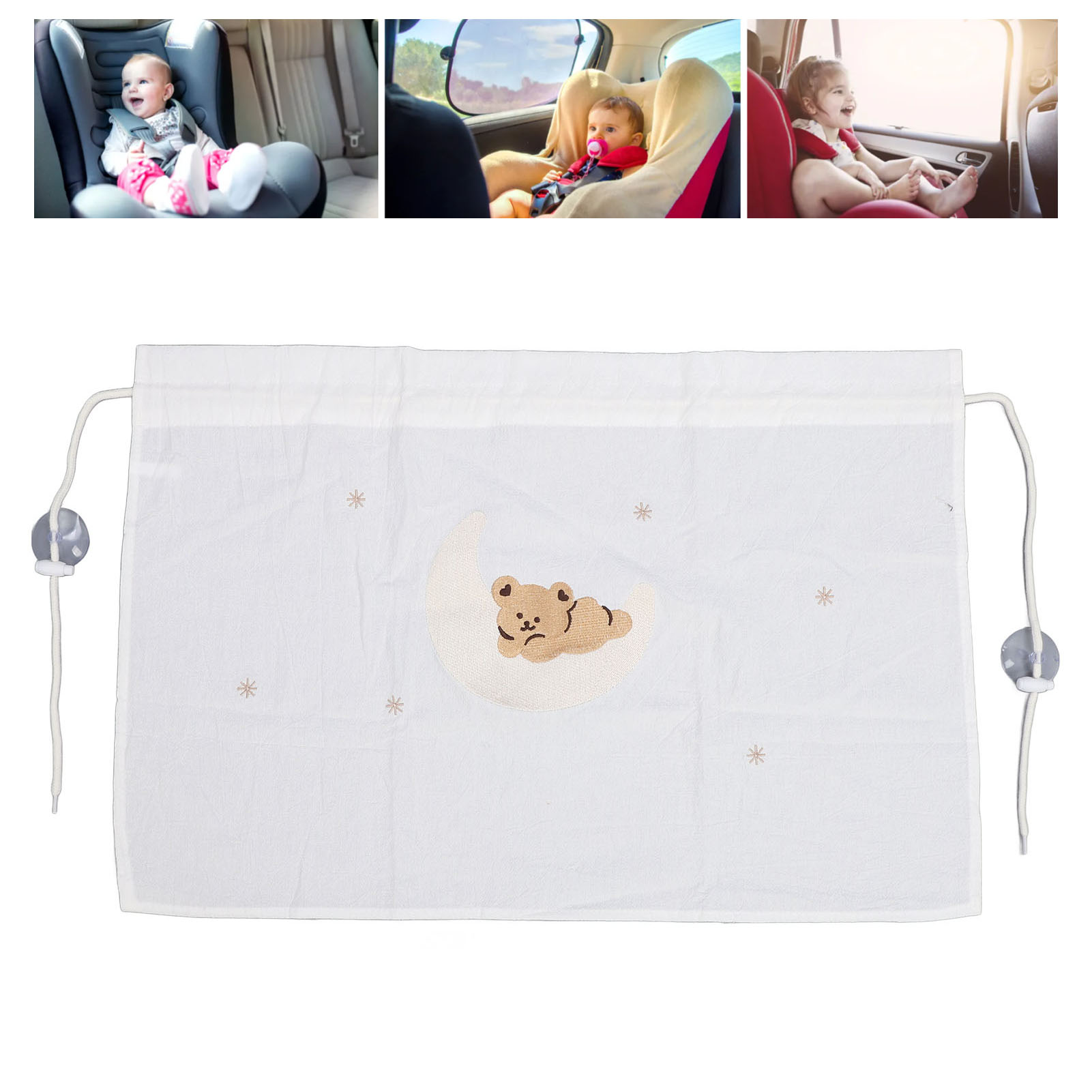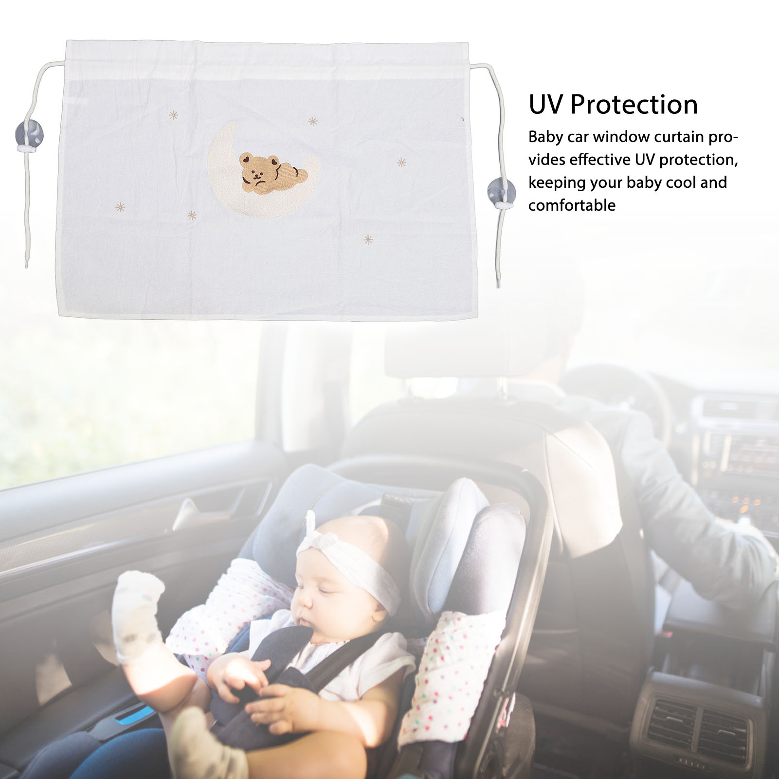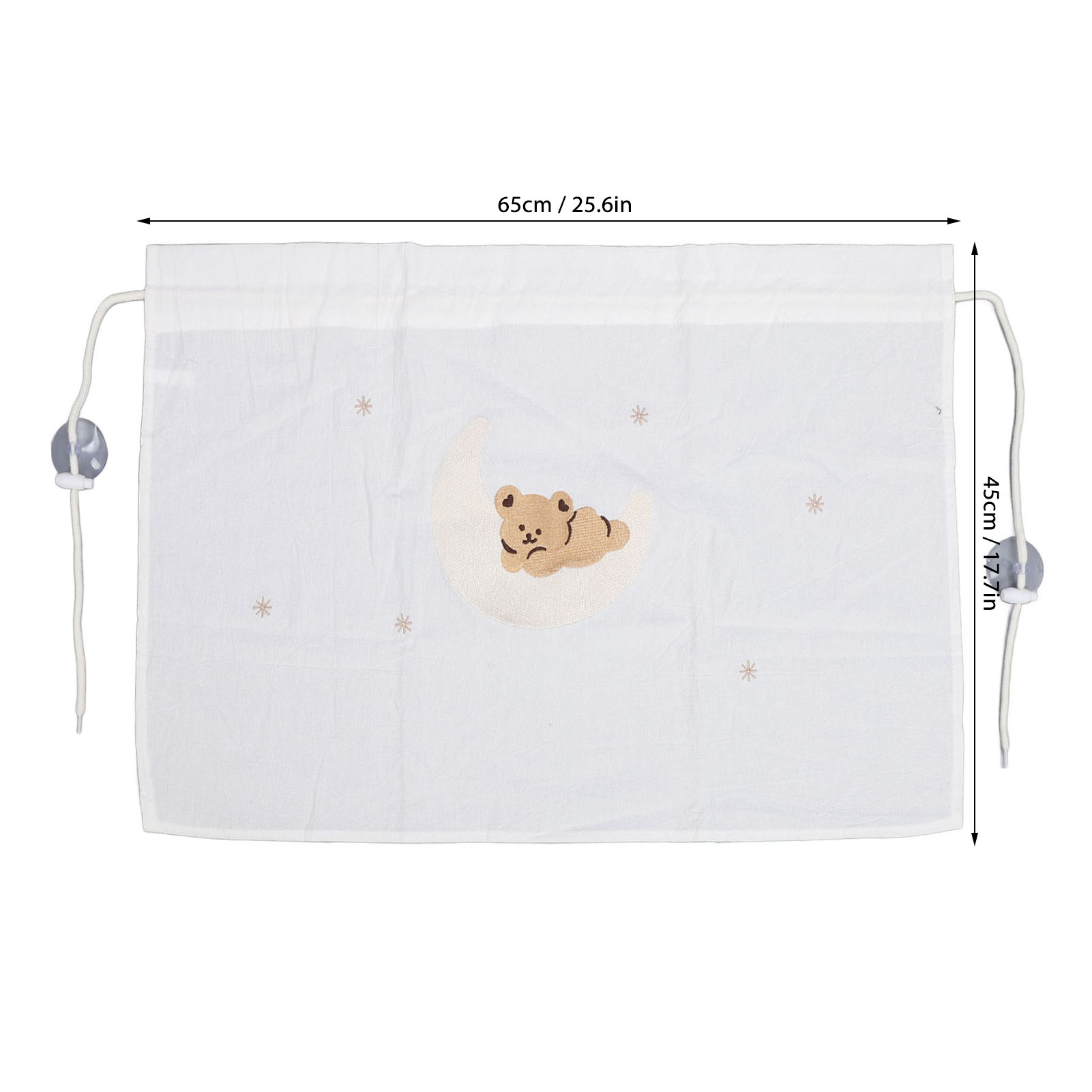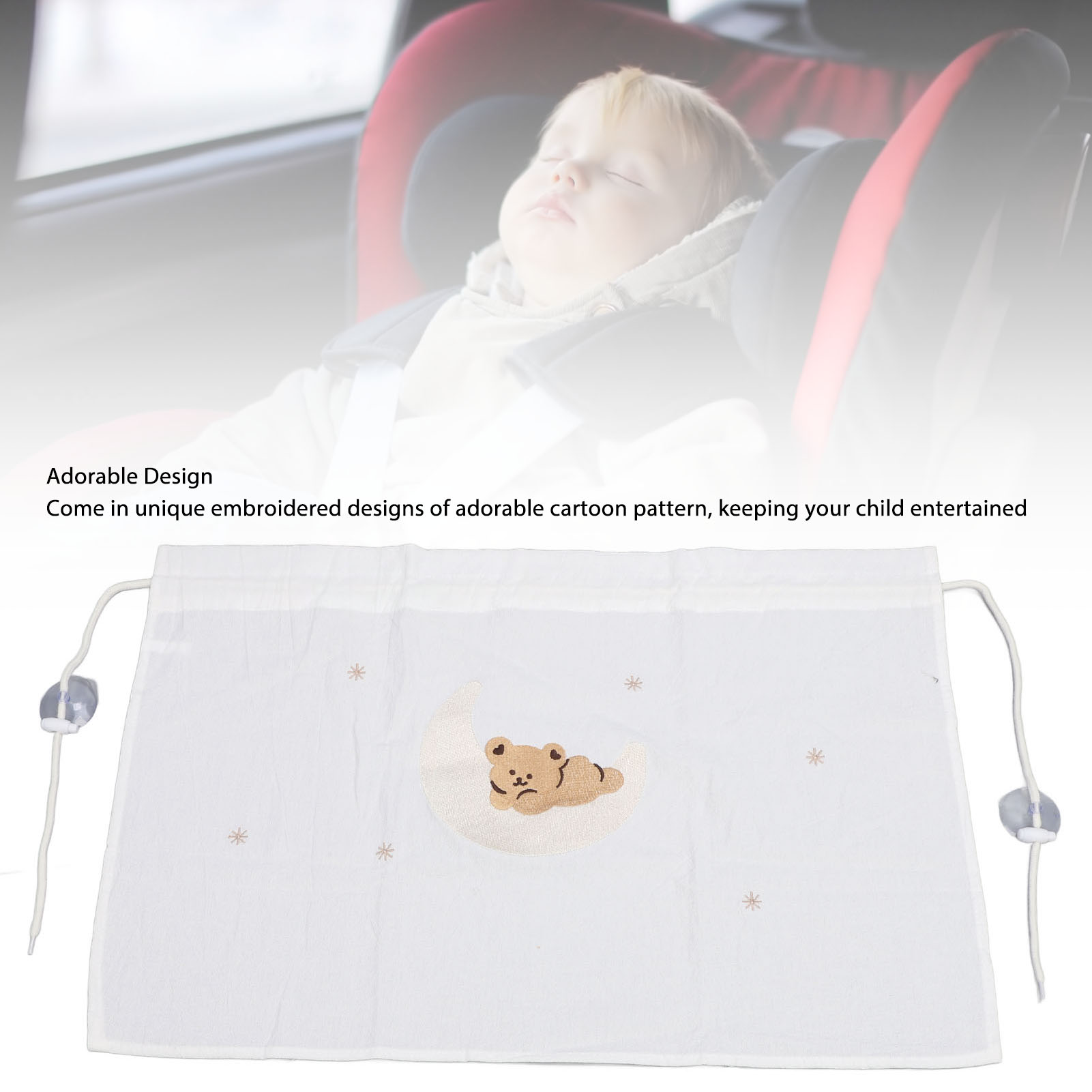 1、EFFECTIVE UV PROTECTION: Baby car window curtain provides effective UV protection, keeping your baby cool and comfortable in the back seat during travel. 2、SUCTION CUPS: Equipped with 2 suction cups, the sunshade curtain can be securely attached to the car window. The suction cups ensure a firm grip for the curtain. 3、CONVENIENT STORAGE: Baby car side window sunshade curtain is easy to store, it can conveniently fit in your bag for quick and easy use anytime, anywhere. 4、ADORABLE DESIGN: Baby car window curtains come in unique embroidered designs of adorable cartoon pattern, adding a vibrant touch to your car while keeping your child entertained. 5、QUALITY MATERIAL: Made from premium cotton fabric, the curtain offers superior breathability, delivering ultimate comfort for your baby even during long trips.