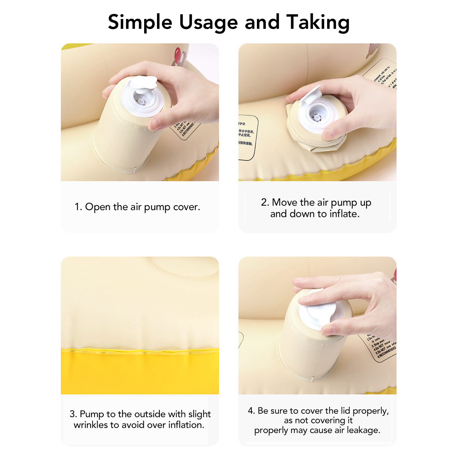 1、Safe for Baby: The baby inflatable seat is durable and can be used for a long time. It is odorless and can be closely contact with baby's skin. 2、Lovely Pattern: The baby inflatable seat uses delicate and cute cartoon pattern and bright color. The pattern is a good decoration, and it can attract baby's attention and stimulate baby's interest. 3、Soft and Protection: The baby inflatable seat can help stabilize baby's back, sides and legs. The support seat uses the ergonomic design to mimic the arm and provides a comfortable and smooth environment for the baby. 4、No More Leakage: The baby inflatable seat has independent bag and leakage proof charging valve. The back can provide double protection for the baby. 5、Simple Usage and Taking: Simply press the built in air pump up and down to inflate the chair easily, no other tools required. It will be smaller after folding and easy to carry, so that the baby can sit down anytime and anywhere.