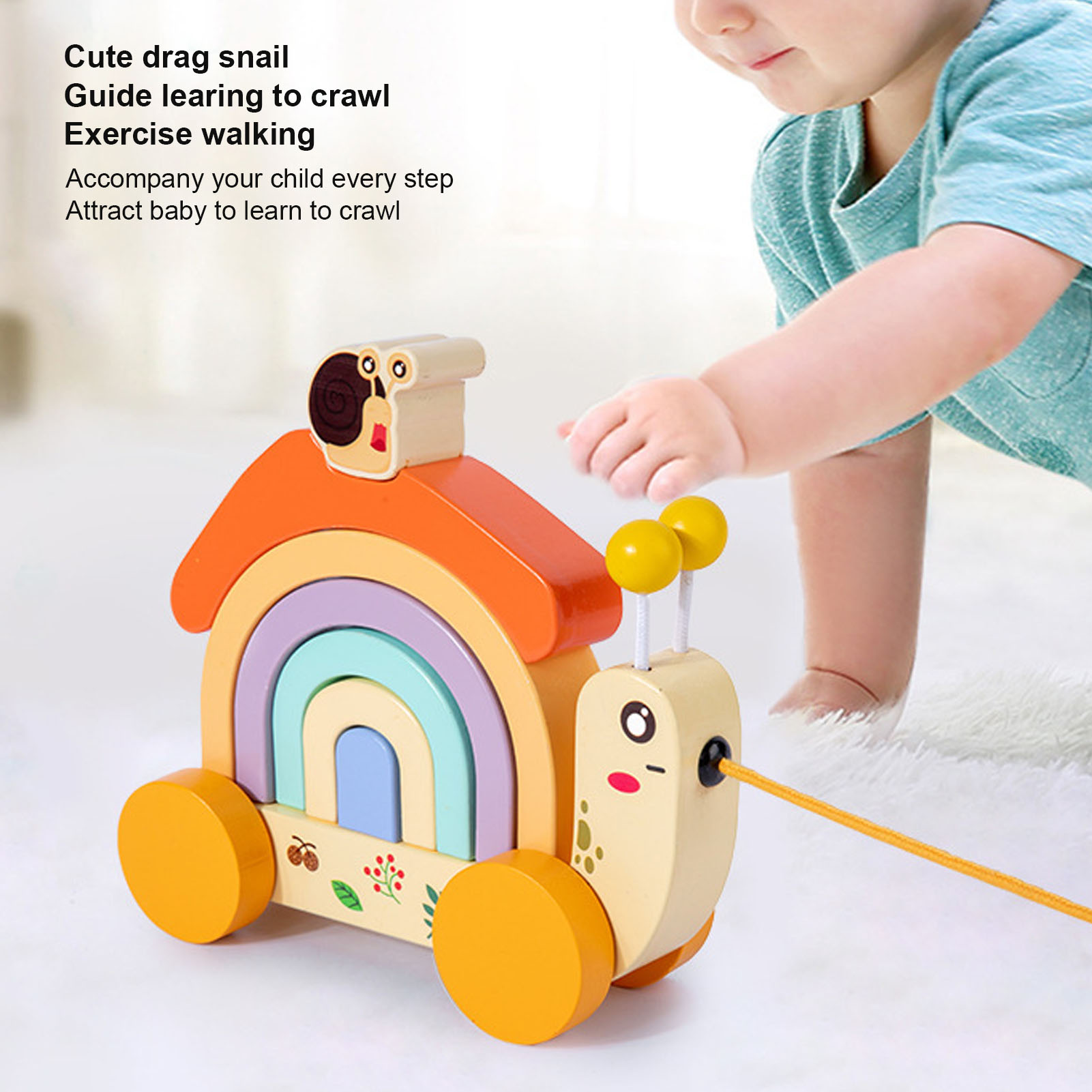 1、Exercise with flexible and small hands, lovely snails trailer guide your baby crawl and exercise walking. 2、For early education and fun, let your baby know colors and shapes when playing, stimulate various perceptions of baby. 3、Little hands string blocks, practice elaborate hand movements, exercise baby's grasp ability, DIY assembly brings new play experience. 4、Macaron color stacking blocks and interesting pileup, exert baby's imagination, assemble a variety of shapes. 5、360° Polished rounded corner without burrs, exquisite craftsmanship, safe and rest assured to play.