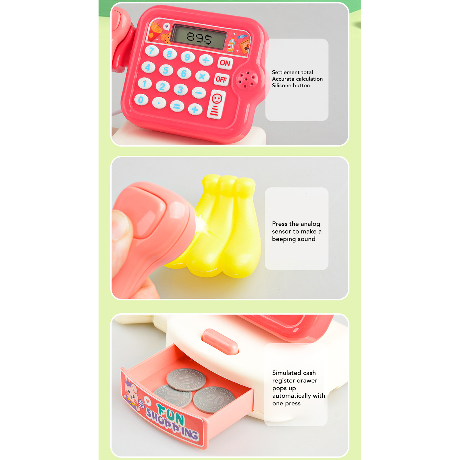 1、Realistic Design: Experience the thrill of shopping with lifelike supermarket cash register toy set, complete with scanning function for an authentic playtime. 2、Role Playing Fun: Encourage social interaction and enhance imaginative play as children engage with friends and family, developing valuable social skills. 3、Learning Through Calculation: With accompanying currency and calculator props, this toy set helps children learn basic mathematics and develop problem solving abilities. 4、Fine Craftsmanship: Featuring an adorable unique design with vibrant colors, this toy set captures children attention and adds an feeling of enjoyment to their playtime. 5、Plastic Material: Constructed with eco friendly plastic, calculator cash register toy is odorless, and ensures a safety and reliable playtime for your child.