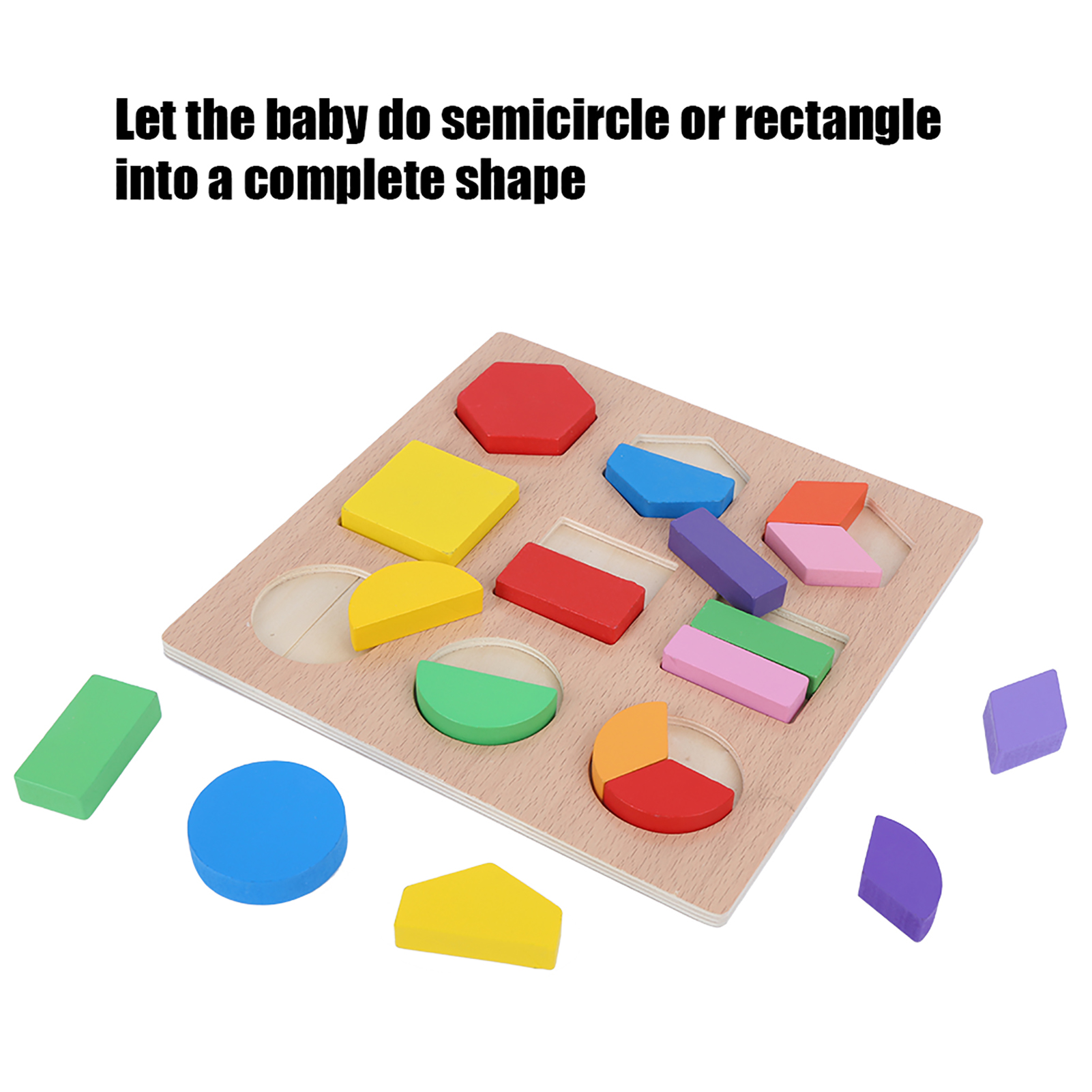 1、Geometric shape board is a kind of infant initiation toy, made of quality wood material. 2、Can teach baby to recognize shape and color correctly, educational toy. 3、Play a variety of ways, let the baby do semicircle or rectangle into a complete shape. 4、Use your hands and your brain. It is both intellectual and fun, designed for children. 5、Special designed for children below 3 years old to play, wonderful gift.
