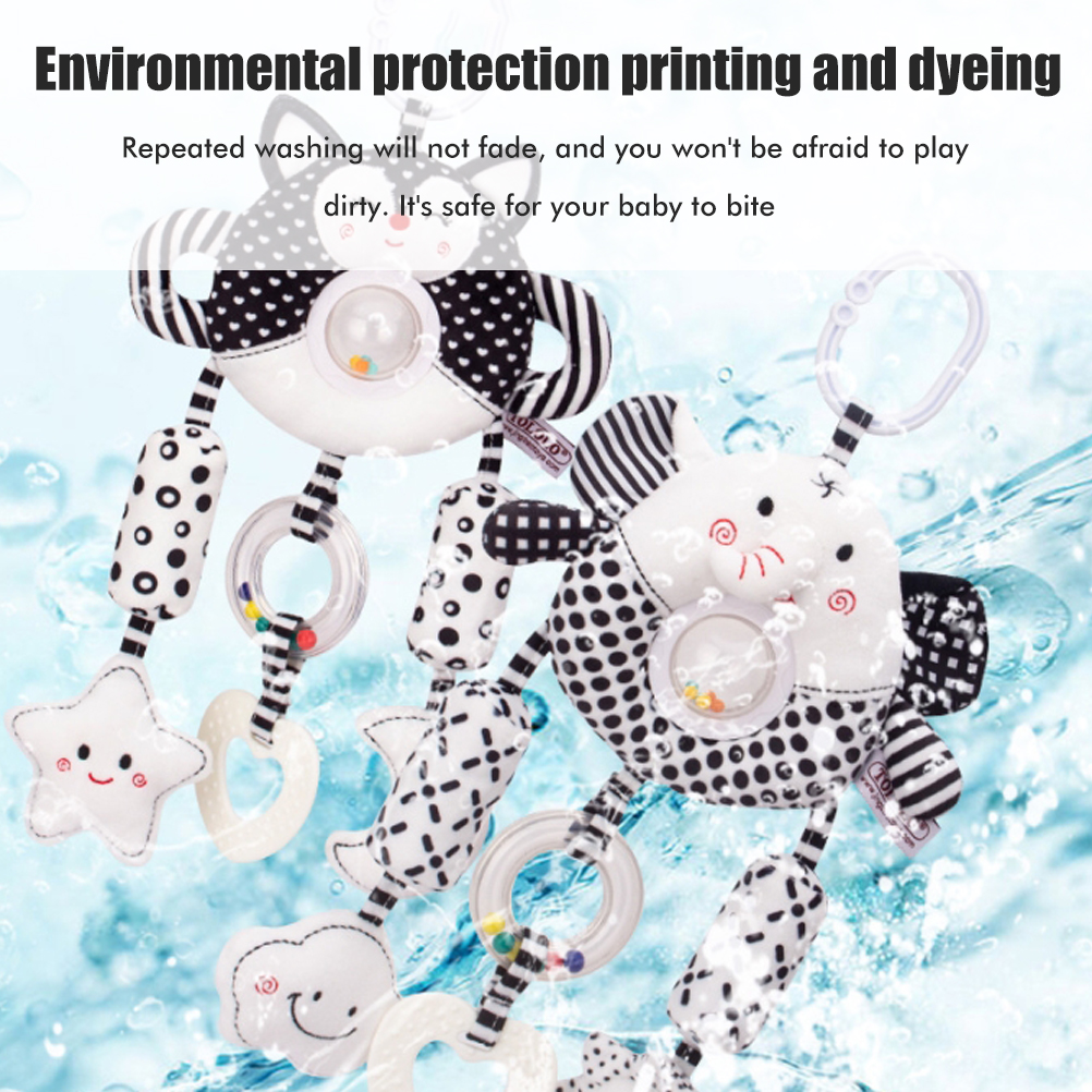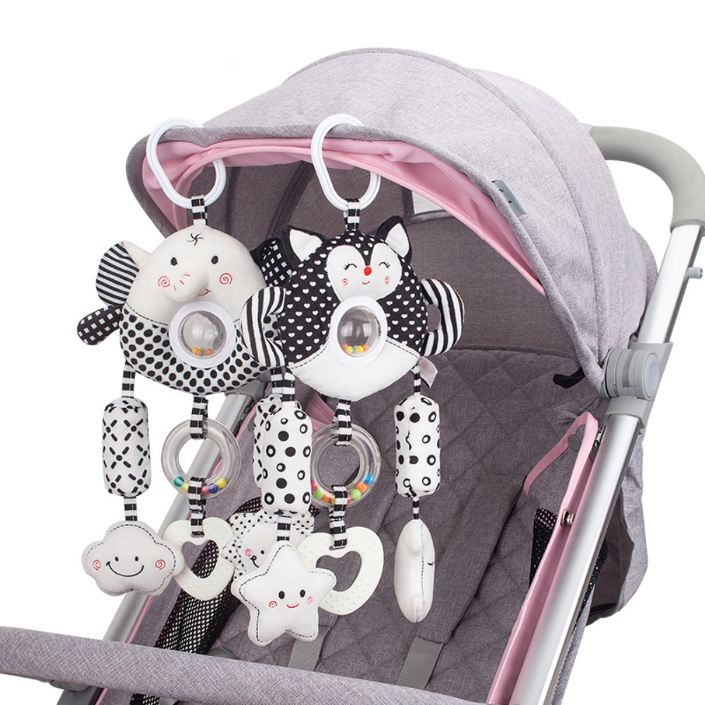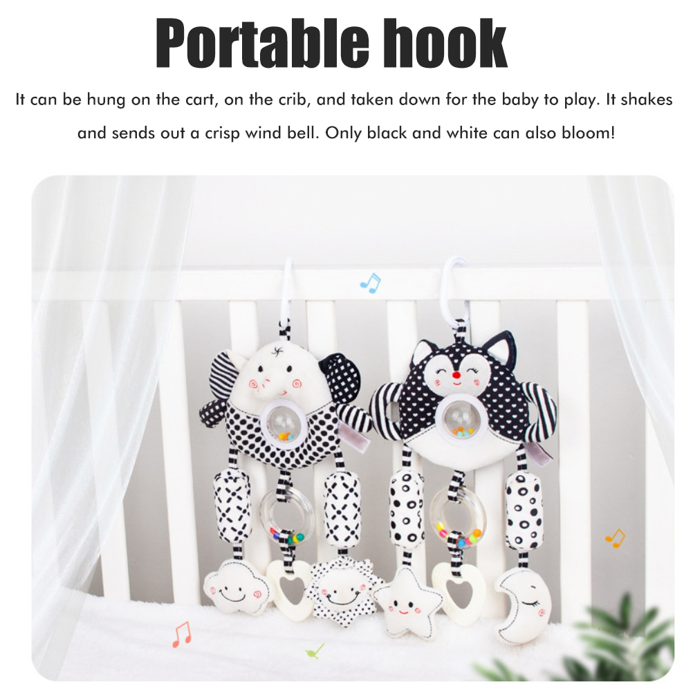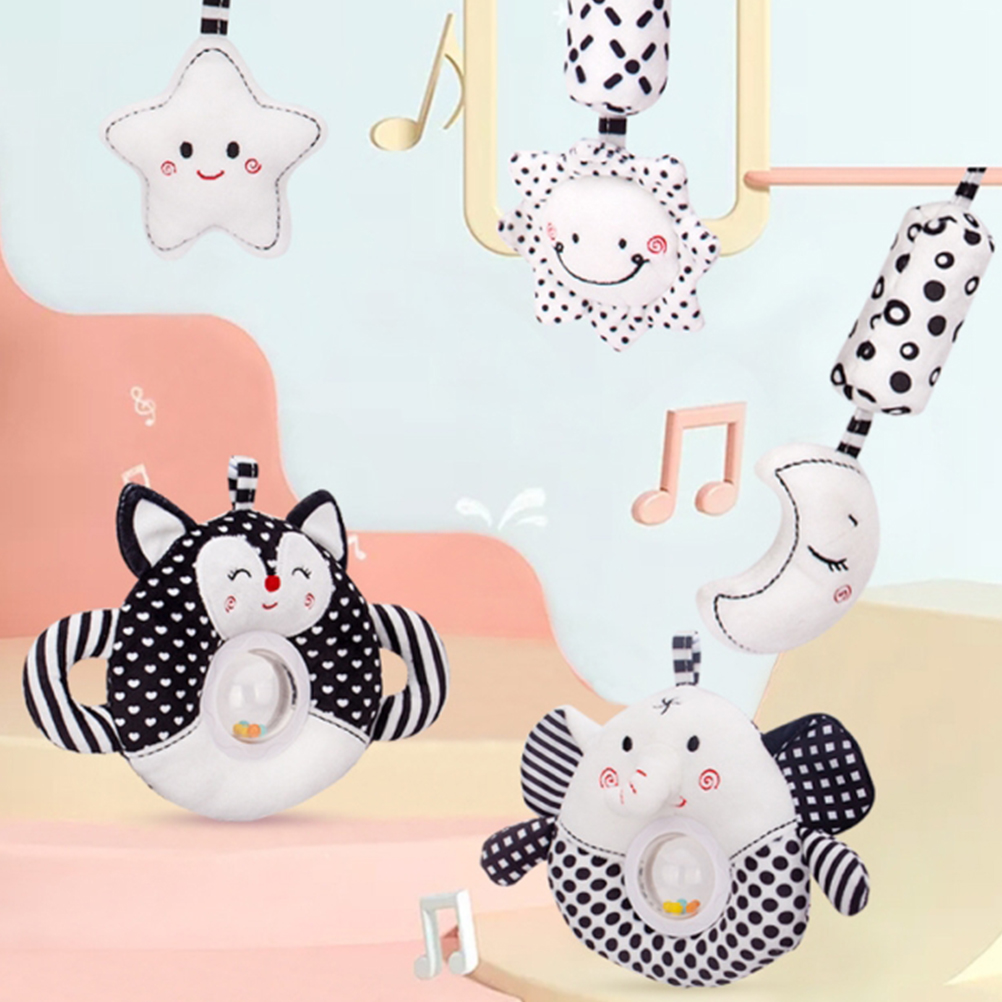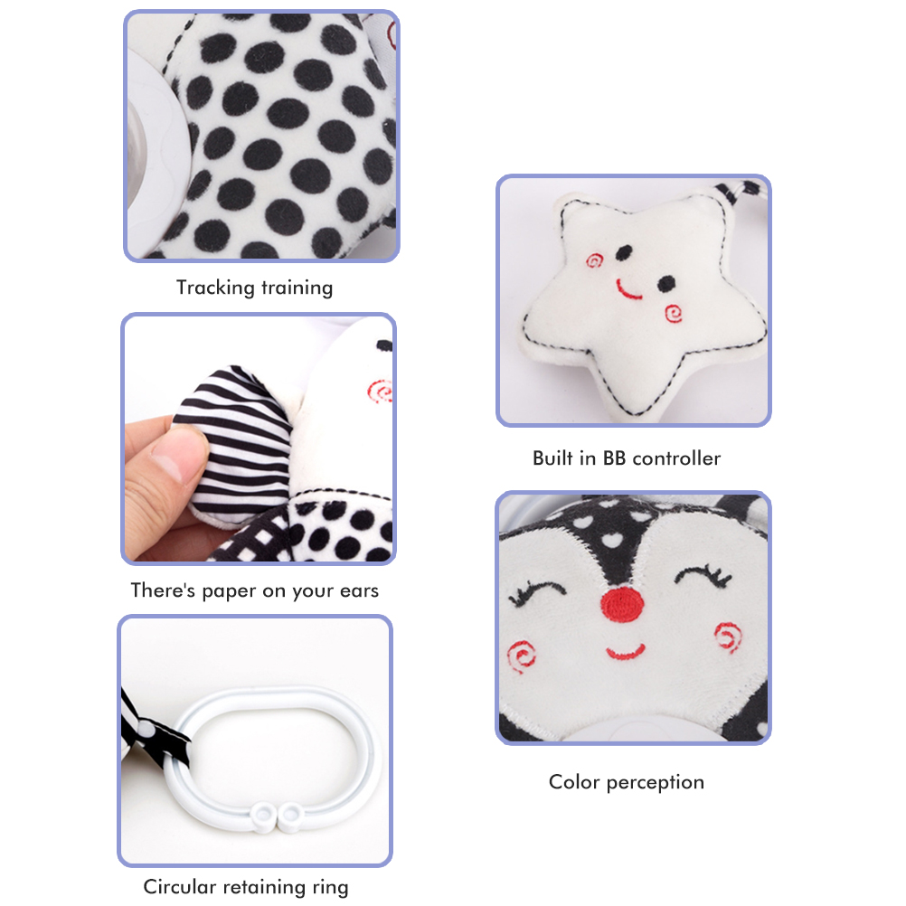 1、1. The cart rattle pendant has two wind chimes. When shaken, it chimes to attract your baby's attention and soothe them. 2、2. Beautiful cartoon design of sun/moon/stars/clouds with built-in BB whistle. Squeeze them to make funny sounds and improve the baby's fine motor skills. 3、3. Black and white can stimulate the baby's visual awareness, promote the rapid development of the optic nerve and brain, and improve the baby's intelligence. 4、4. In the middle is a rattle with colorful beads. Babies love to rattle and develop hand-eye coordination. 5、5. The hanging plush rattle is made of eco-friendly soft fabric. It's safe and comfortable. An ideal gift for babies, it can be hung on strollers, cribs, and car seats.