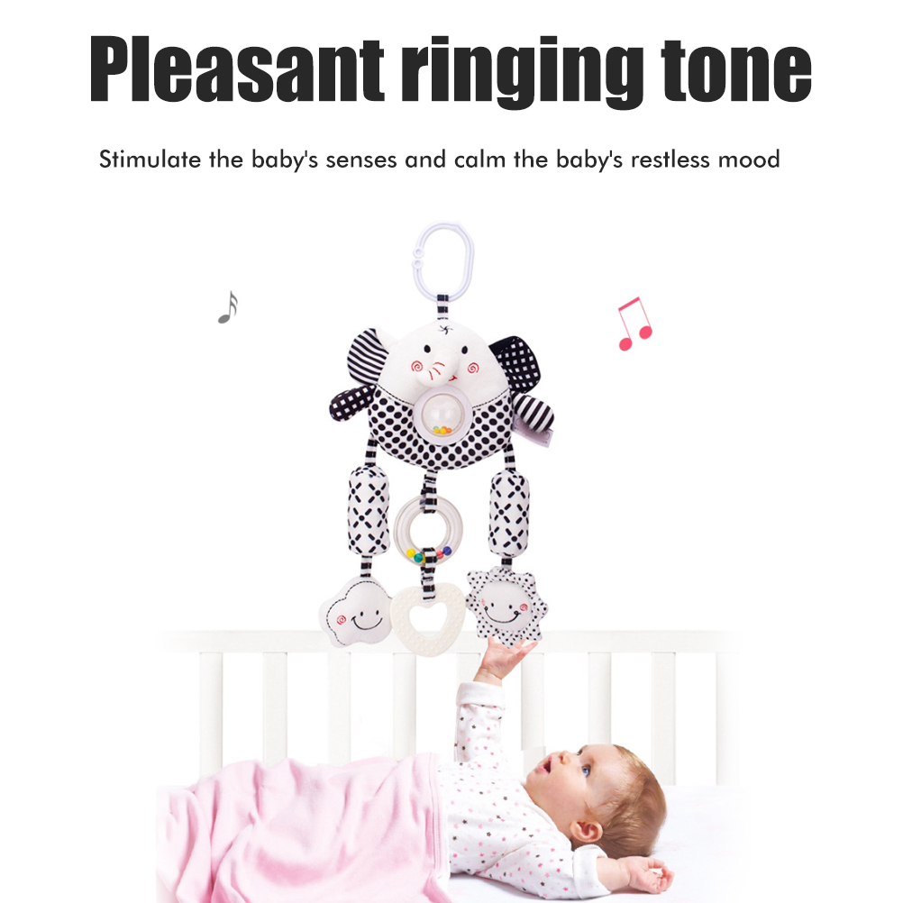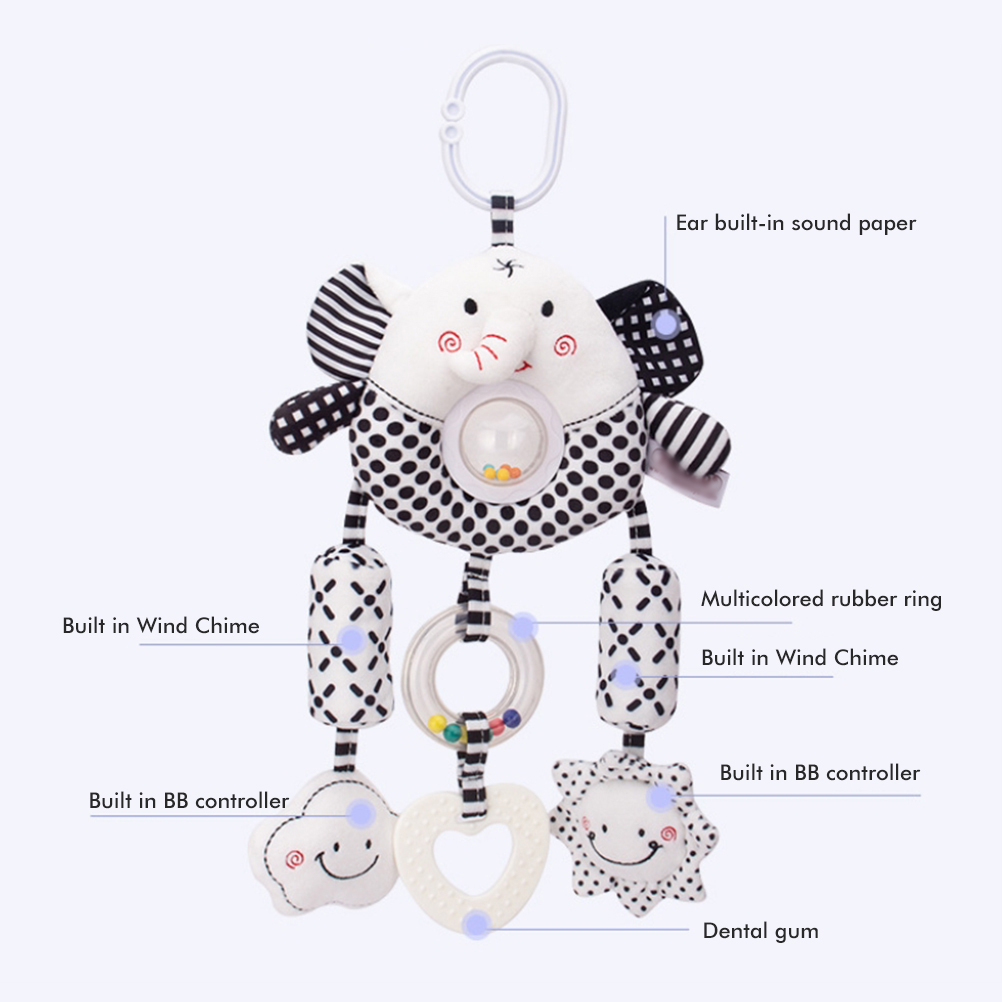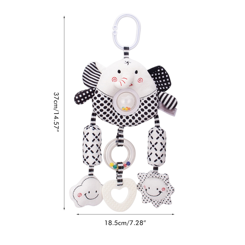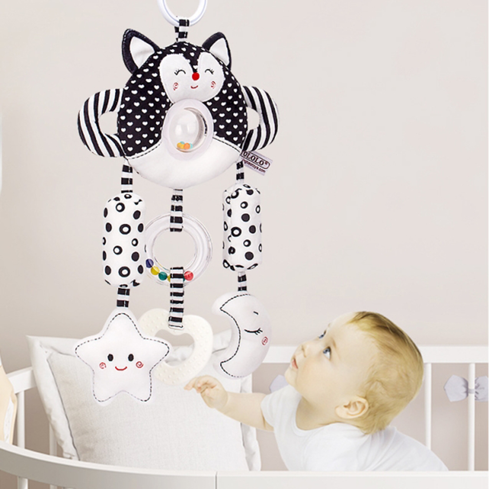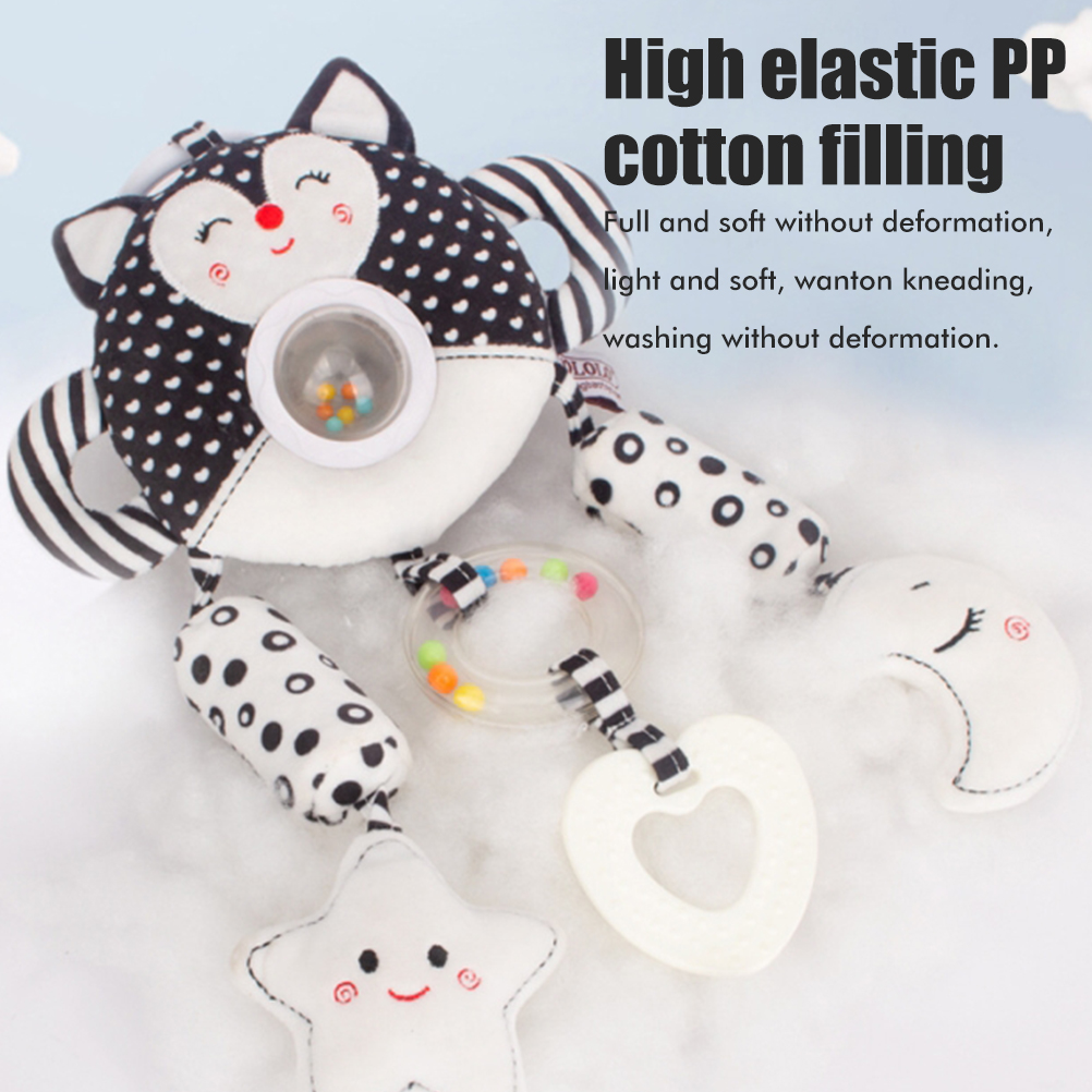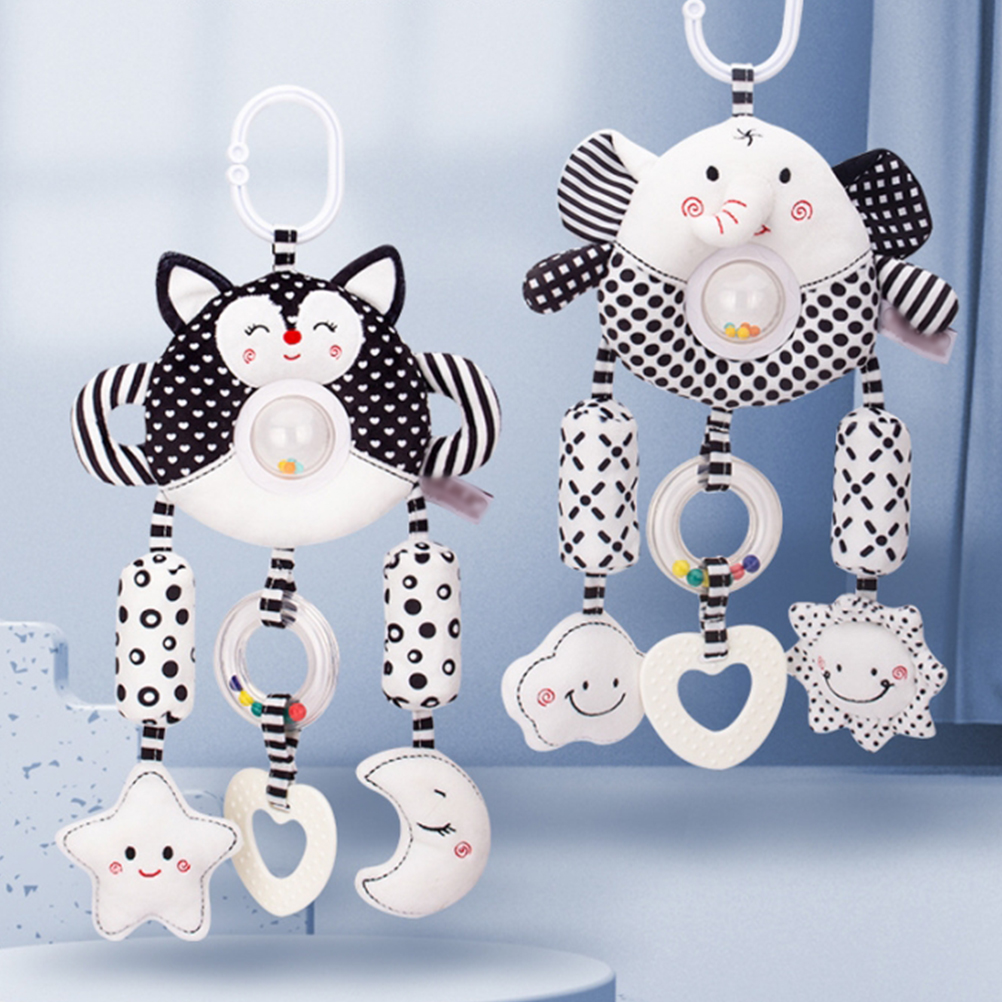 1、1. The cart rattle pendant has two wind chimes. When shaken, it chimes to attract your baby's attention and soothe them. 2、2. Beautiful cartoon design of sun/moon/stars/clouds with built-in BB whistle. Squeeze them to make funny sounds and improve the baby's fine motor skills. 3、3. Black and white can stimulate the baby's visual awareness, promote the rapid development of the optic nerve and brain, and improve the baby's intelligence. 4、4. In the middle is a rattle with colorful beads. Babies love to rattle and develop hand-eye coordination. 5、5. The hanging plush rattle is made of eco-friendly soft fabric. It's safe and comfortable. An ideal gift for babies, it can be hung on strollers, cribs, and car seats.