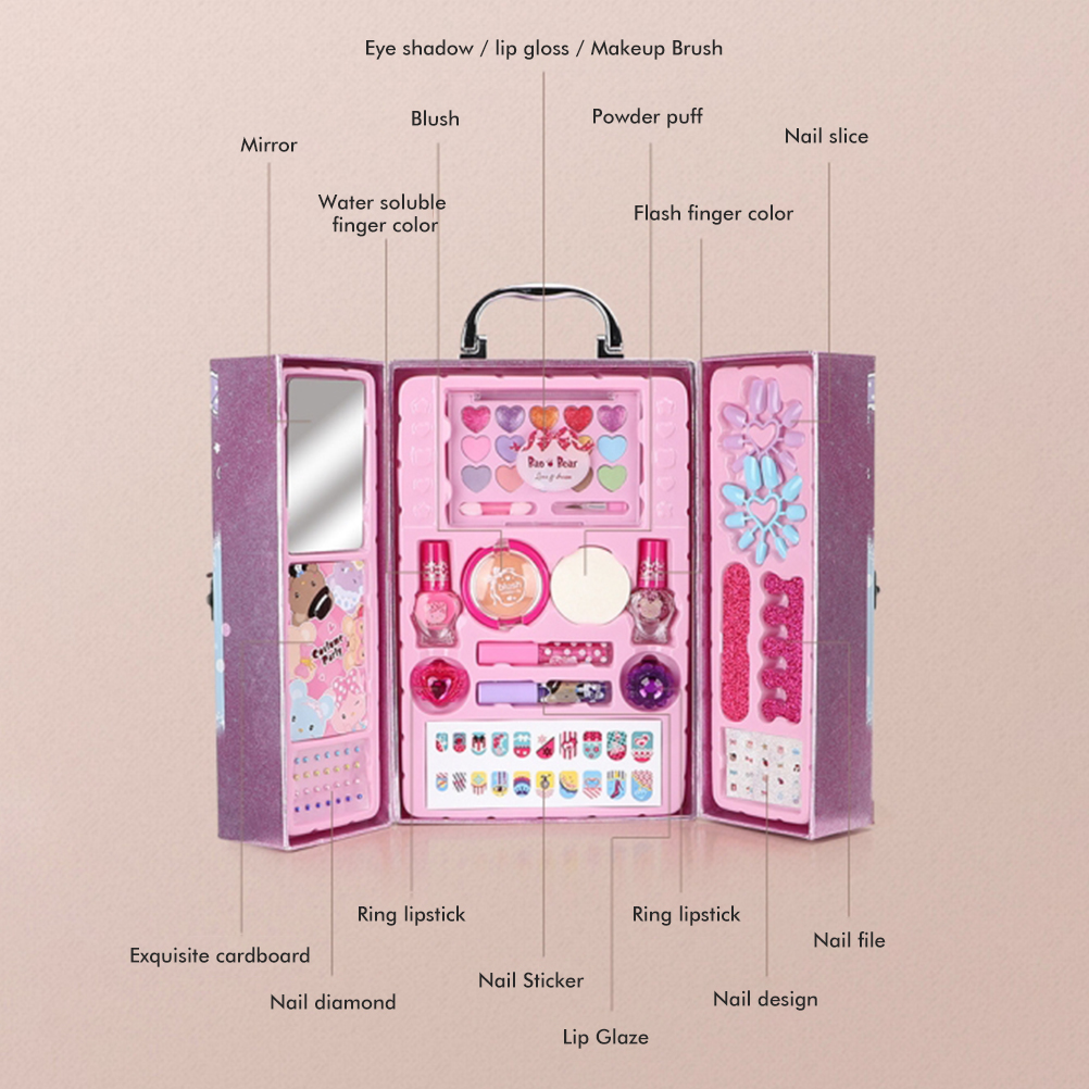 1、1. Easy to carry: The size of this makeup set is perfect for carrying. The weight of the toy is very light, and children can carry it by themselves and pretend to play with makeup and beauty accessories. 2、2. Improve little girl makeup skills: Our girl makeup kit includes everything your child needs to pretend to be a child makeup artist. This set will provide several hours of make-up suit girl care, beauty, and make-up games. Your child will love to beautify himself and the people around him. 3、3. The perfect gift: This children’s makeup set girl is perfect for a birthday gift, Christmas gift, playroom toy, reward, or just to make your little princess smile. 4、4. Fun dressing up game: The toy makeup set girl set can cultivate and improve children's imagination, creativity, and beauty while playing. Promote communication between parents and children. 5、5. Washable makeup kit: A game that encourages creativity and imagination. With this child safety kit, your little princess will spend hours beautifying herself.