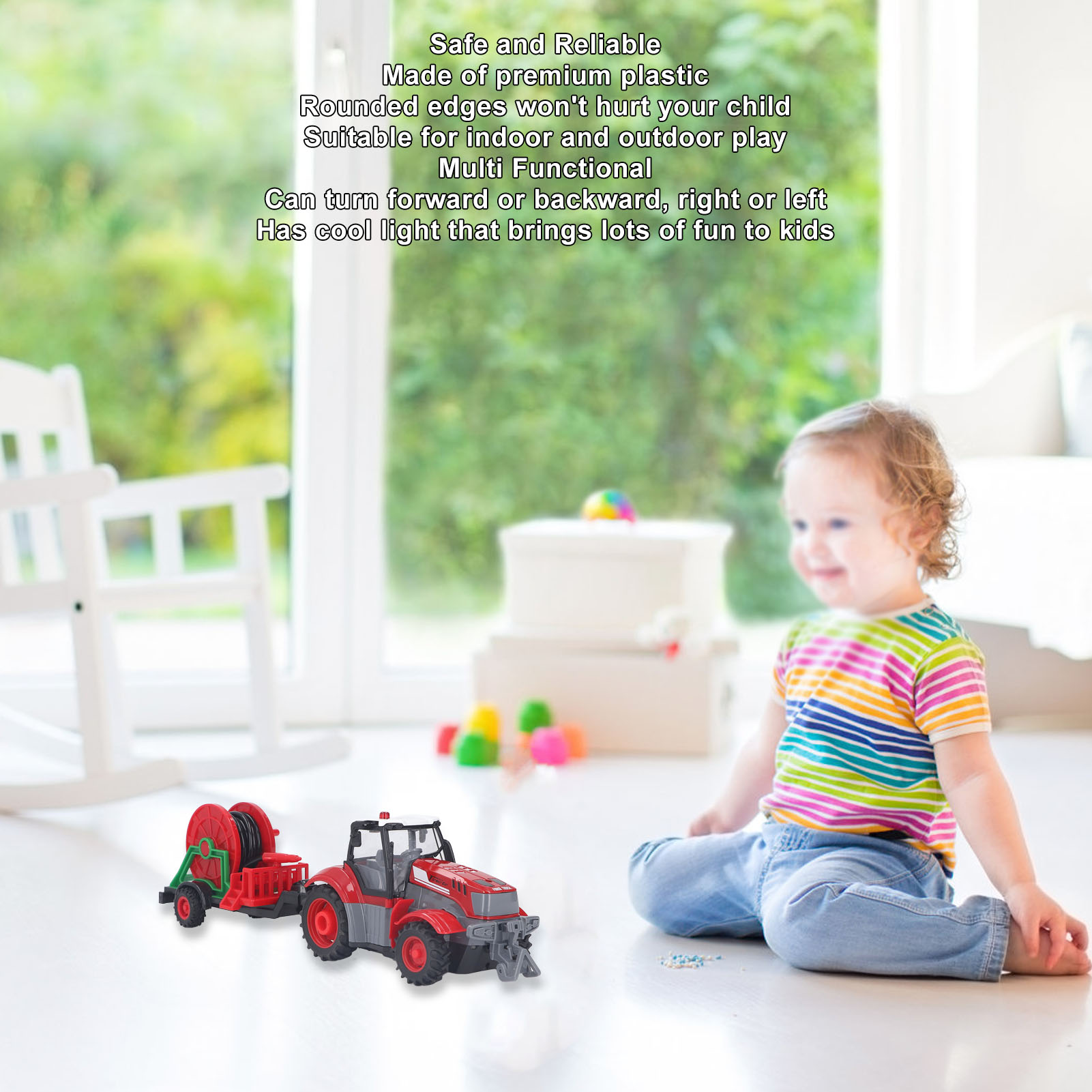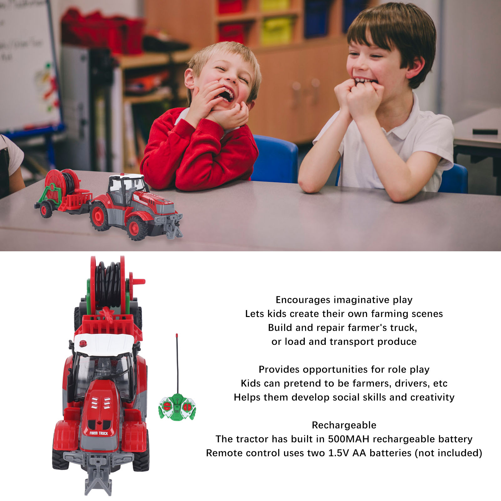 1、MULTIFUNCTIONAL: This RC farm tractor toy can be rotated to any direction. It can turn forward or backward, right or left. With cool light, it will bring a lot of fun to kids. 2、ENHANCE IMAGINATION: Imaginative play can be encouraged, allowing kids to create their own farming scenes, build and repair farmer truck, or load and transport produce. 3、ROLE PLAY: Remote control farm truck can also provide role play opportunities where children can pretend to be farmers, drivers, etc, helping them develop social skills and creativity. 4、REECHARGEABLE: The remote control farm tractor truck has built in 500MAH rechargeable battery. The remote control uses two 1.5V AA batteries (not included), with long battery life. 5、SAFE AND RELIABLE: RC farm tractor toy is made of premium plastic with rounded corners, won't hurt your kids. Suitable for both indoor and outdoor play.