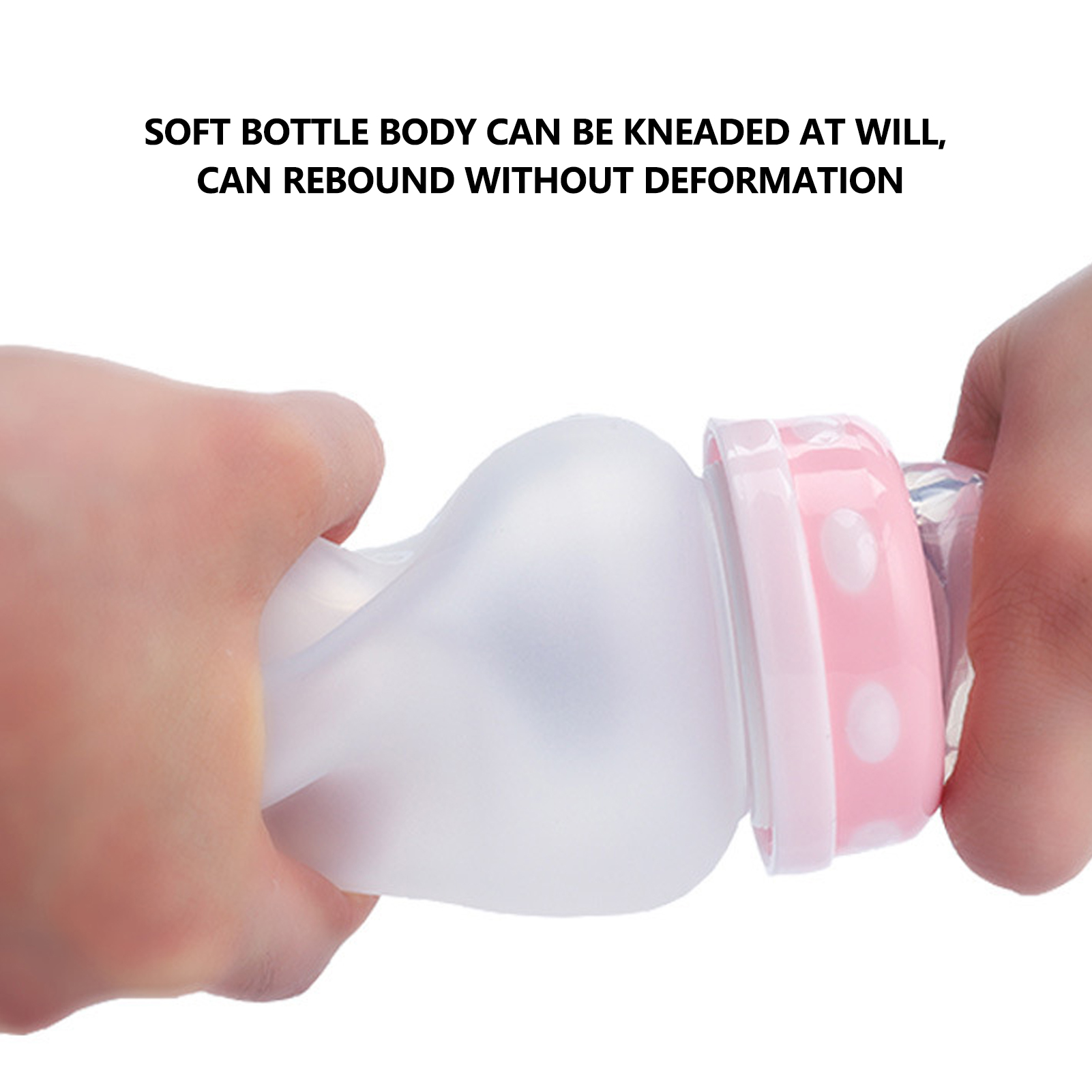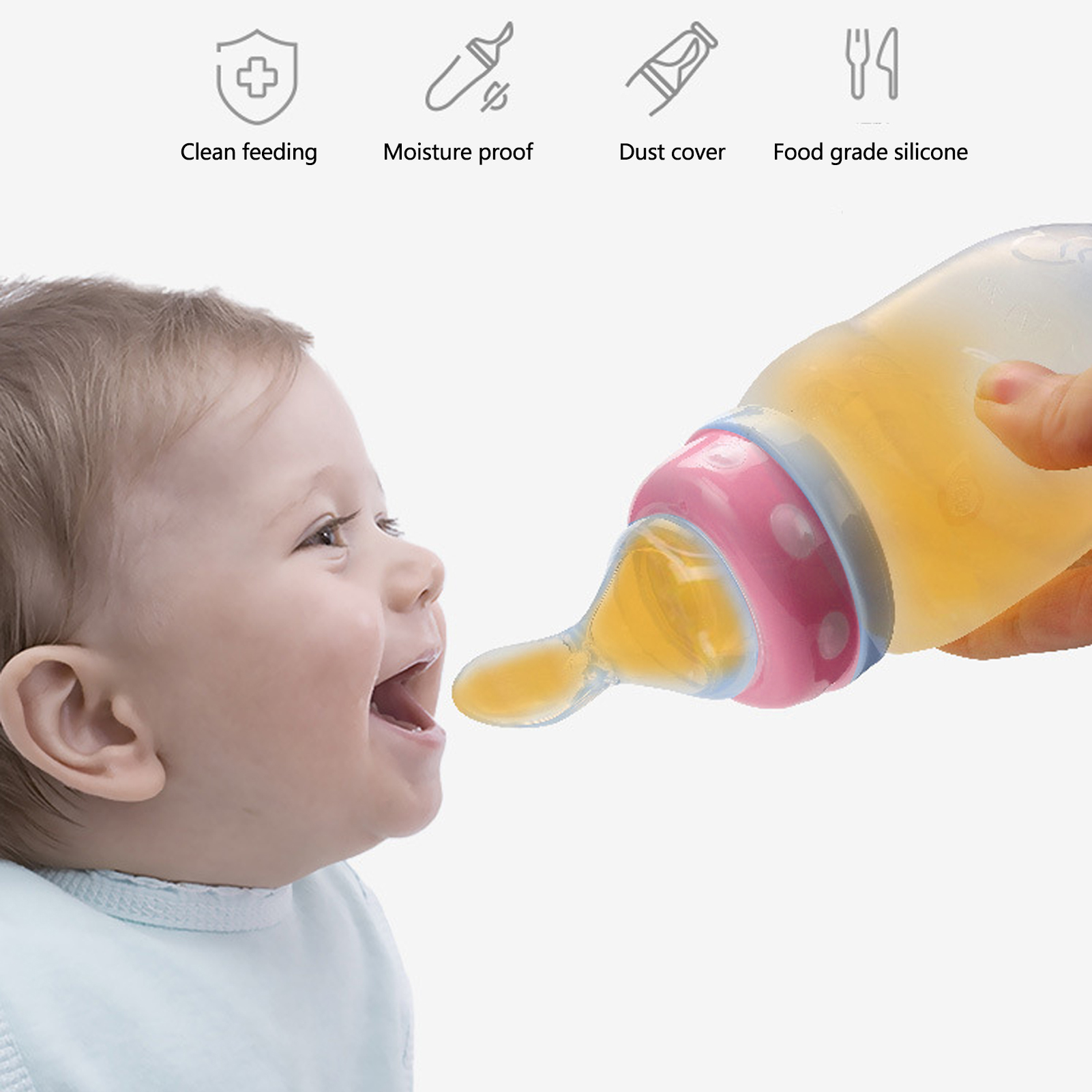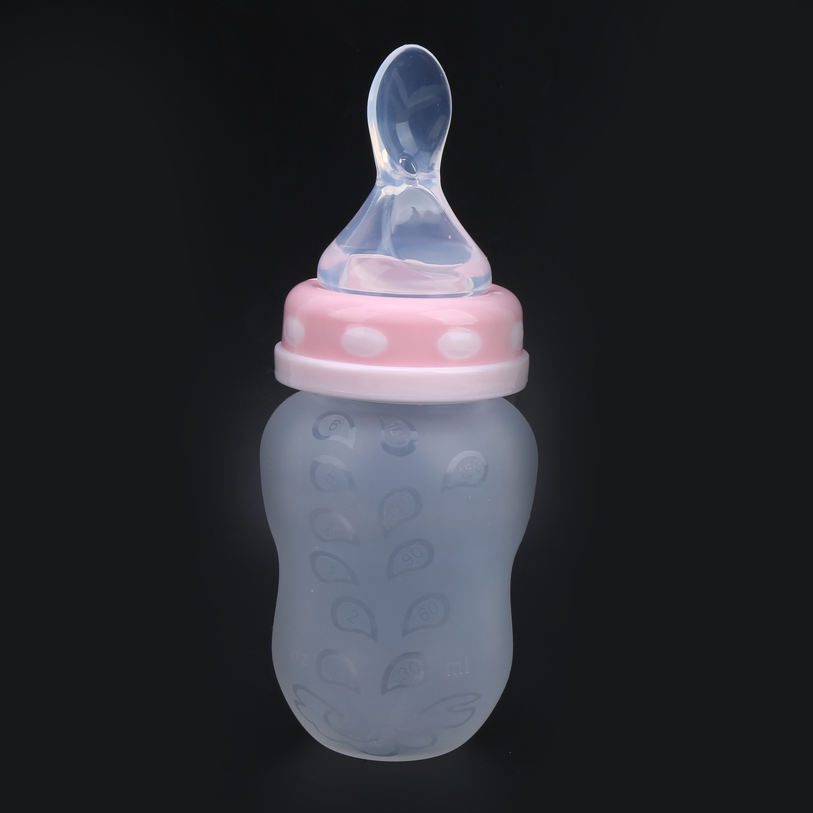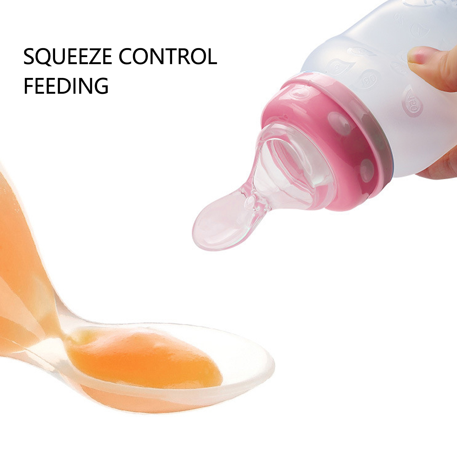 1、Feeding bottle is made of food‑grade silica gel, which is non‑toxic, tasteless, safe and durable. 2、Soft silicone bottle body can come out with a light pinch, and it is durable and not broken. 3、Bottle comes with a spoon, which effectively trains the baby to transition from the nipple to the spoon. 4、There is a scale on the bottle, which is convenient for mother to add using dosage. 5、Squeeze‑type controlled‑quantity feeding, gently squeeze feeding, controllable flows, prevent choking and sprinkling, babies can eat safely, saving time and effort. 6、Silicone spoon head, soft and elastic, not hurt gums, and protects mouth, can be used for feeding rice cereal, fruit puree, and children's medicine, can be directly installed with a pacifier as a silicone baby bottle.