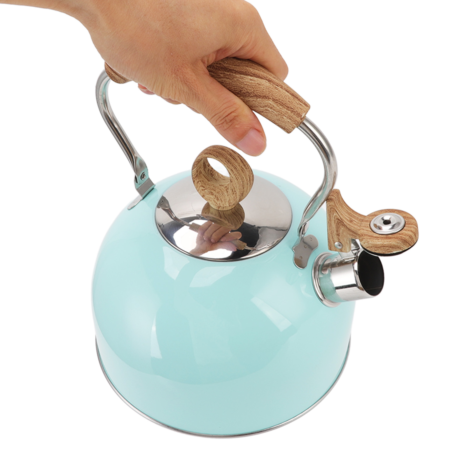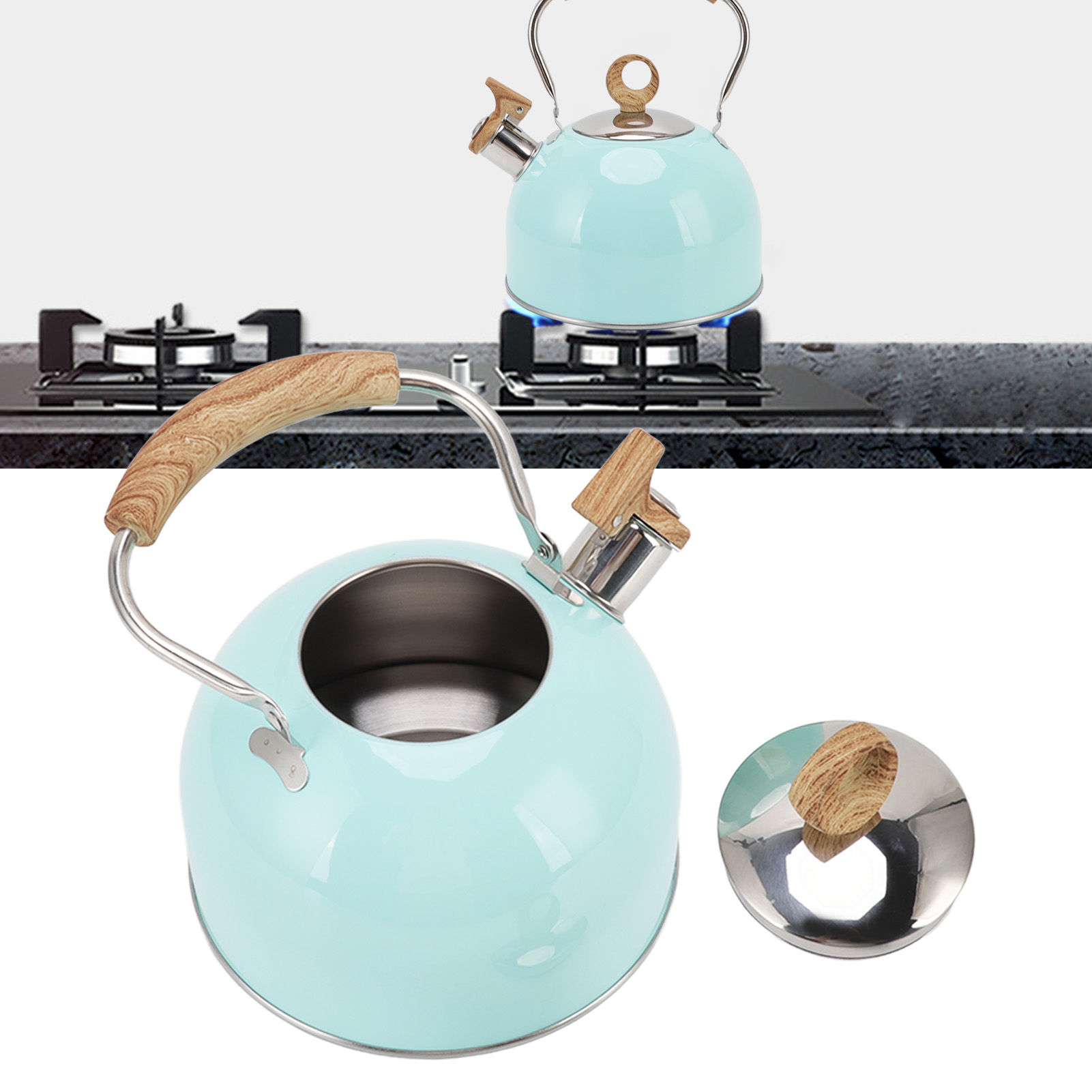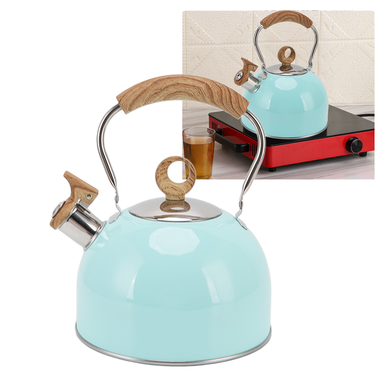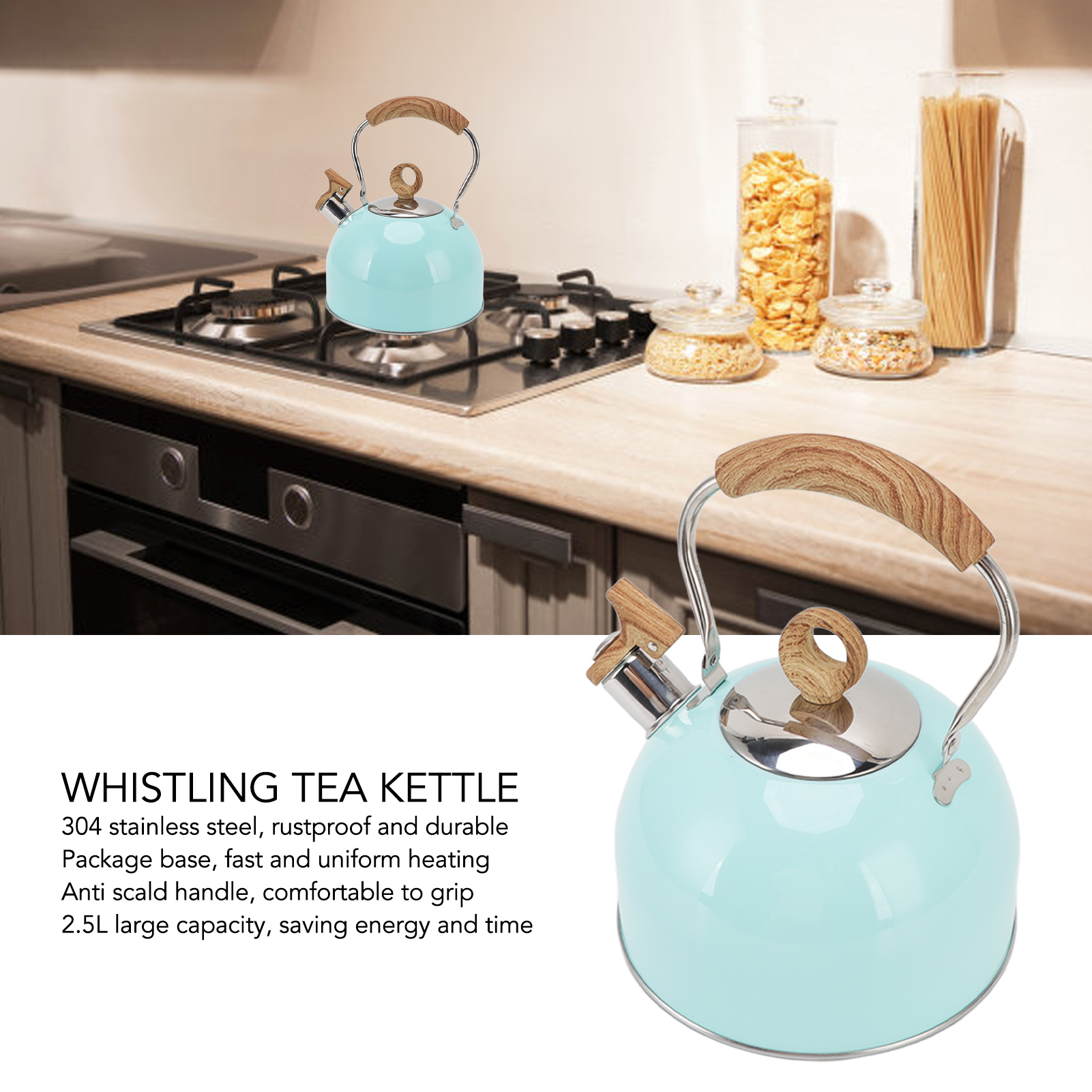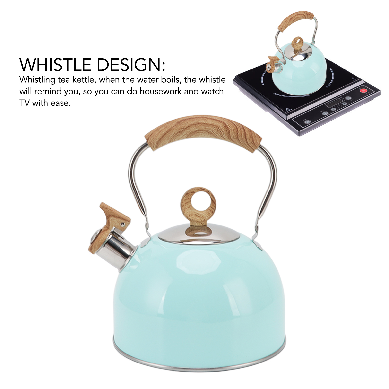 1、WHISTLE DESIGN: Whistling tea kettle, when the water boils, the whistle will remind you, so you can do housework and watch TV with ease. 2、STAINLESS STEEL: The kettle is made of 304 stainless steel, rustproof and durable, high temperature resistant, not easy to deform or corrode. 3、PORTABLE HANDLE: Ergonomic design handle, comfortable to grip, prevent scalding, the upside down spout cover is convenient for pouring and filling. 4、UNIFORM HEATING: The package base is convenient for rapid heating and heat retention, providing uniform heat distribution, efficient and practical. 5、2.5L CAPACITY: 2.5L large capacity can meet the needs of the whole family, reduce the frequency of repeated boiling, and save energy and time.