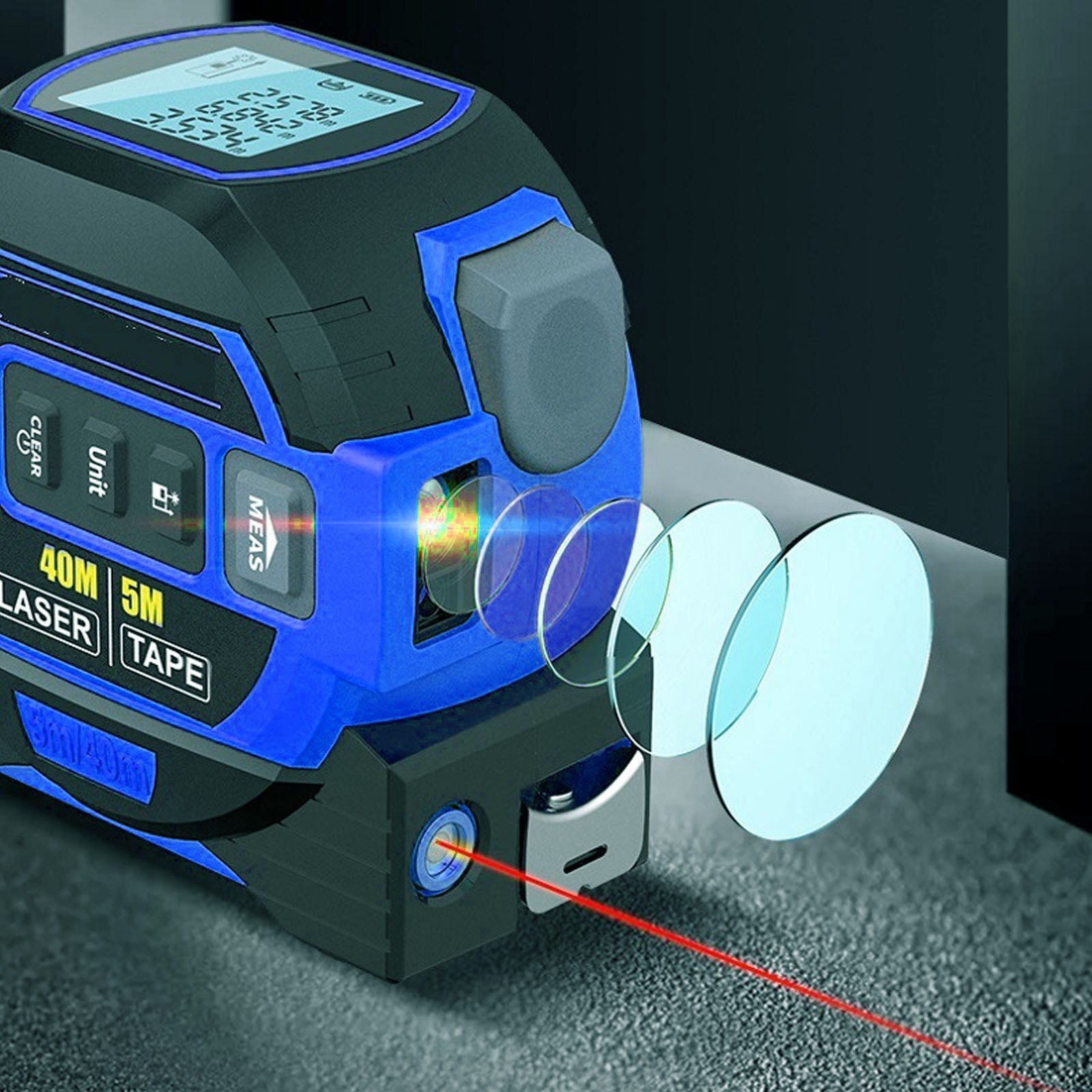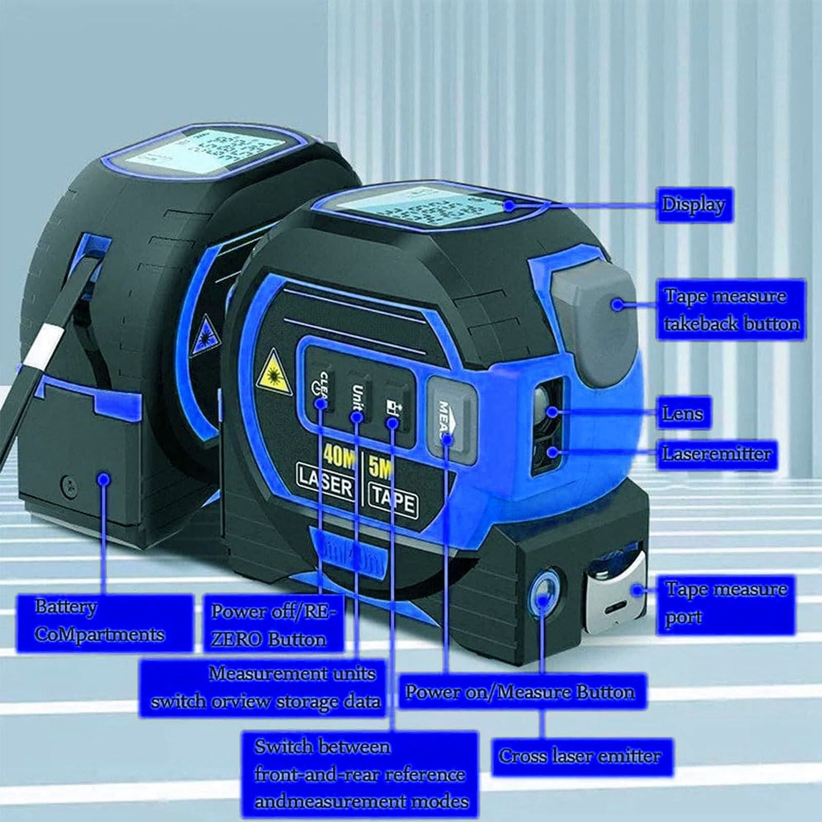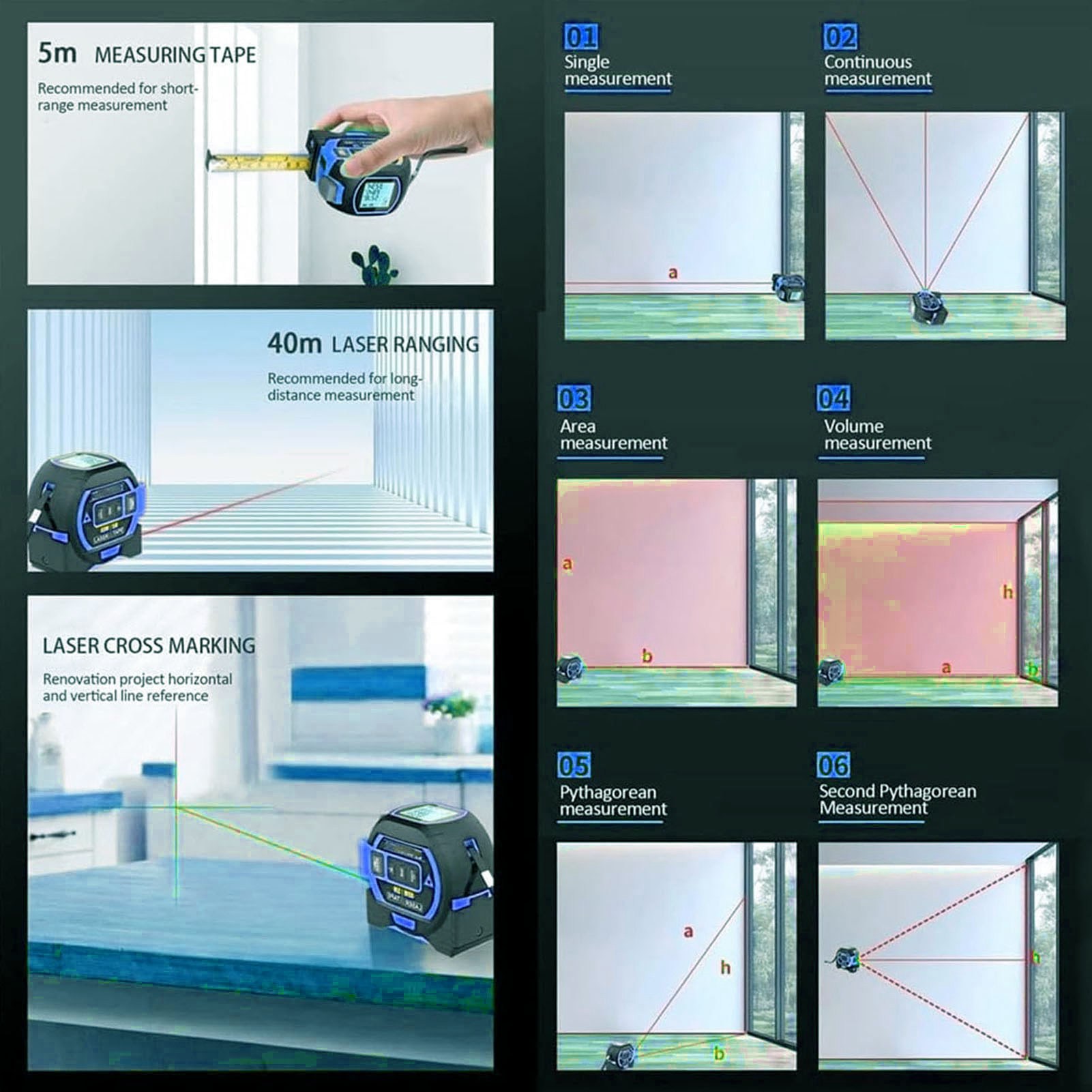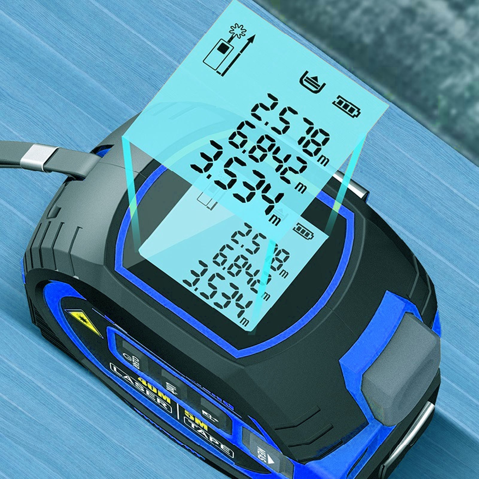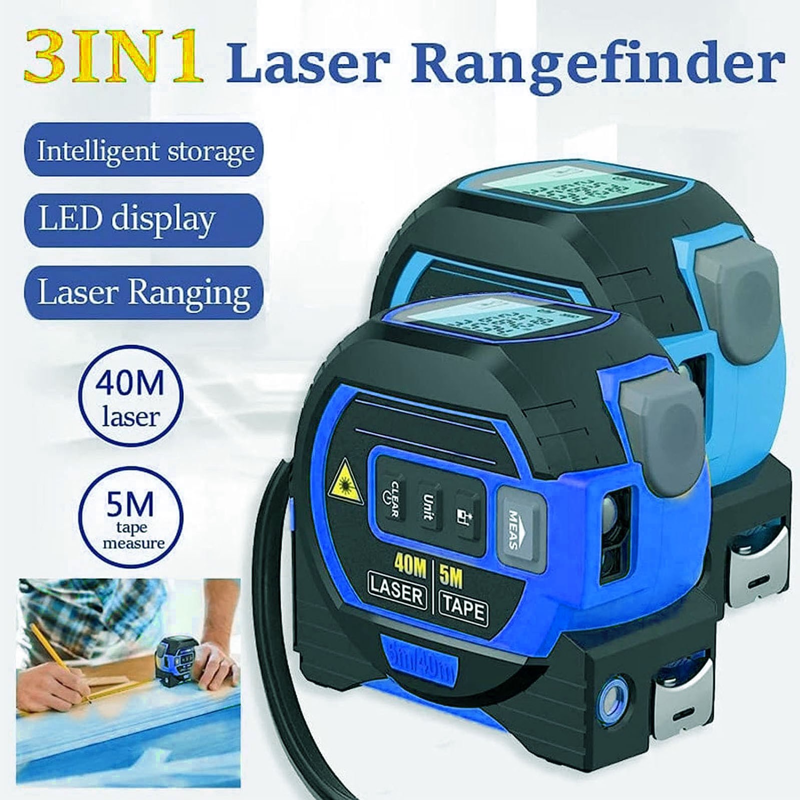 1、3 in 1 Infrared Rolls: Our 3 in 1 infrared tape measures include a rangefinder, a 5 meter tape measure, and a marking tool. High ceilings and other hard to reach areas can be easily measured at the touch of a button. 2、With Self Locking Device: The tape measure line has a self locking device that automatically locks the position after pulling the tape. Press the release button to retract automatically. 3、Accurate Masurement: 3 in 1 infrared tape can be used to installation and construction equipment, accuracy testing, bearing testing, automated inspection, etc. 4、With Data Storage: Built in storage function. Up to 20 groups of data can be stored. It can be called at any time for viewing and storage. You no longer need to worry about not being able to find recorded measurement data or losing data. 5、Easy to Use: The product can be used to measure area, volume and hook in a single, continuous manner. At the same time, it has high elasticity and toughness, ABS and TPR housing, anti slip and anti drop.