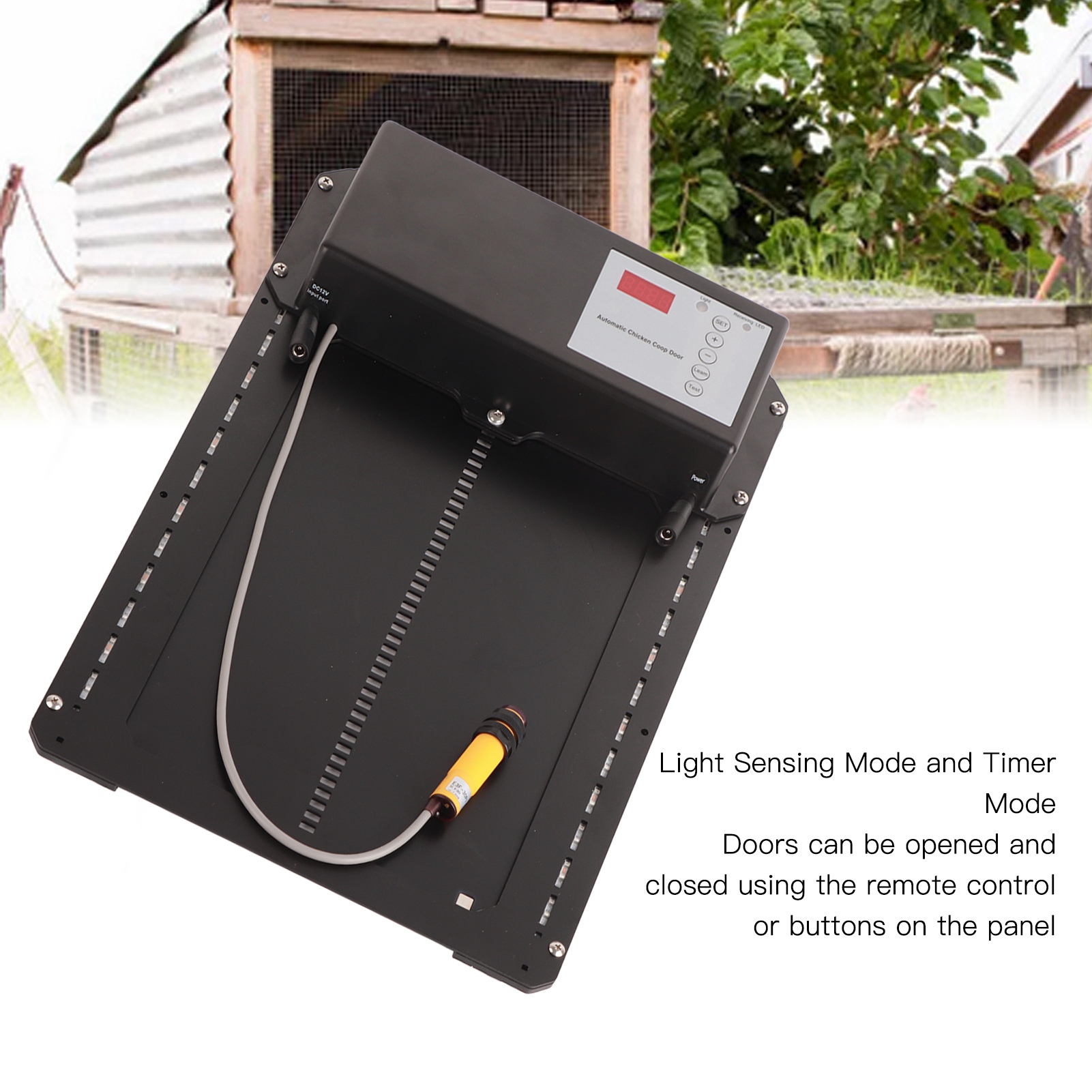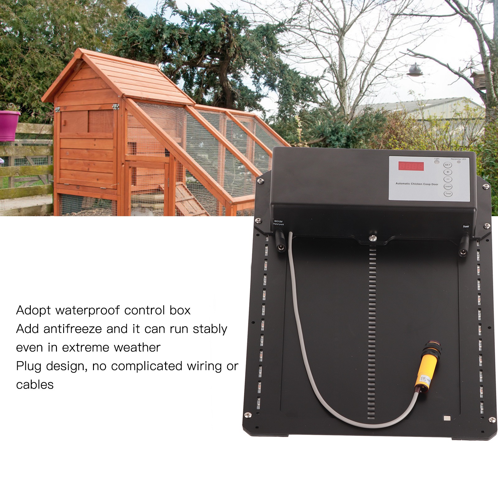 1、Weather Resistant: This automatic chicken coop door adopts a waterproof control box, and a premium electric motor with added antifreeze, it can run stably even in extreme weather. 2、Easy to Use: Plug design, no complicated wiring or cables, just install the coop door and plug in the adapter, and you can start to use. 3、Multiple Control Methods: In light sensing mode, the door will automatically open with dawn and close with sunset. In timer mode, the door will automatically open and close as you set it. You can also open and close the door using the remote control or buttons on the panel. 4、Good Performance: This automatic chicken cage door opener has IP44 waterproof grade, and the battery life can achieve 1 year after installation. Good performance and long service life. 5、Scope of Applications: Widely used on indoor and outdoor farms and ranches to accommodate chickens, ducks, geese and other livestock with good protection.