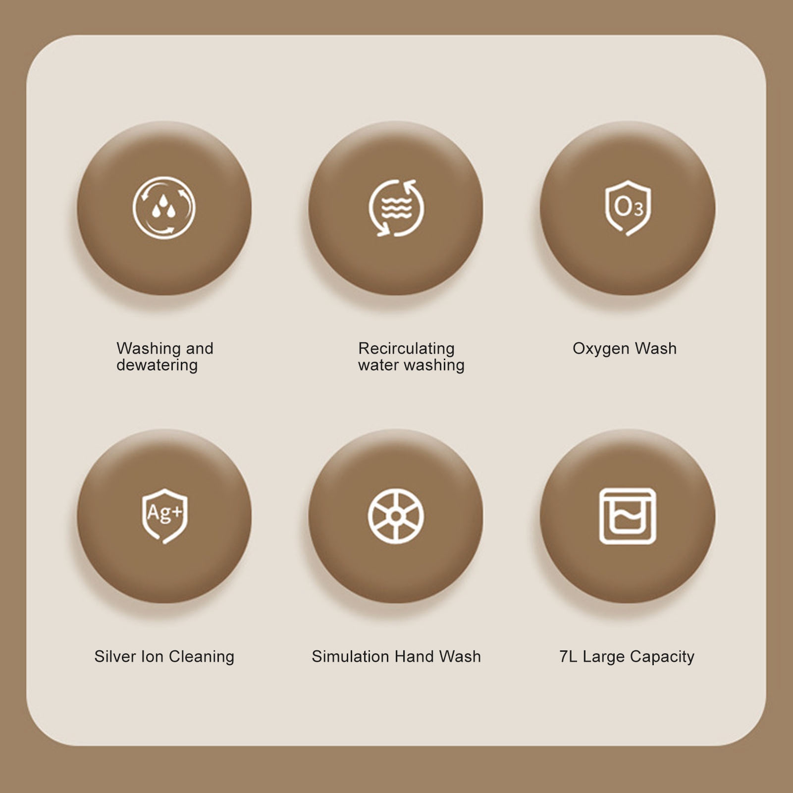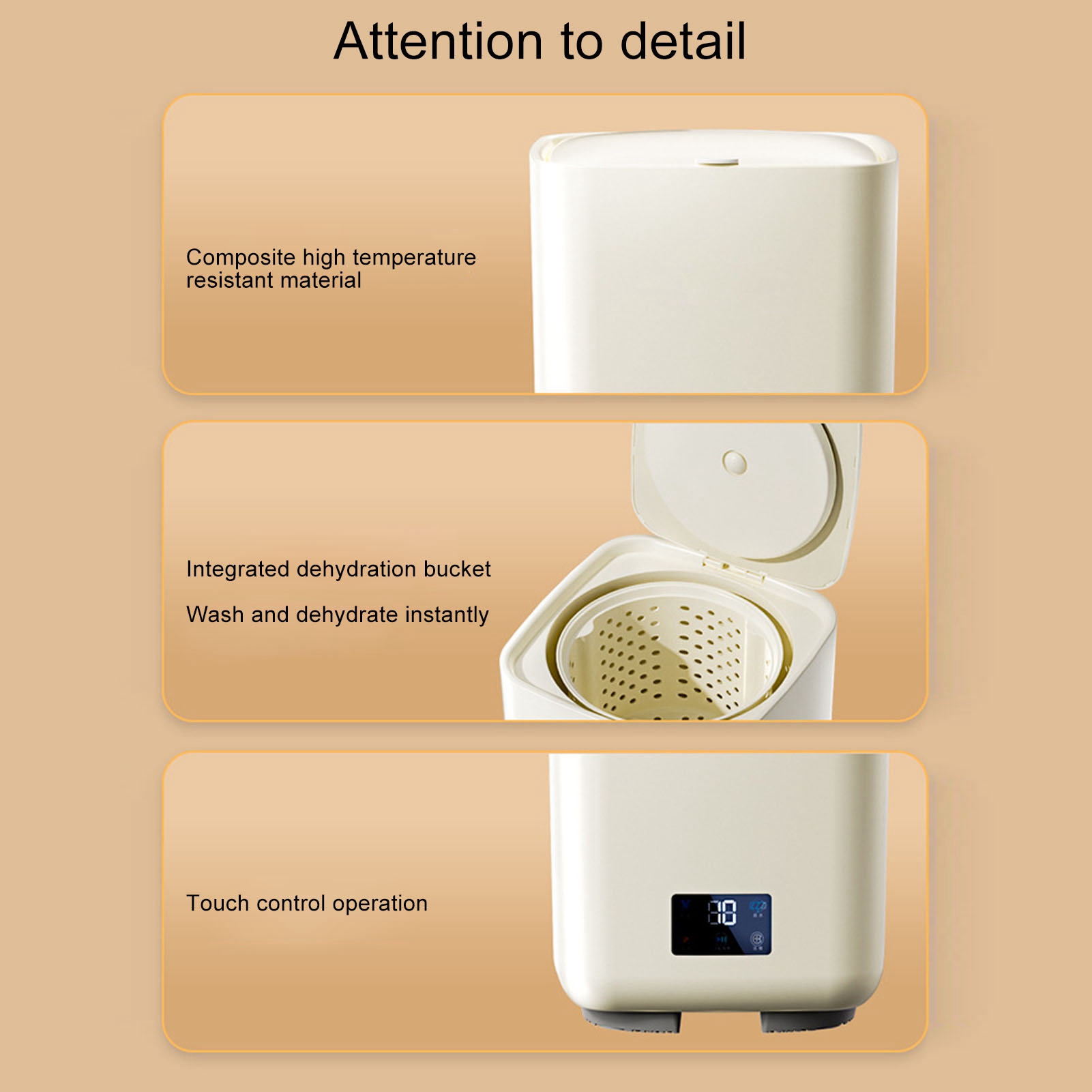 1、7L Large Capacity: This washing machine has a large capacity of 7 liters, which can accommodate a larger number of clothes to be washed at one time, which is convenient and fast. 2、Portable Design: With LCD touch screen for good control of washing time, and operation, the portable design of this washing machine makes it easy to carry and move around, suitable for use in different places such as dormitories, apartments, homes and RVs. 3、With Rotary Dryer: In addition to the washing function, the washing machine is also equipped with a rotary dryer, which can dry the clothes quickly after the washing is completed, saving time and labor costs. 4、One Button Start: Automatic water drainage, a piece of hands free, no additional water to change the water, just press the button to start the washing and drying process, saving the trouble of manual operation, free hands. 5、Automatic Integrated Operation: The washing machine realizes automated integrated operation from water pick up to spinning and draining, eliminating the need to manually handle each step of the process, which is simple and convenient.