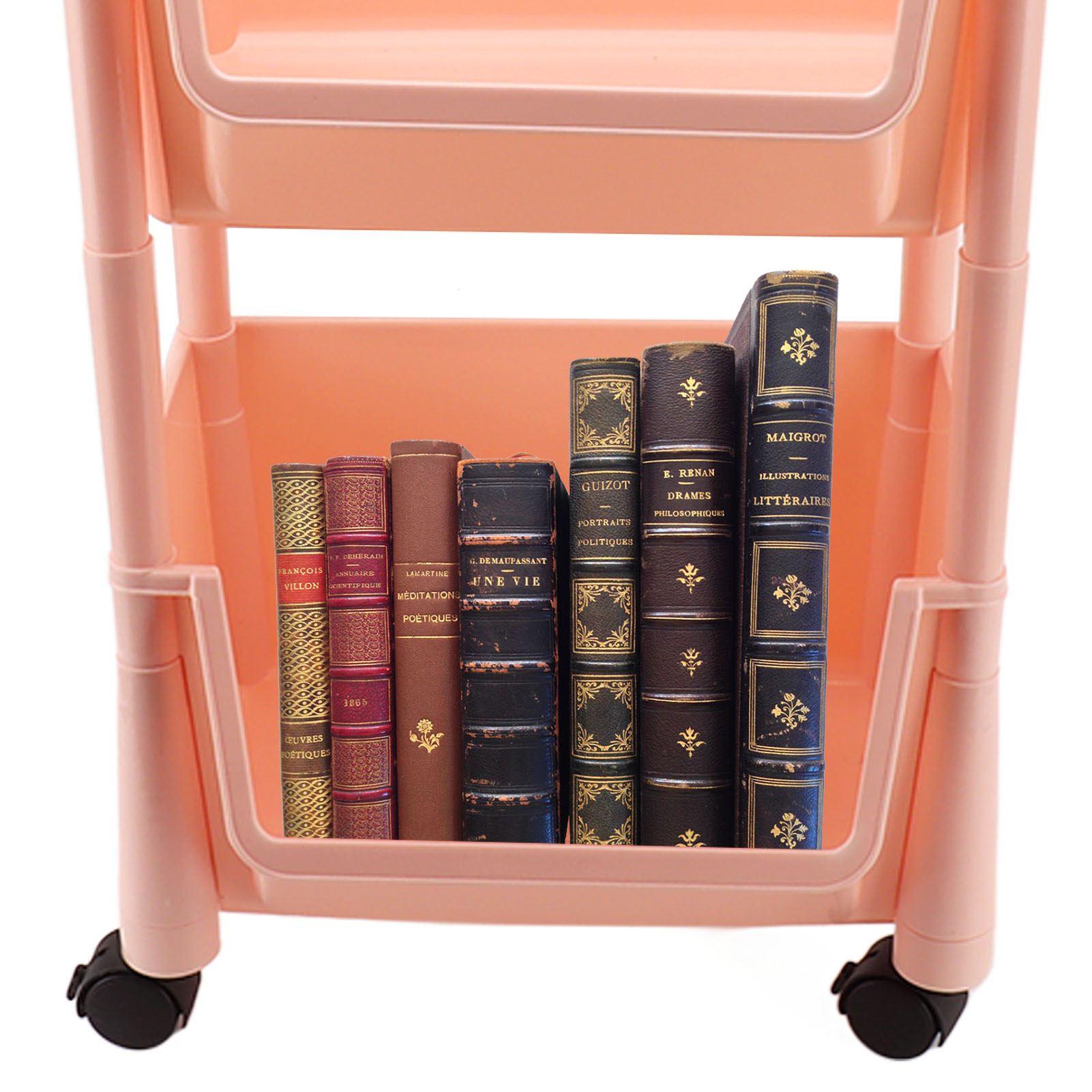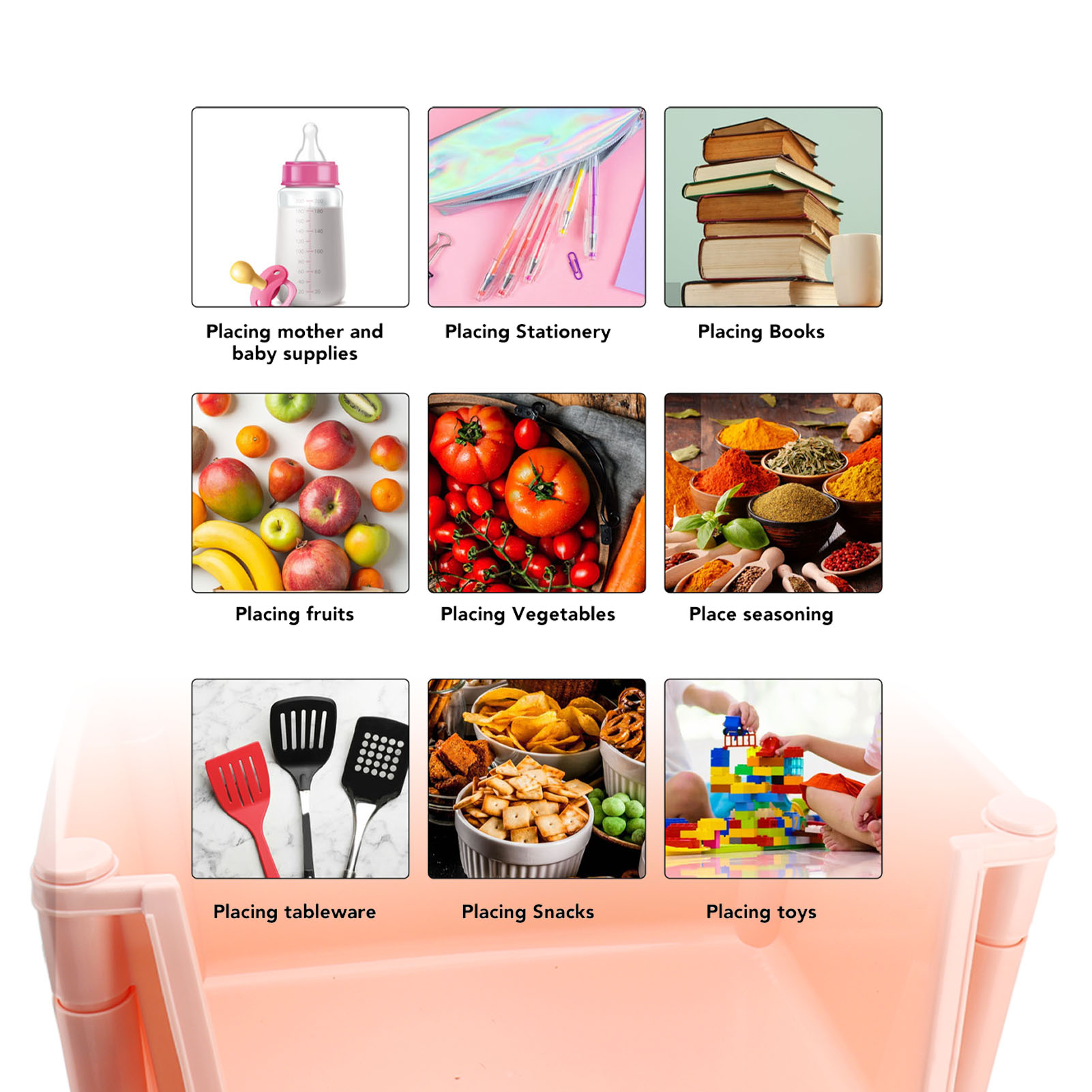 1、Multifunctional Use: The rolling utility cart can be used to store tools, snacks, books, or organization rack in your office, bedroom, kitchen, laundry room, pantry, studio, classroom, and craft areas. 2、Large Storage Capacity: The utility cart provides large storage space, having deep baskets design to prevent items from dropping, equipped with side hooks for hanging bags and cups, convenient for storage and space saving. 3、Convenient to Move: The storage cart is equipped with lockable wheel of being rotated in 360 degrees, making it convenient to roll around to anywhere you need, or lock it in place, pressing down to lock the wheels and prevent unwanted movements. 4、Easy Access: The book shlef has multiple layers, can be stacked and adjusted according to your needs, designed with inclined openings for convenient access without collision, and increasing height spacing for easier retrieval of items. 5、Strong and Sturdy: The organizer shelf is made of premium and sturdy PP material, having strong load bearing capacity, having wheel design for easy mobility, equipped with increased height spacing, having long service time.