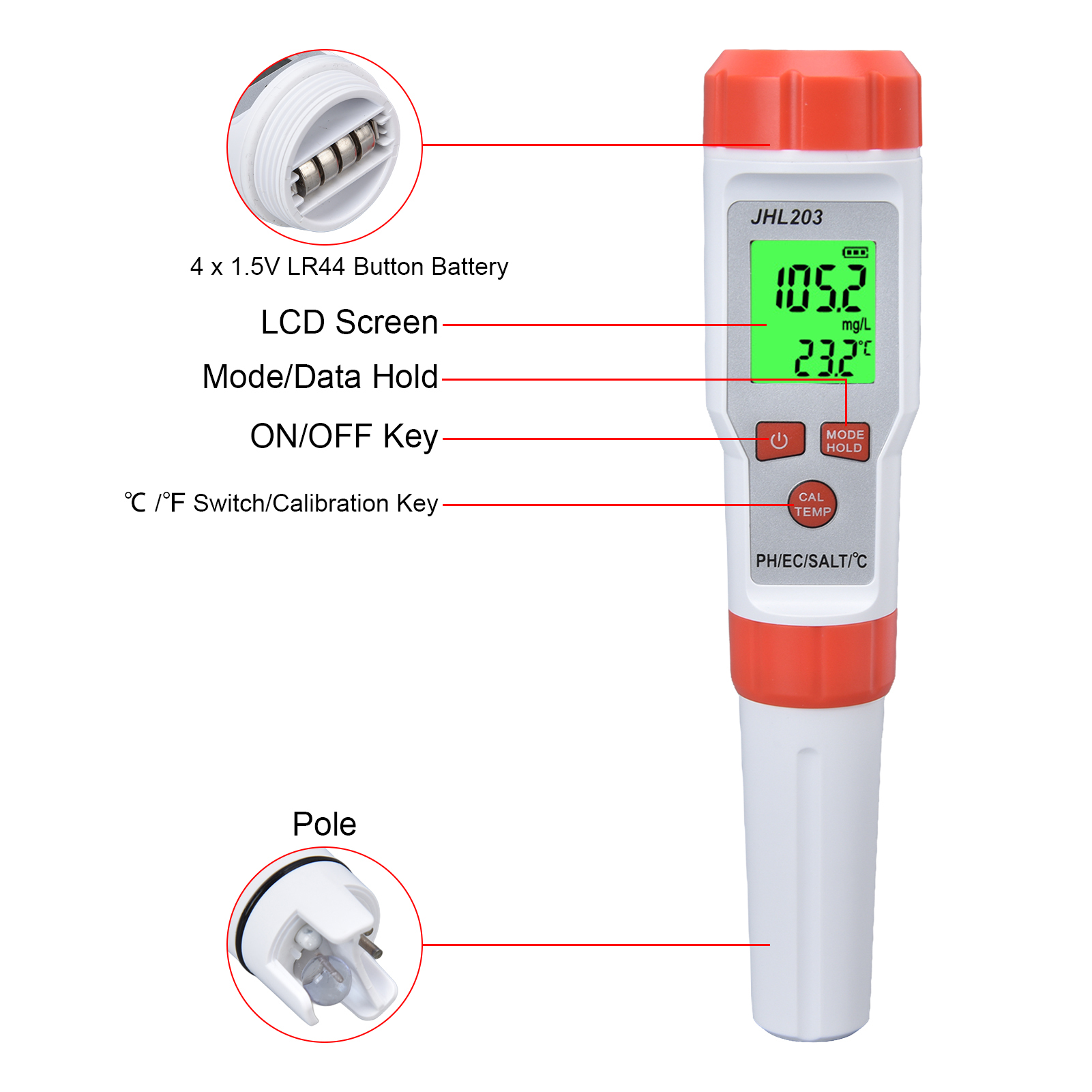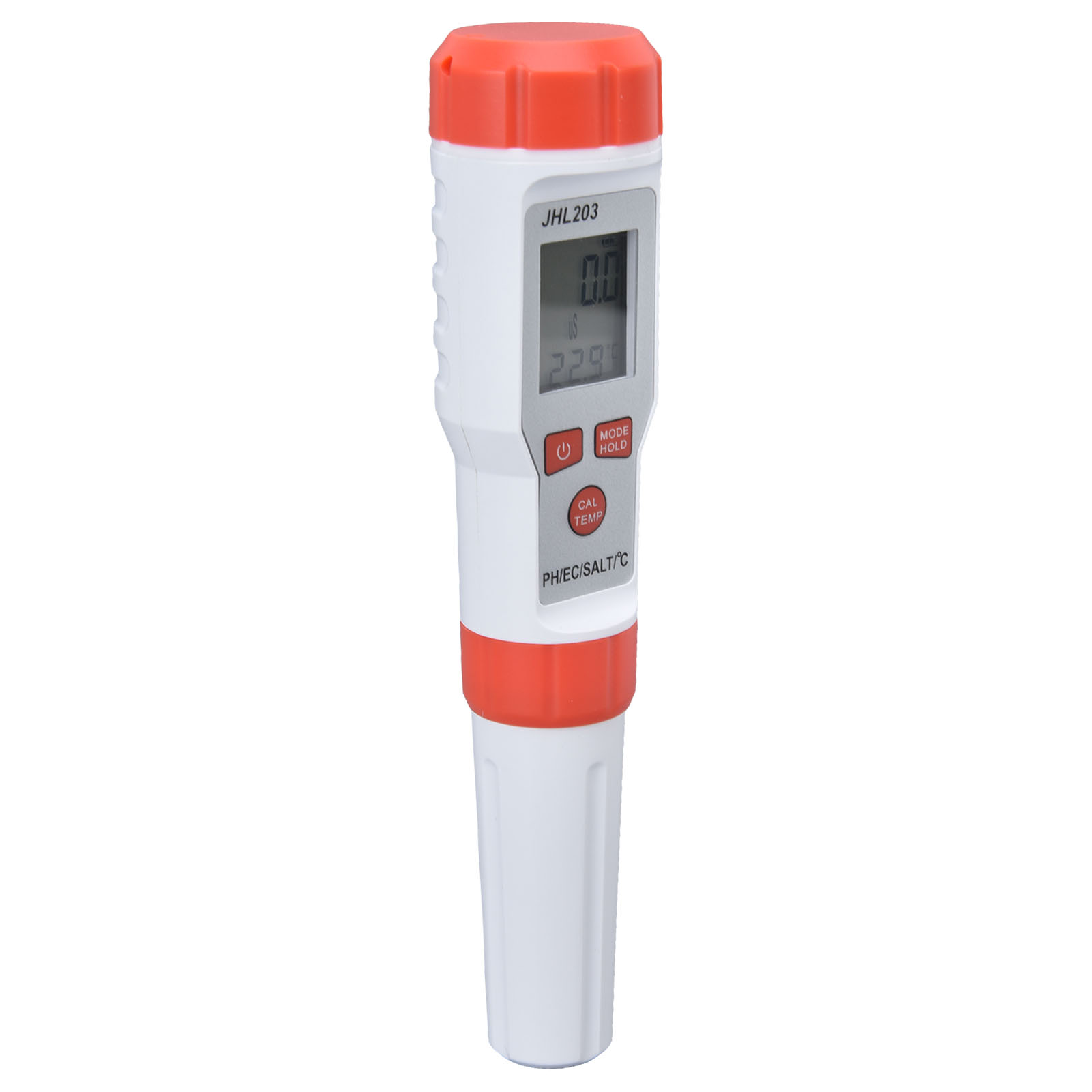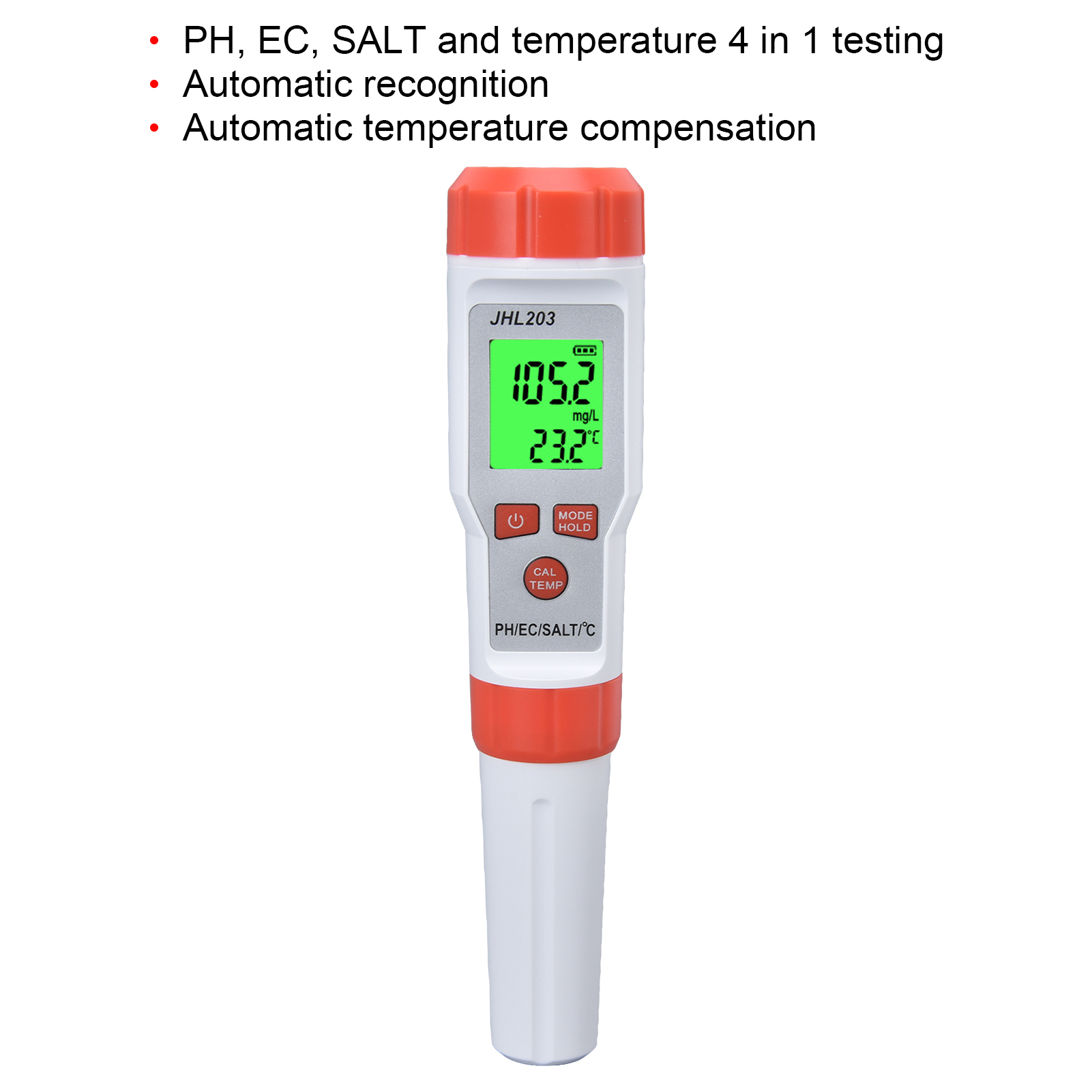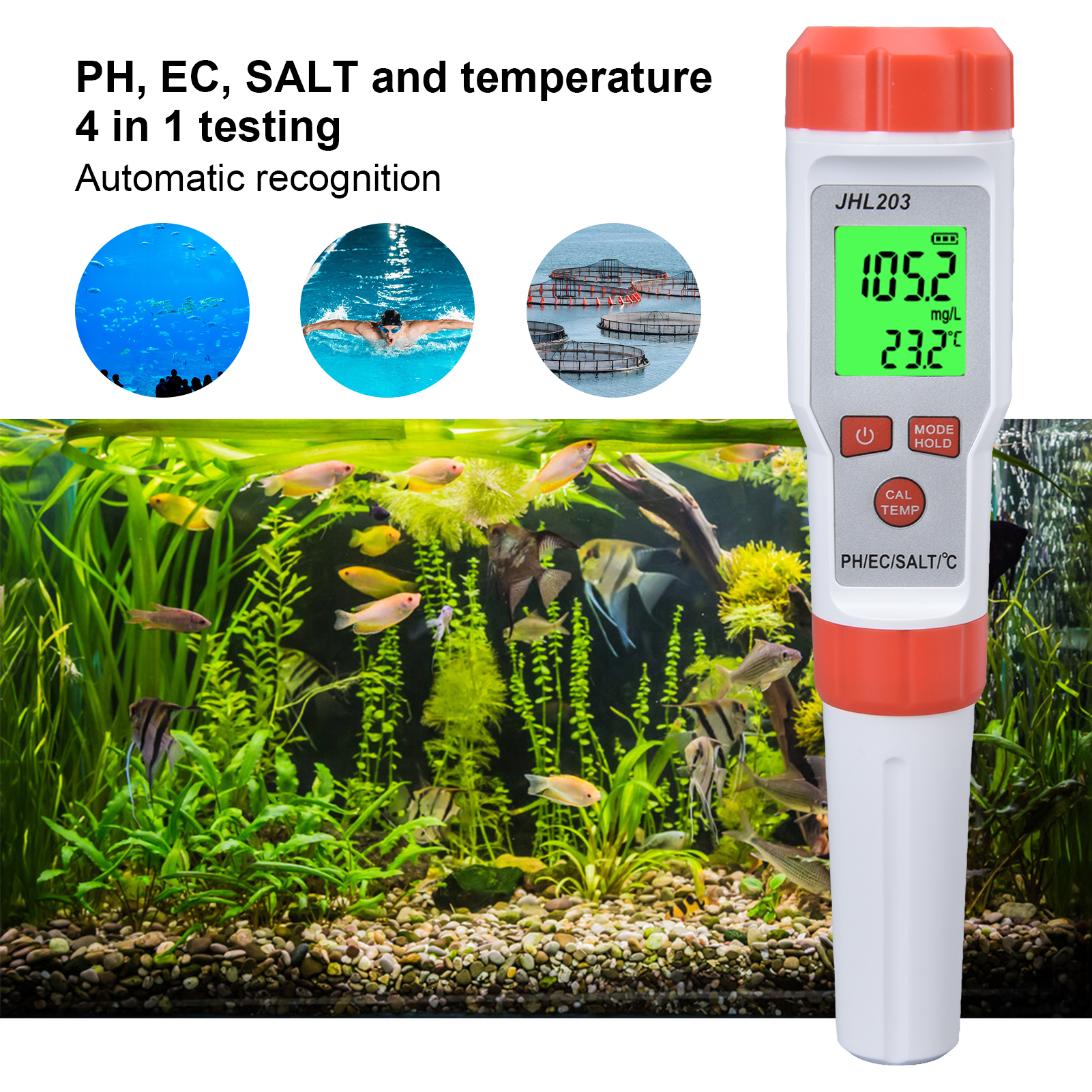 1、Multi Function: This 4 in 1 water tester supports PH, EC, SALT and temperature testing, providing more convenience. 2、High Accuracy: This 4 in 1 water tester features automatic recognition and automatic temperature compensation, which ensures high accuracy. 3、Wide Application: This 4 in 1 water tester is widely used drinking water, sewage treatment, water purification, fish tank, aquaculture, swimming pool, hydroponic, medical treatment and so on. 4、Backlit Function: This 4 in 1 water tester possesses backlit function, easy and convenient to read the results in dark environment. 5、Easy Operation: This 4 in 1 water tester is easy to operate, just immerse the pole in the solution and stir gently, then short press the "MODE" key.