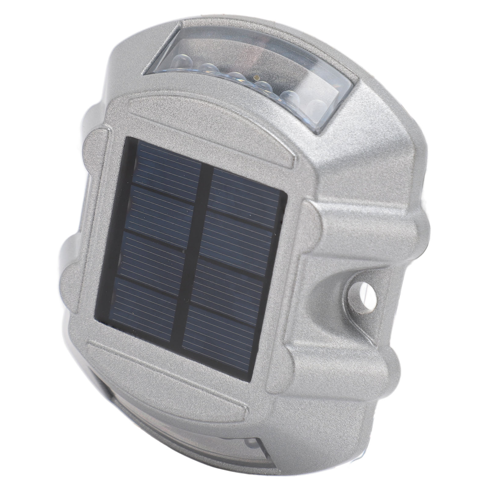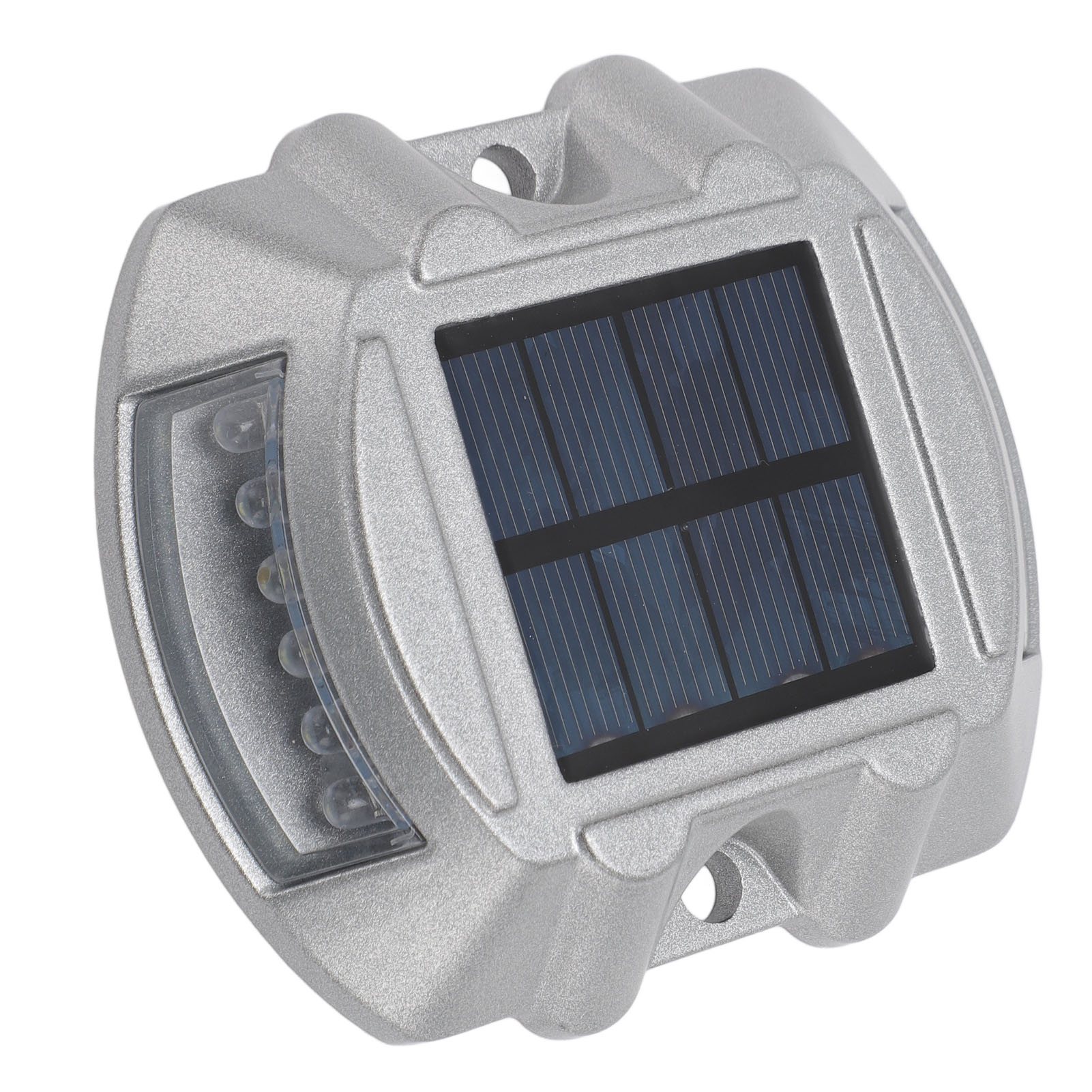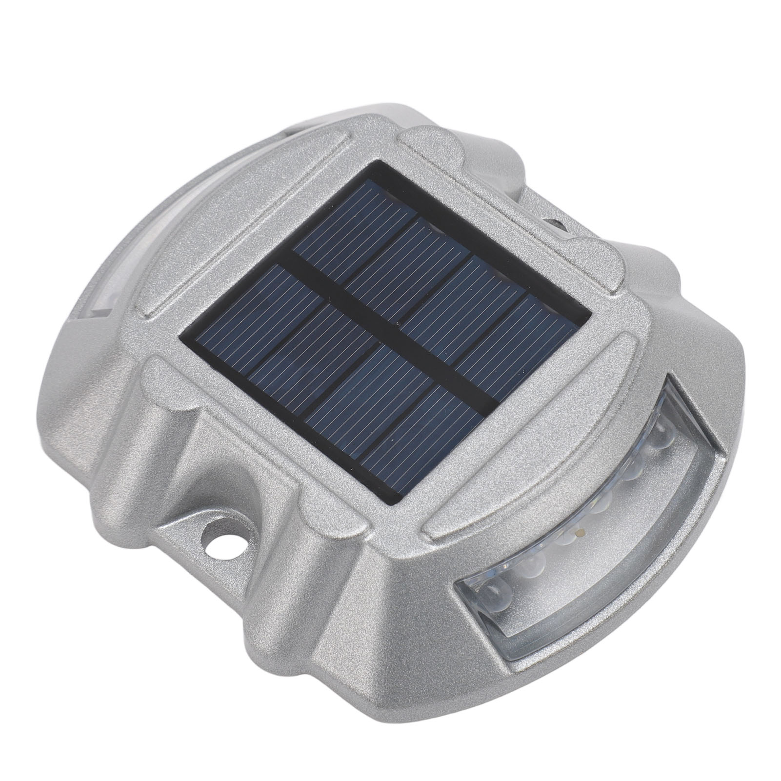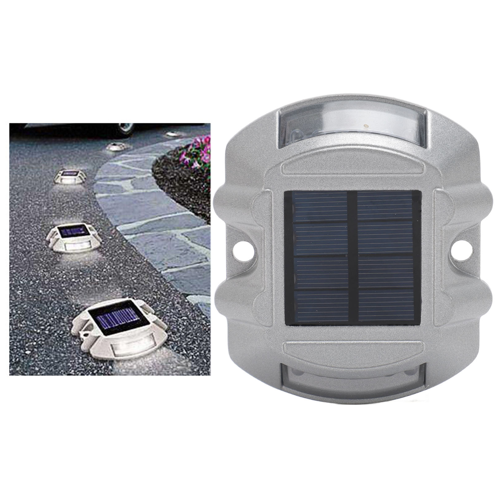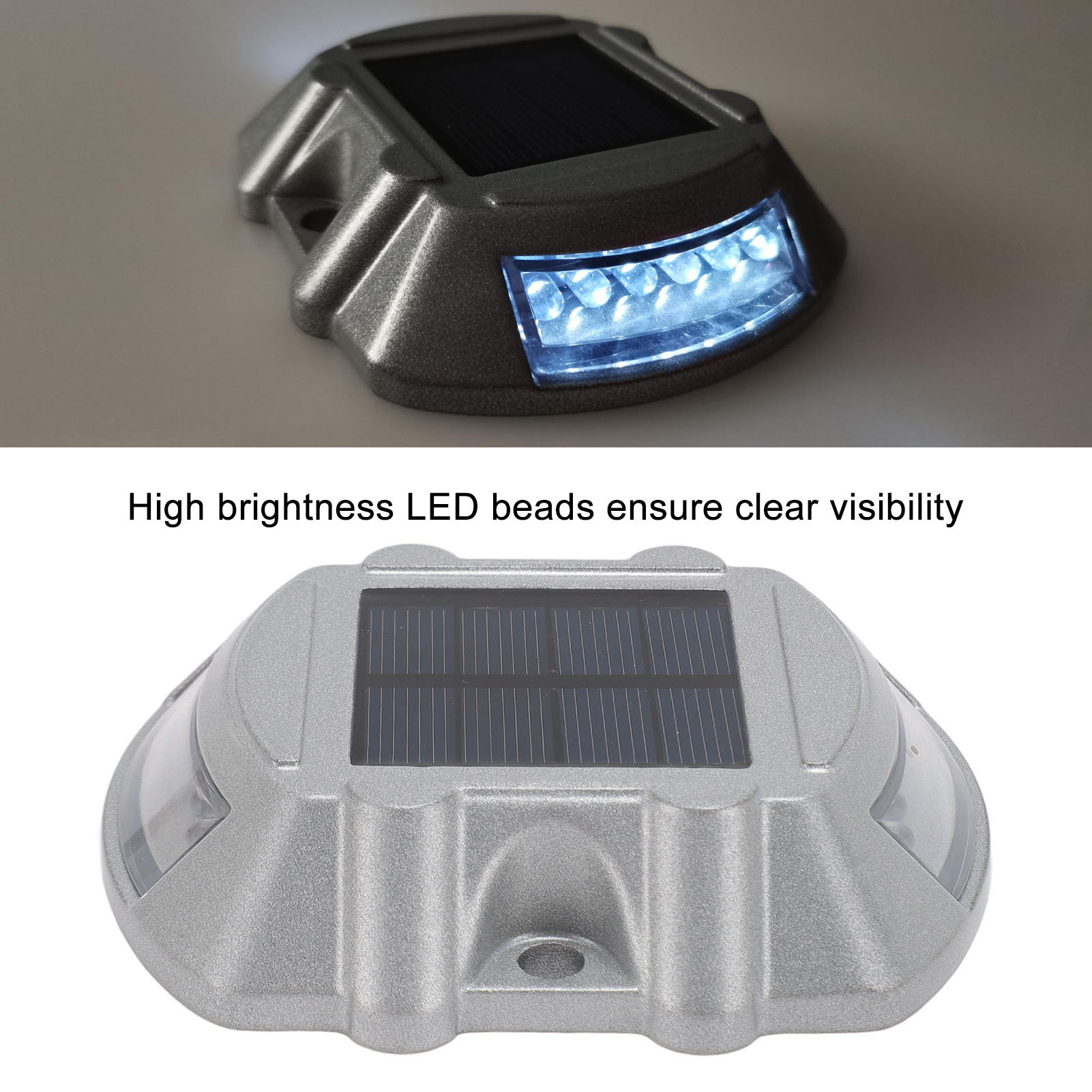 Material: Aluminum alloy1、HIGH DURABILITY: The solar road stud light is made of robust aluminum alloy material, ensuring its durability and longevity. Its compressive strength is greater than 10 tons, providing excellent resistance to external pressures. 2、CLEAR VISIBILITY: The road stud light features a high frequency flashing LED light source, providing a visibility distance of up to 800 meters. This ensures maximum visibility for drivers, even in poor weather conditions or during nighttime. 3、INTELLIGENT SENSING: Solar pathway marker features automated light control, lighting up automatically at night and turning off during the daytime. This smart energy efficiency helps ensure safer roads without any manual operation. 4、EFFICIENT SOLAR POWER: Equipped with a 6V 1.8W solar panel, the solar dock lights harnesses solar energy to power its LED lights. This ensures an eco friendly and energy efficient lighting solution, reducing the need for external power sources. 5、LONG WORKING TIME: With a built in 1.2V 800MAH Ni‑MH rechargeable battery, the road stud light offers a working time of 8‑10 hours. This allows for continuous and reliable illumination throughout the night, enhancing road safety. 6、WEATHERPROOF DESIGN: With an IP68 waterproof design, the driveway marker deck light operates efficiently in all types of adverse weather conditions, ensuring long lasting durability and reliable functionality.
