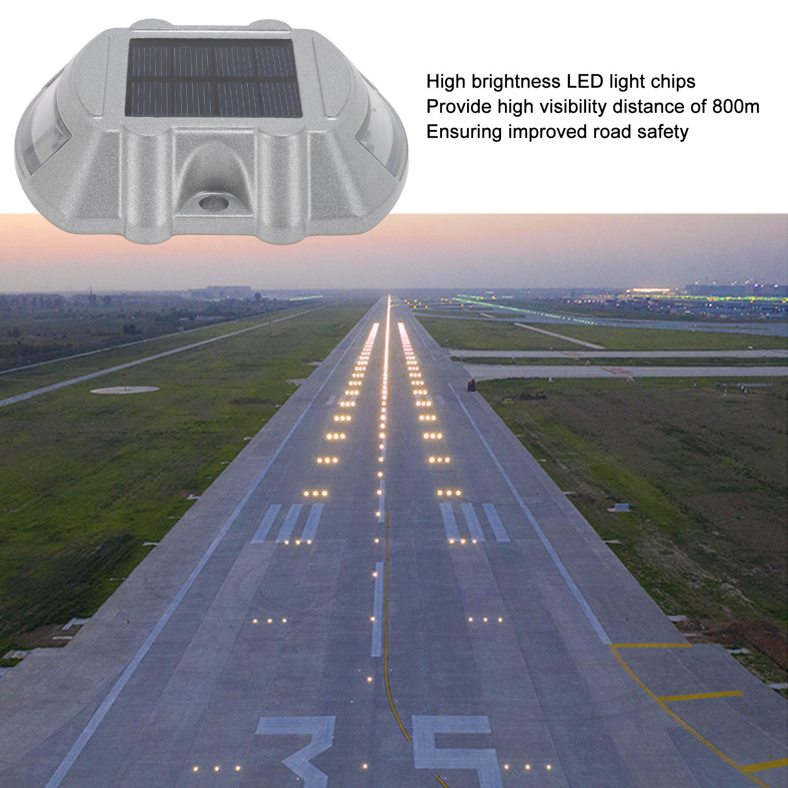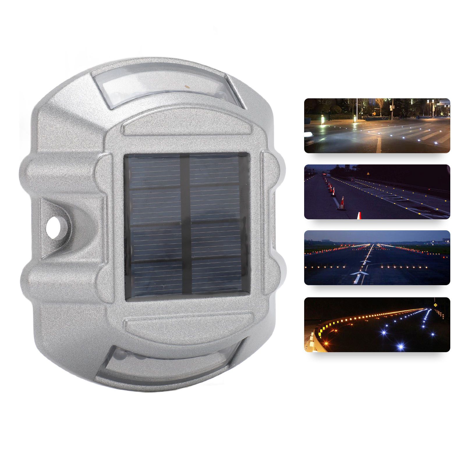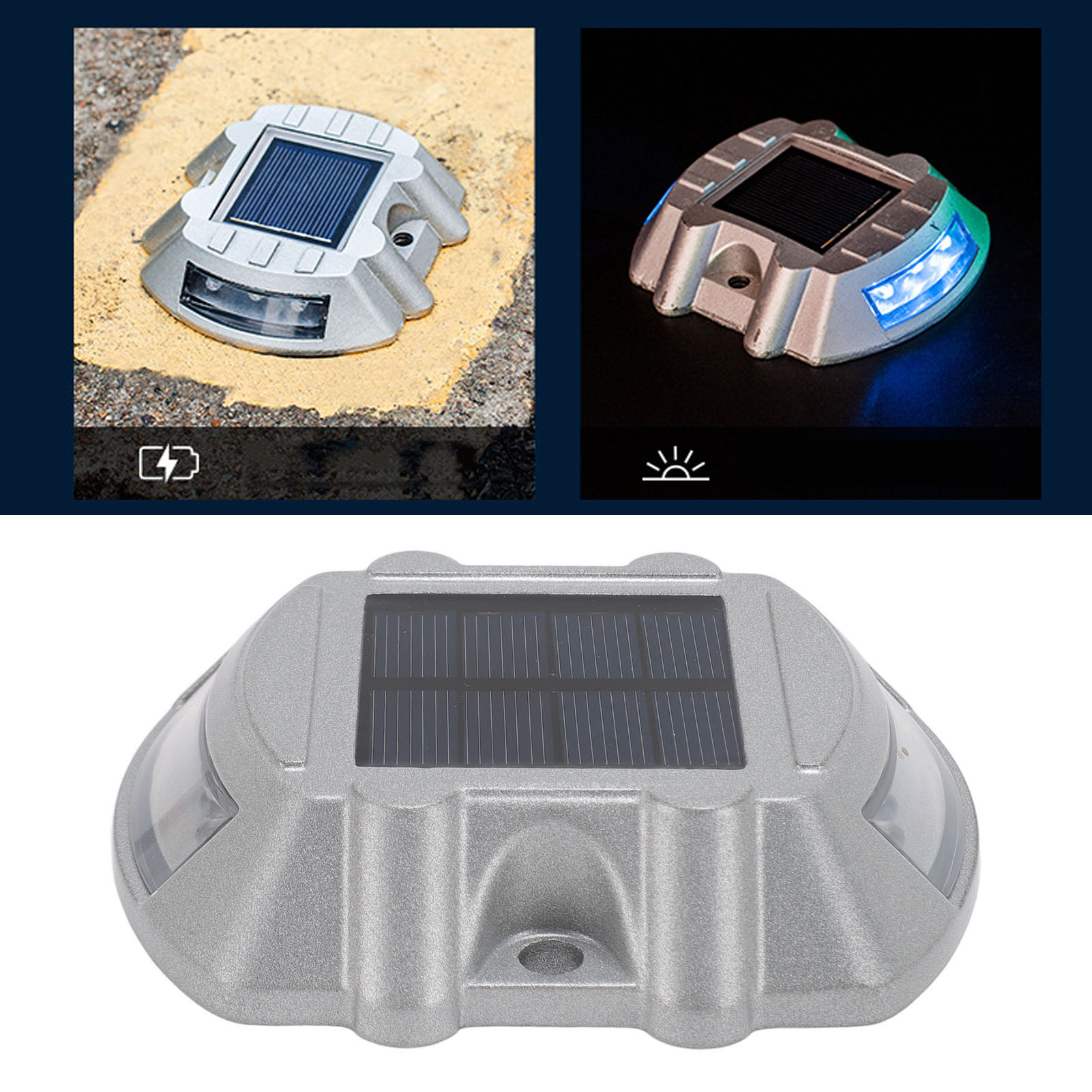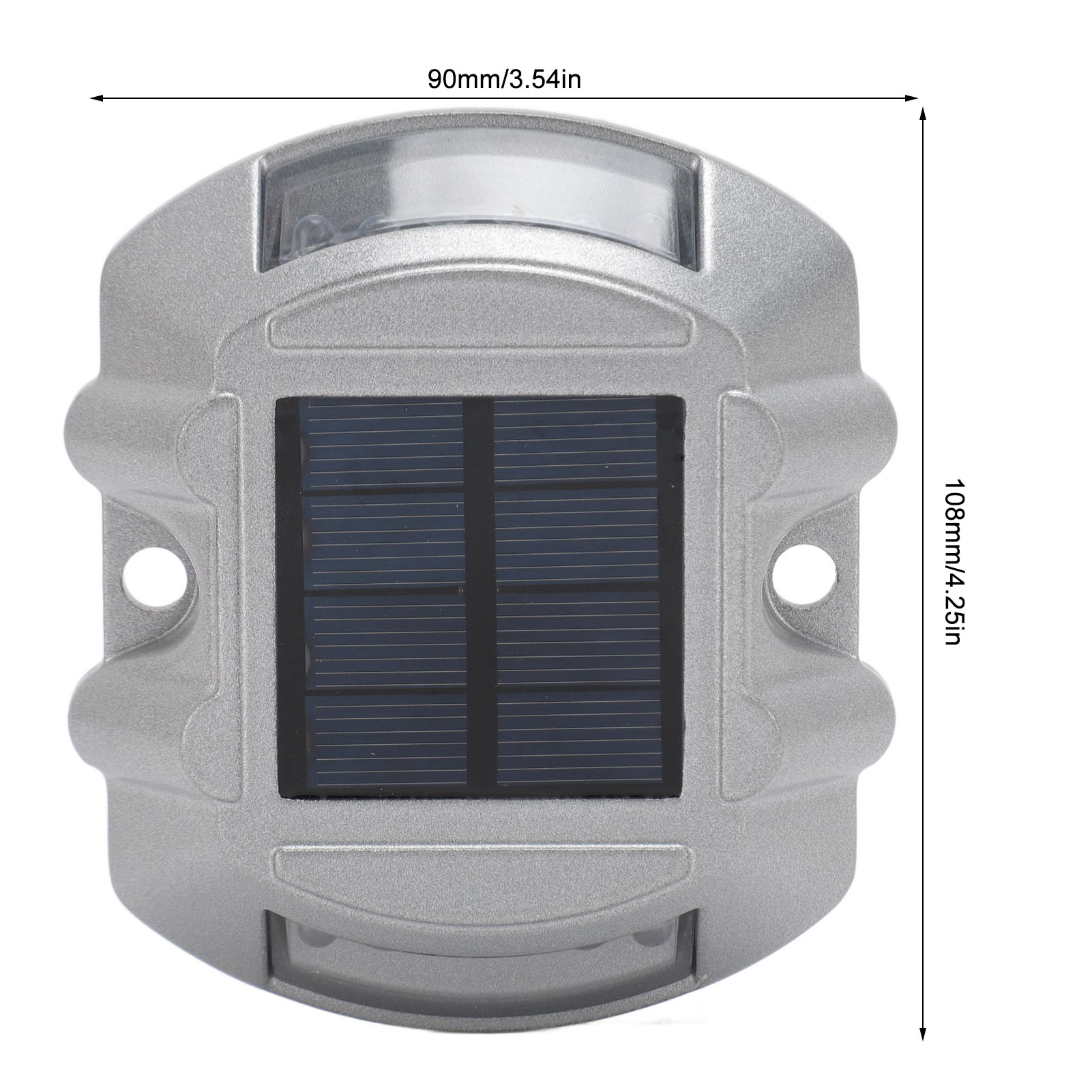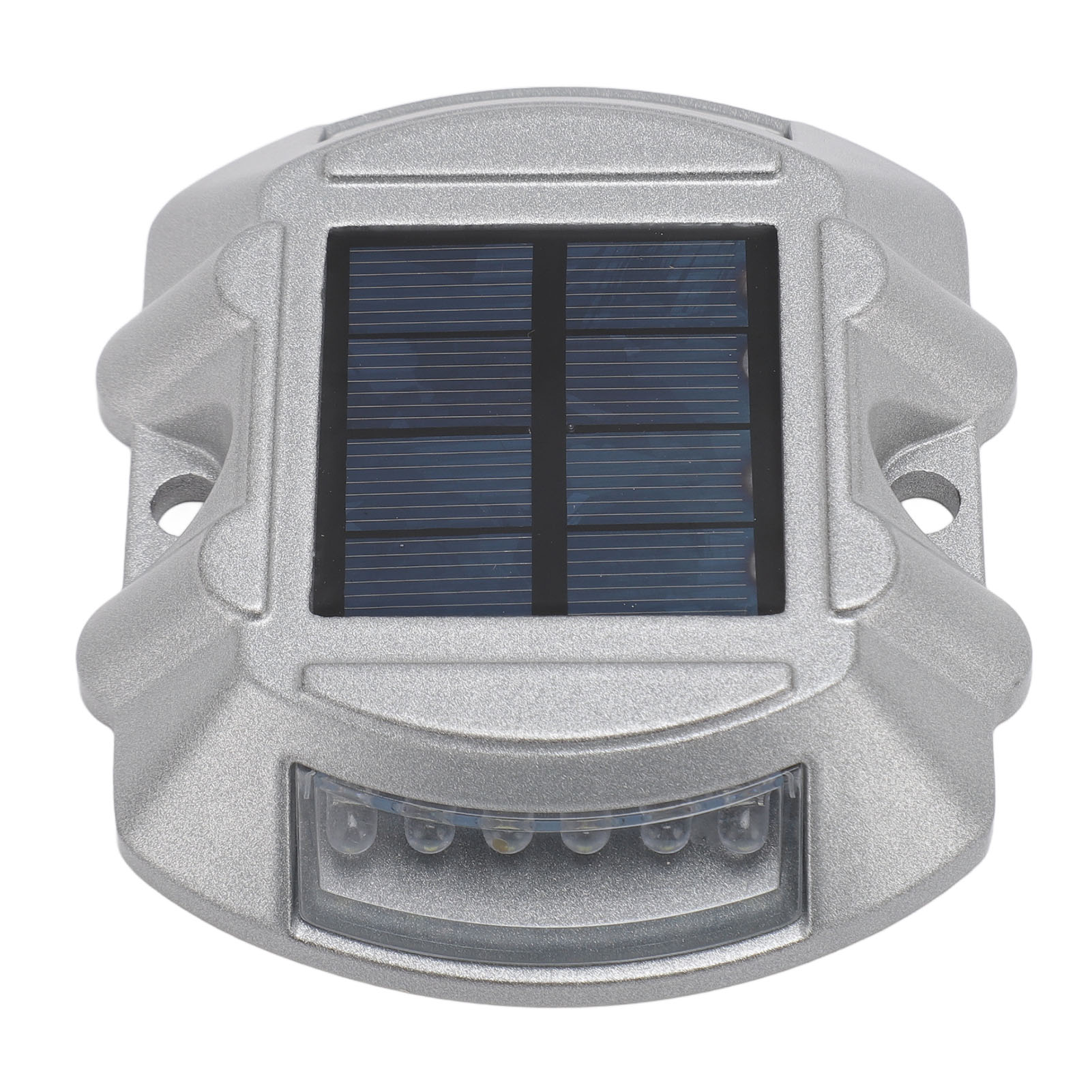 Material: Aluminum alloy1、HIGH DURABILITY: The solar road stud light is made of robust aluminum alloy material, ensuring its durability and longevity. Its compressive strength is greater than 10 tons, providing excellent resistance to external pressures. 2、CLEAR VISIBILITY: The road stud light features a high frequency flashing LED light source, providing a visibility distance of up to 800 meters. This ensures maximum visibility for drivers, even in poor weather conditions or during nighttime. 3、INTELLIGENT SENSING: Solar pathway marker features automated light control, lighting up automatically at night and turning off during the daytime. This smart energy efficiency helps ensure safer roads without any manual operation. 4、EFFICIENT SOLAR POWER: Equipped with a 6V 1.8W solar panel, the solar dock lights harnesses solar energy to power its LED lights. This ensures an eco friendly and energy efficient lighting solution, reducing the need for external power sources. 5、LONG WORKING TIME: With a built in 1.2V 800MAH Ni‑MH rechargeable battery, the road stud light offers a working time of 8‑10 hours. This allows for continuous and reliable illumination throughout the night, enhancing road safety. 6、WEATHERPROOF DESIGN: With an IP68 waterproof design, the driveway marker deck light operates efficiently in all types of adverse weather conditions, ensuring long lasting durability and reliable functionality.