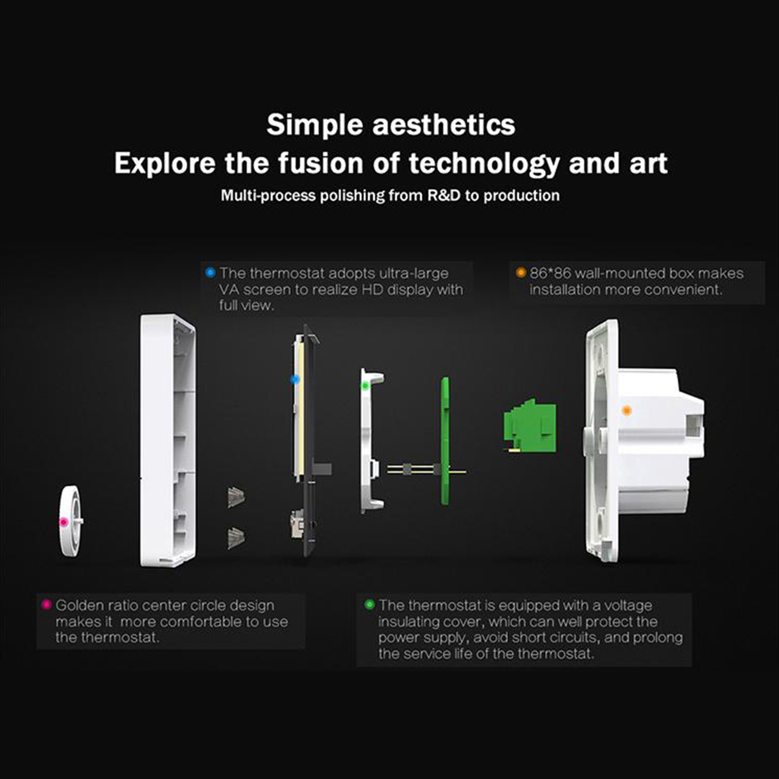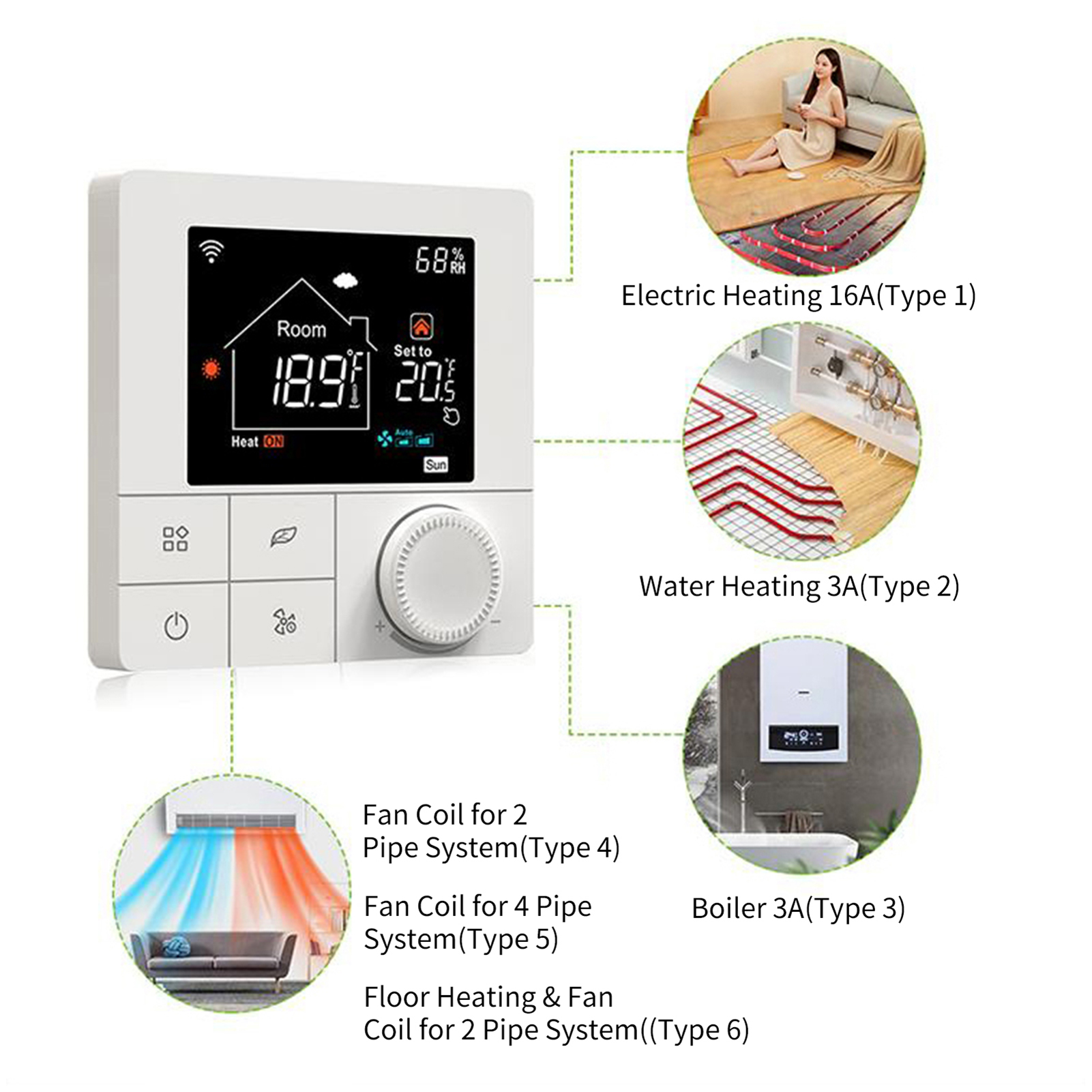 1、[Smart Control]Supports application operation, easier for scheduling programs, set functions, and checks current states by the application. 2、[Weekly programmable]Smart thermostat support up to 6 events that can be set separately for each day. 3、[Voice Control]You can use voice control through for Home for smart thermostats. 4、[Handwheel Design]Handwheel operation setting temperature can be specified precisely and intuitively (stepping by0.5°C). 5、[Multifunctional]With a 2.8inch large LCD screen, support weather forecast, frost protection function, child lock function, etc.