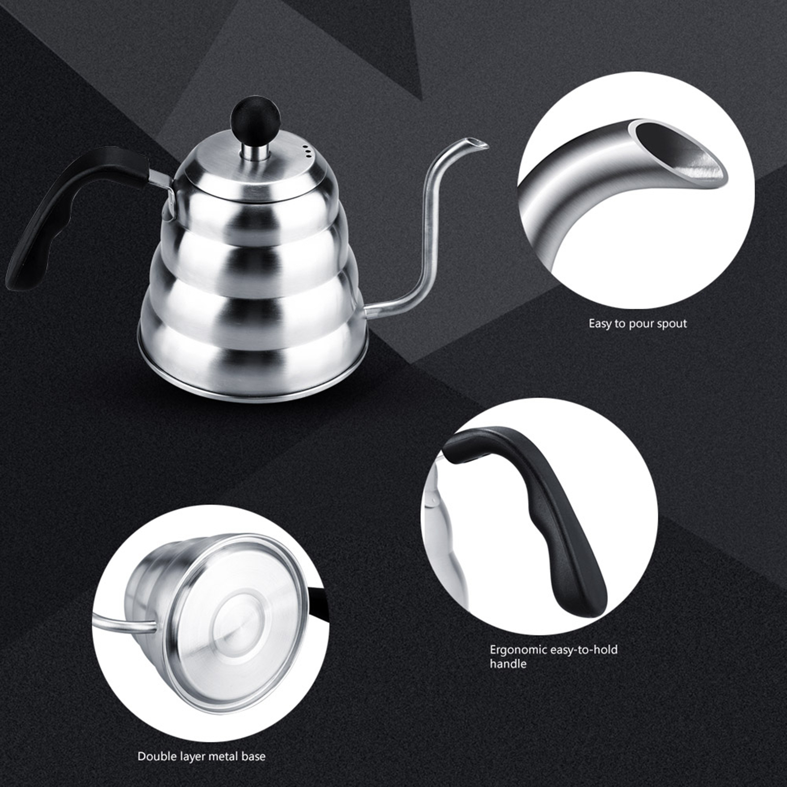• This drip coffee kettle is made from premium surgical-grade stainless steel, has an easy to pour spout, with an ergonomic easy-to-hold handle.