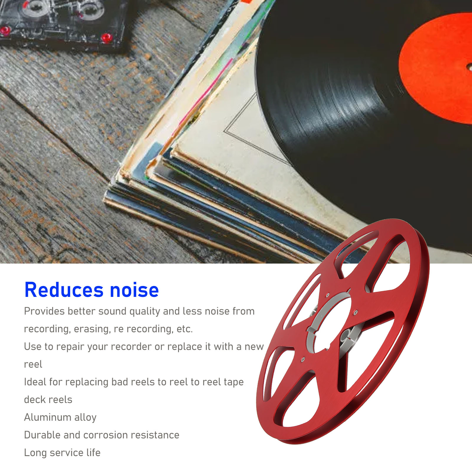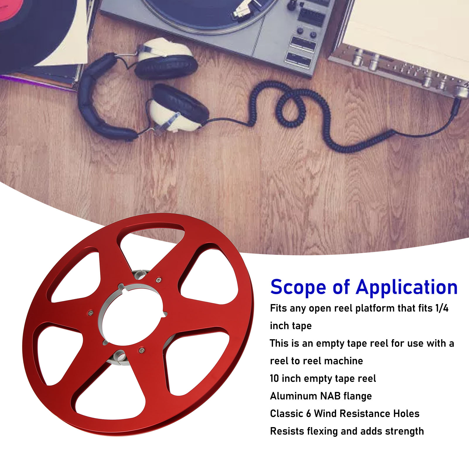 1、SCOPE OF APPLICATION: 6 hole empty tape reel fits any open reel platform that fits 1/4 inch tape. This is an empty tape reel for use with reel to reel machines. 2、6 WIND RESISTANCE HOLES: Recording takeup reel features an aluminum nab flange with classic 6 wind resistance holes to resist bending and add strength. 3、NOISE REDUCTION: 1/4 10 inch empty tape reel gives you better sound quality and less noise from recording, erasing, and re recording. 4、ALUMINUM ALLOY: 10 inch takeup reel is made of aluminum alloy for durability, corrosion resistance and long life. Long lasting playback of analog recording tape reels. 5、PERFECT REPLACEMENT: Empty tape reel can be used to repair your recorder or replace it with a new reel, perfect for replacing bad reels to reel to reel tape deck reels.