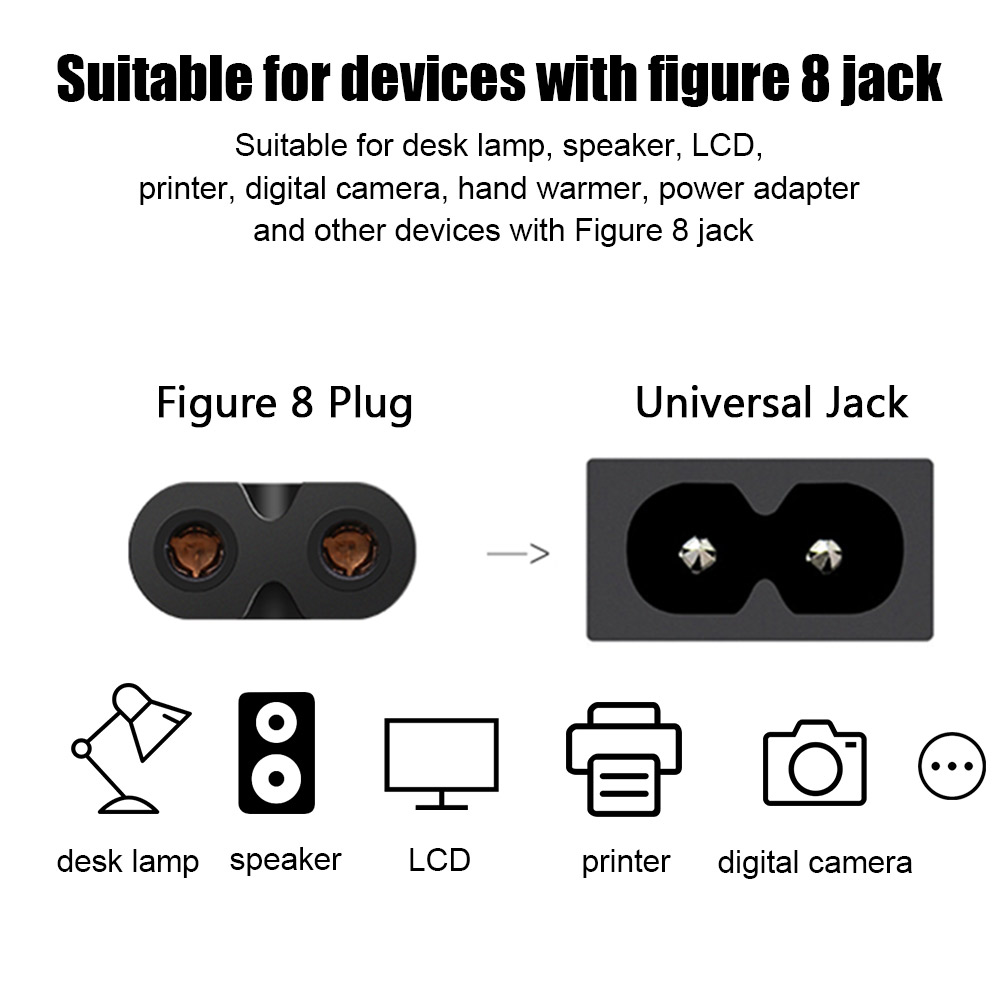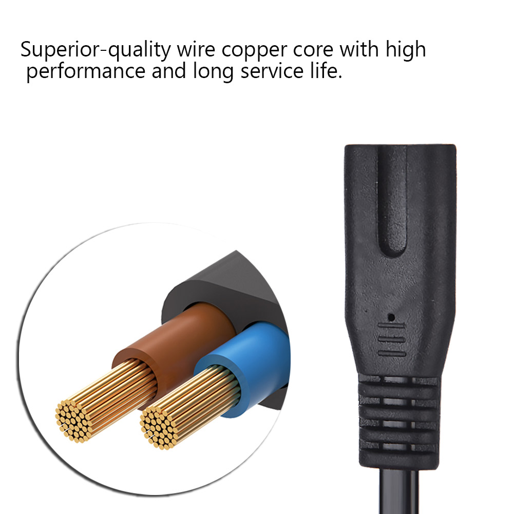 1、Environmentally friendly PVC can protect the wire effectively, wear-resistance and anti-interference. 2、High quality copper core has long service life. 3、Tin-plated copper plug has good conductivity. 4、No heating and high temperature resistance can ensure long-term safety of using electricity. 5、Compatible with devices supported figure 8 plug such as monitor, printer, digital camera, charger of speaker, scanner, household appliances, industrial equipment, charger of battery, etc.