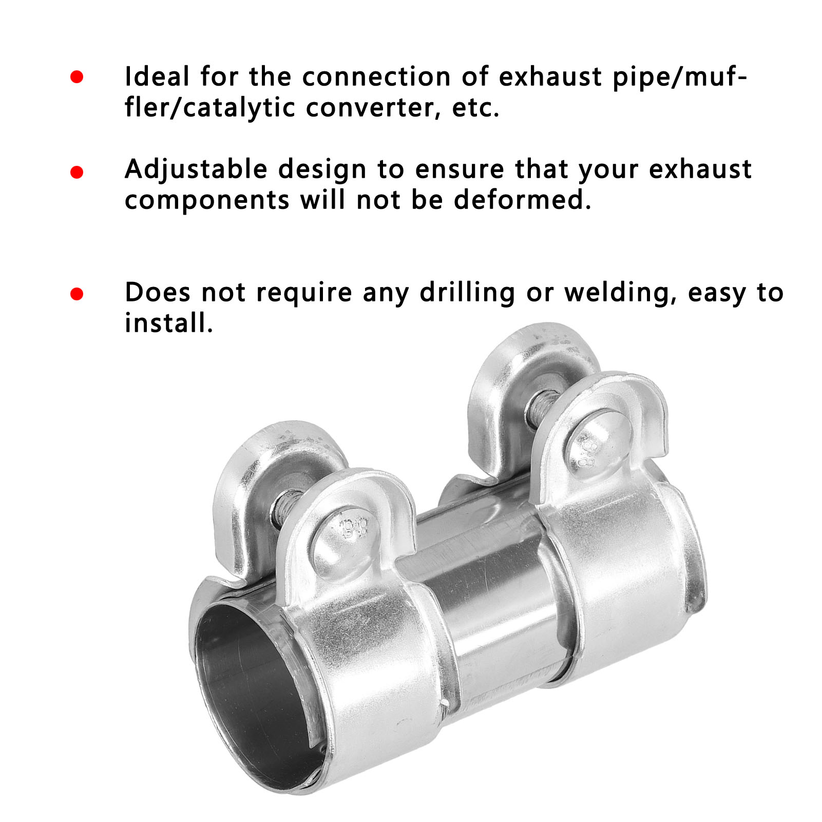 1、With a diameter of 1.4in and a length of 3.7in, ideal for the connection of exhaust pipe/muffler/catalytic converter, etc. 2、Integrated structure can minimize the complexity of the number of parts and maximize material efficiency while reducing weight. 3、Adjustable design to ensure that your exhaust components will not be deformed, allowing the flexibility to disassemble for service. 4、Using stainless steel material, it is not easy to rust, corrosion‑resistant, wear‑resistant, long durability. 5、The clamp does not require any drilling or welding, easy to install and convenient to use.