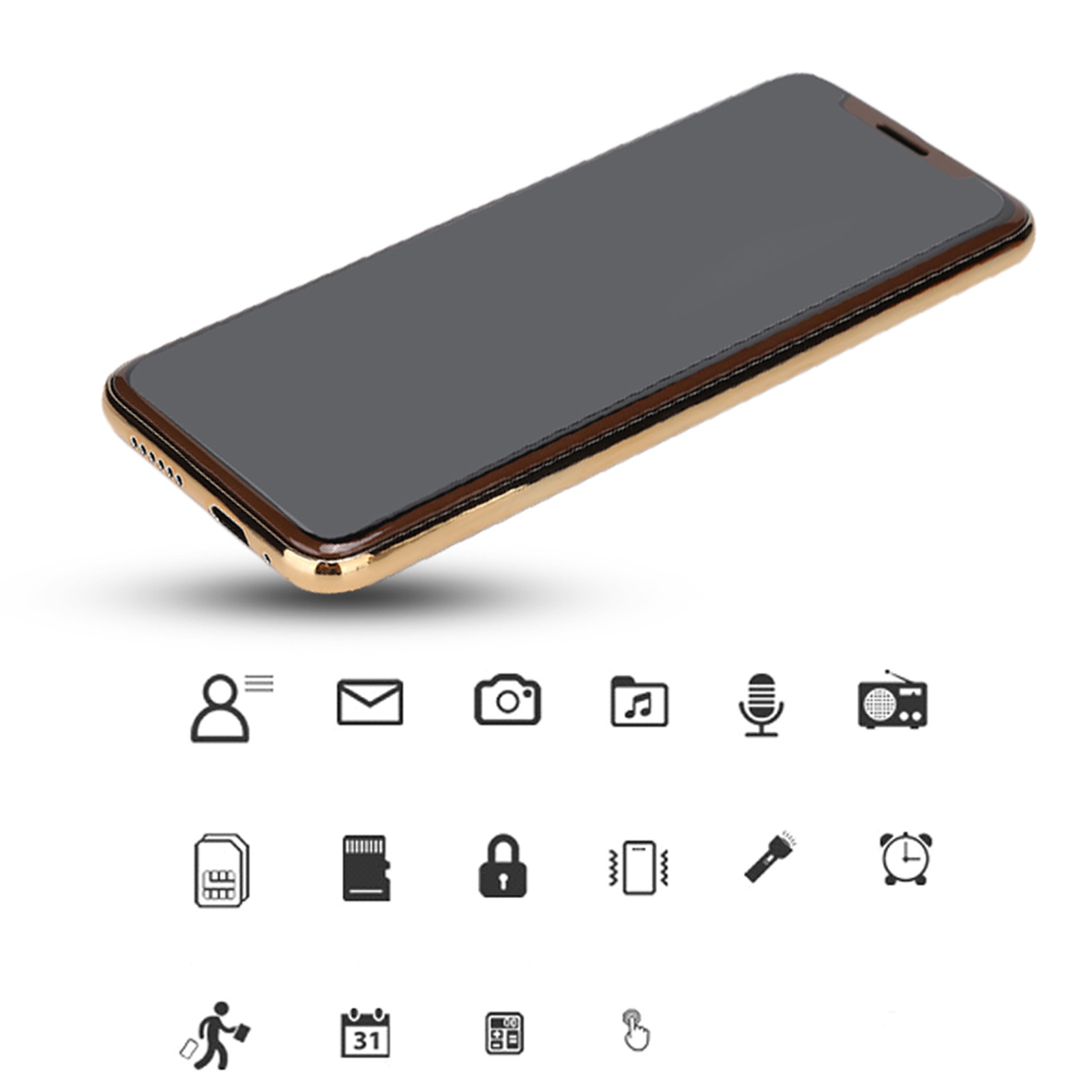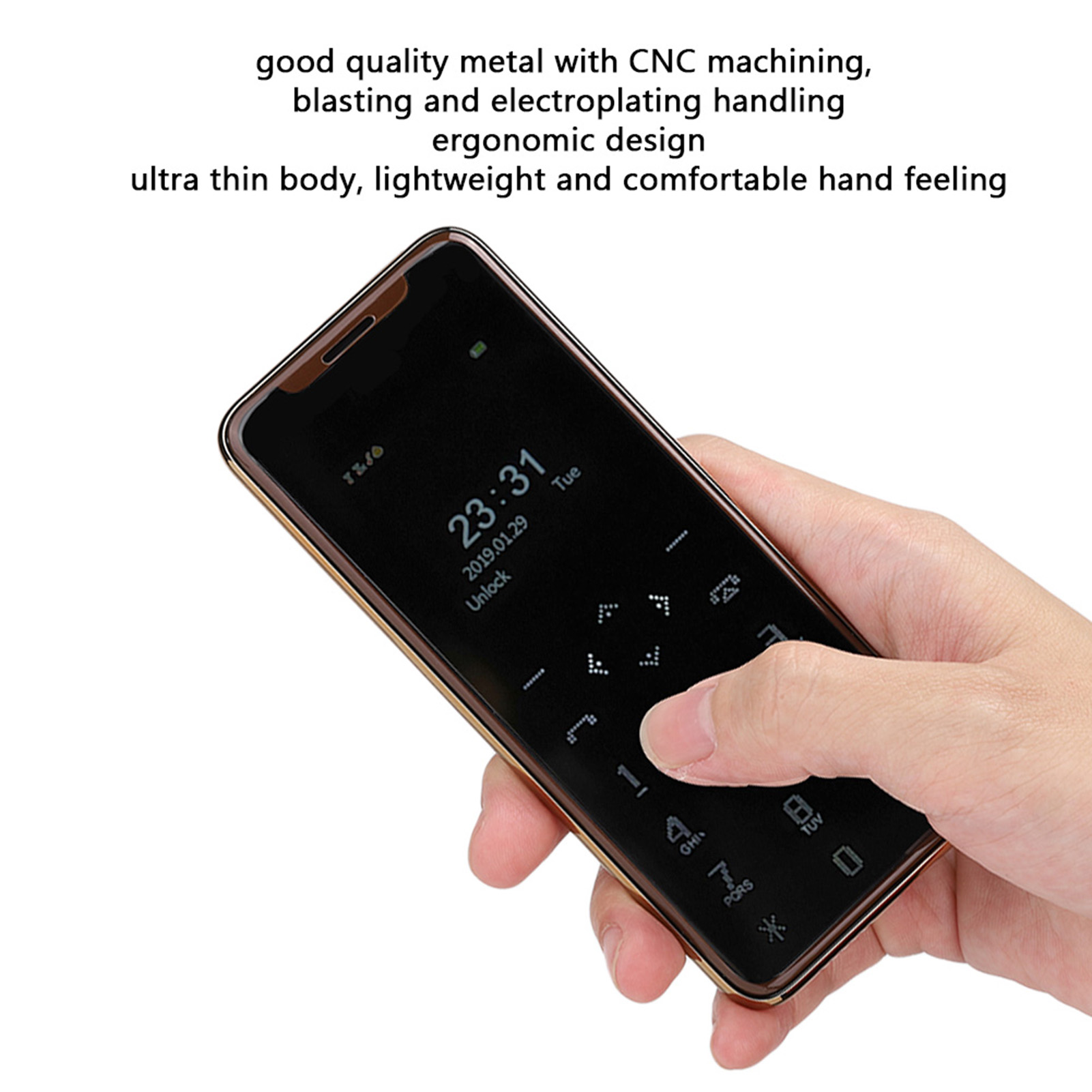1、1.54 inch high definition screen, 128x128 pixel resolution, support dual nano SIM card dual standby, easy to use. 2、Adopts MTK processor, high performance, smooth operation, low power consumption, fast operating for program and function menus. 3、3D arc tempered glass panel, high hardness, anti-scratch, wear-resistant, smooth and comfortable hand feeling, sensitive touch. 4、Adopts good quality metal with CNC machining, blasting and electroplating handling, ergonomic design, ultra thin body, lightweight and comfortable hand feeling. 5、With various of useful functions: phone book, message, camera, radio, Bluetooth, alarm clock, calendar, flashlight, and other functions.