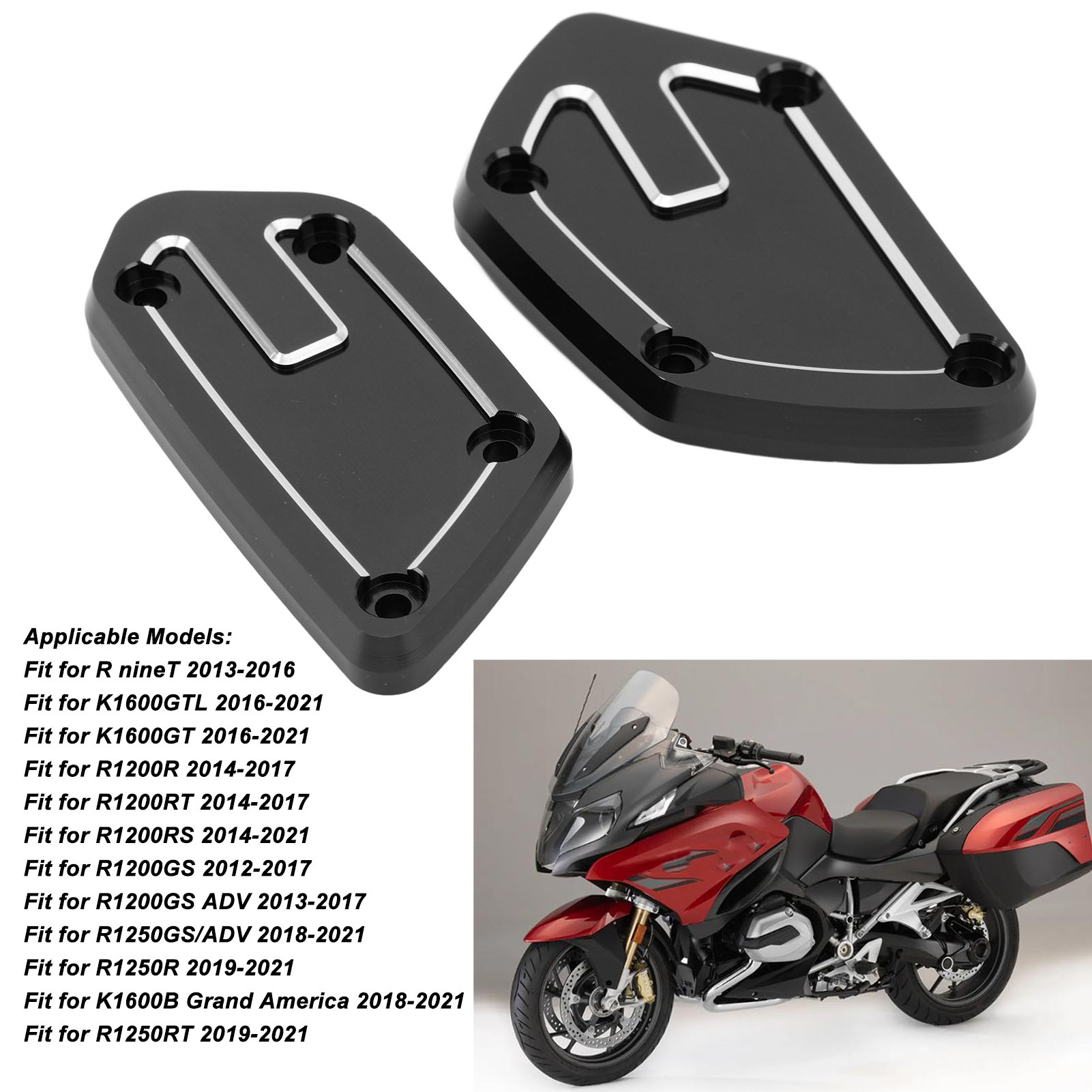 1、APPLICABLE MODELS: Specially designed for R nineT 2013‑2016, for K1600GTL 2016‑2021, for K1600GT 2016‑2021, for R1200R 2014‑2017, for R1200RT 2014‑2017, etc. 2、ENHANCE SAFETY: The oil pump cover protects the pump from external environment damage, collisions, or falls, reducing the risk of damage, ensuring safety on the road. 3、BOOSTED AESTHETICS: These caps boasts a unique design, adding a touch of personality and decorativeness to your motorcycle, making your motorcycle more appealing. 4、DURABLE AND RELIABLE: Made from CNC aluminum alloy, these covers are built to last. They can withstand various weather conditions and offers excellent protection for the pump. 5、SIMPLE INSTALLATION: Designed for easy installation. Simply remove the old cover and replace it with this upgraded version. No additional modifications or tools are required.