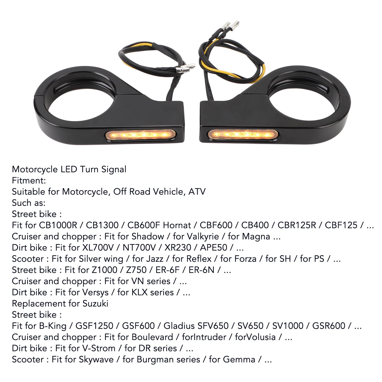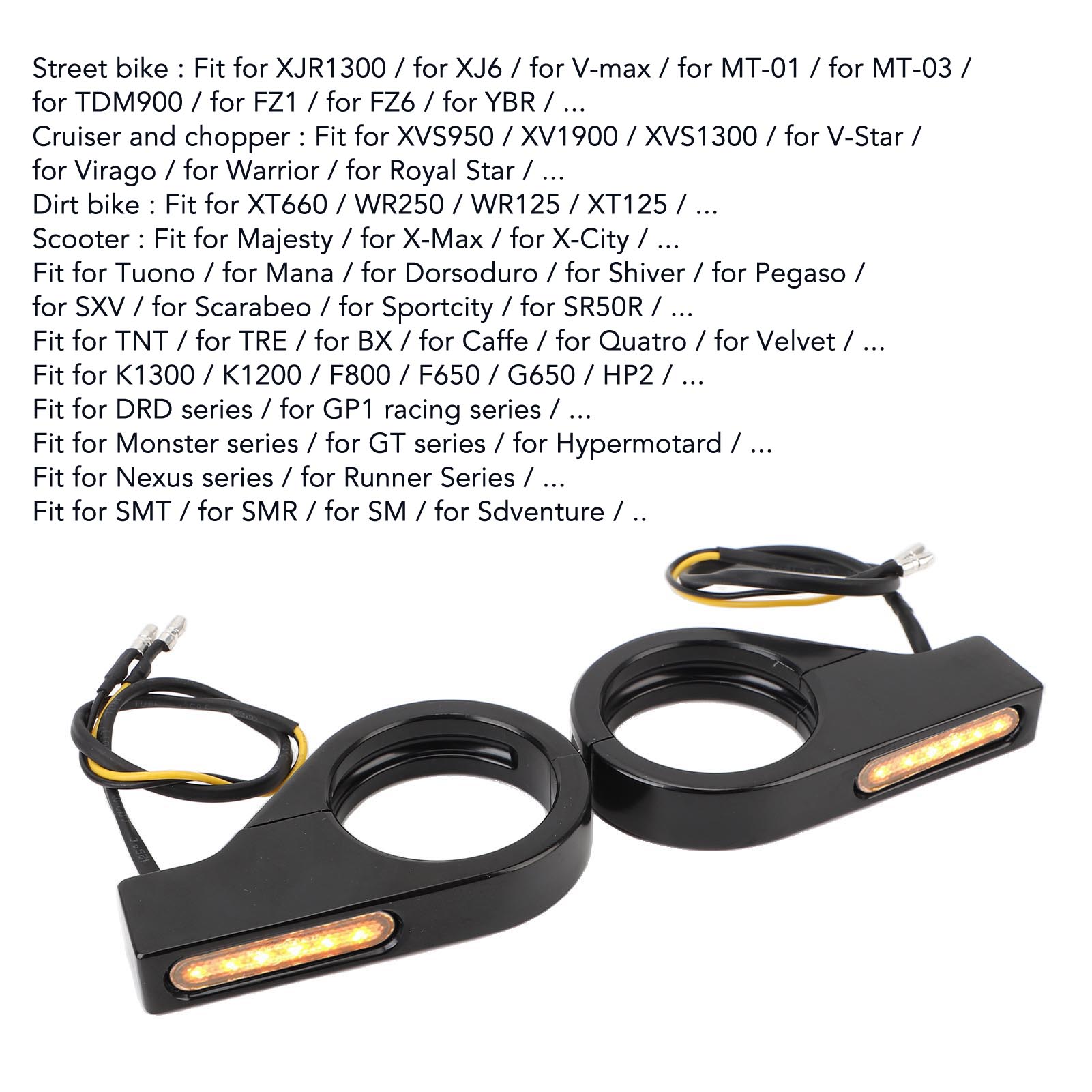 1、Applicable Model: The motorcycle LED turn signal is suitable for motorcycle, off road vehicle, ATV, for CB1000R Shadow XL700V Silver wing, for Z1000 VN series Versys, replacement for Suzuki B‑King Boulevard V‑Strom Skywave, for XJR1300 XVS950 XT660 Majesty Tuono TNT K1300 DRD Monster Nexus SMT. 2、Safer Riding: The LED turn signal running light has high lighting intensity and stable power, to make your vehicle safer to drive and easier to spot. 3、Sporty and Stylish: The handlebar blinker indicator lamp has stylish and sporty appearance, enhancing the overall aesthetic of your motorcycle. 4、Easy Installation: The turn signal blinker indicator lamp has a simple installation, convenient and time saving, don't need too much tools or complicated steps. 5、Durable Construction: The handlebar indicator blinker light is made of ABS and metal material, durable and reliable, high strength, not easy to rust and deform, ensuring long lasting use.