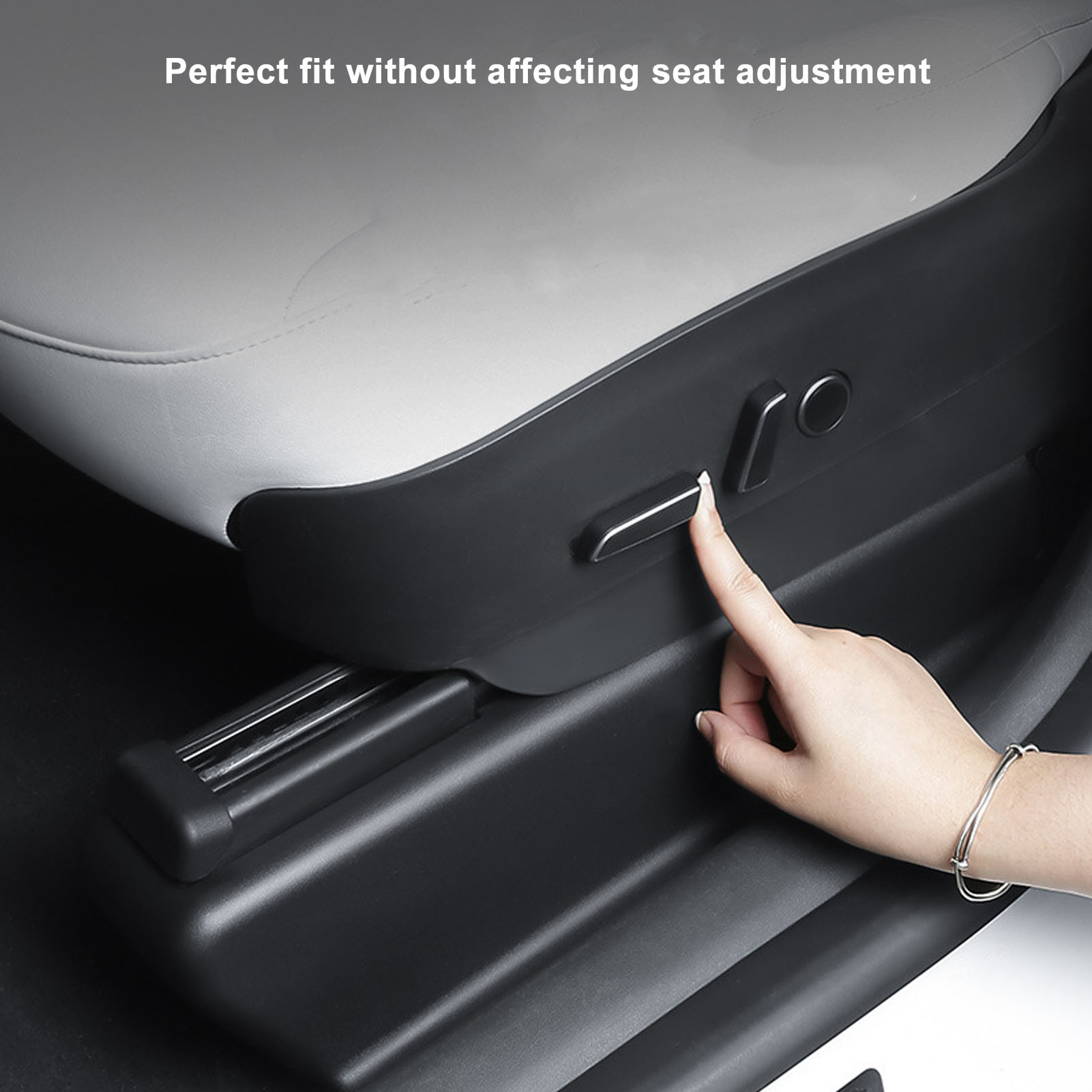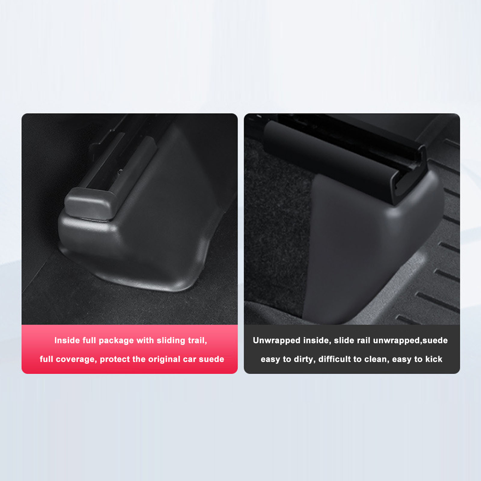 1、Applicable Model: The seat slide rail cover protector is specifically designed, replacement for Tesla Model Y 2021 to 2023, ensuring a seamless fit without interfering with the use of floor mats. 2、Protective Function: The seat slide rail cover provides perfect protection for car seat, safeguarding your original seats from scratches, wear, and stains and extending the lifespan of your car. 3、Easy to Clean: The seat slide rail covers can be easily wiped clean with a damp cloth, restoring them to their original state. No need to worry about dirt, shoe marks, or pet fur. 4、Perfect Fitness: Seat corner anti kick wrap is mold opened according to the original car size, dedicated to the special car model, direct replacement, perfectly fit your car. 5、Easy Installation: The under seat anti kick pad cover can be installed in just a few minutes or even less. No tools or professional skills are required, simply slide the corner covers into the original seat rail and align them correctly.