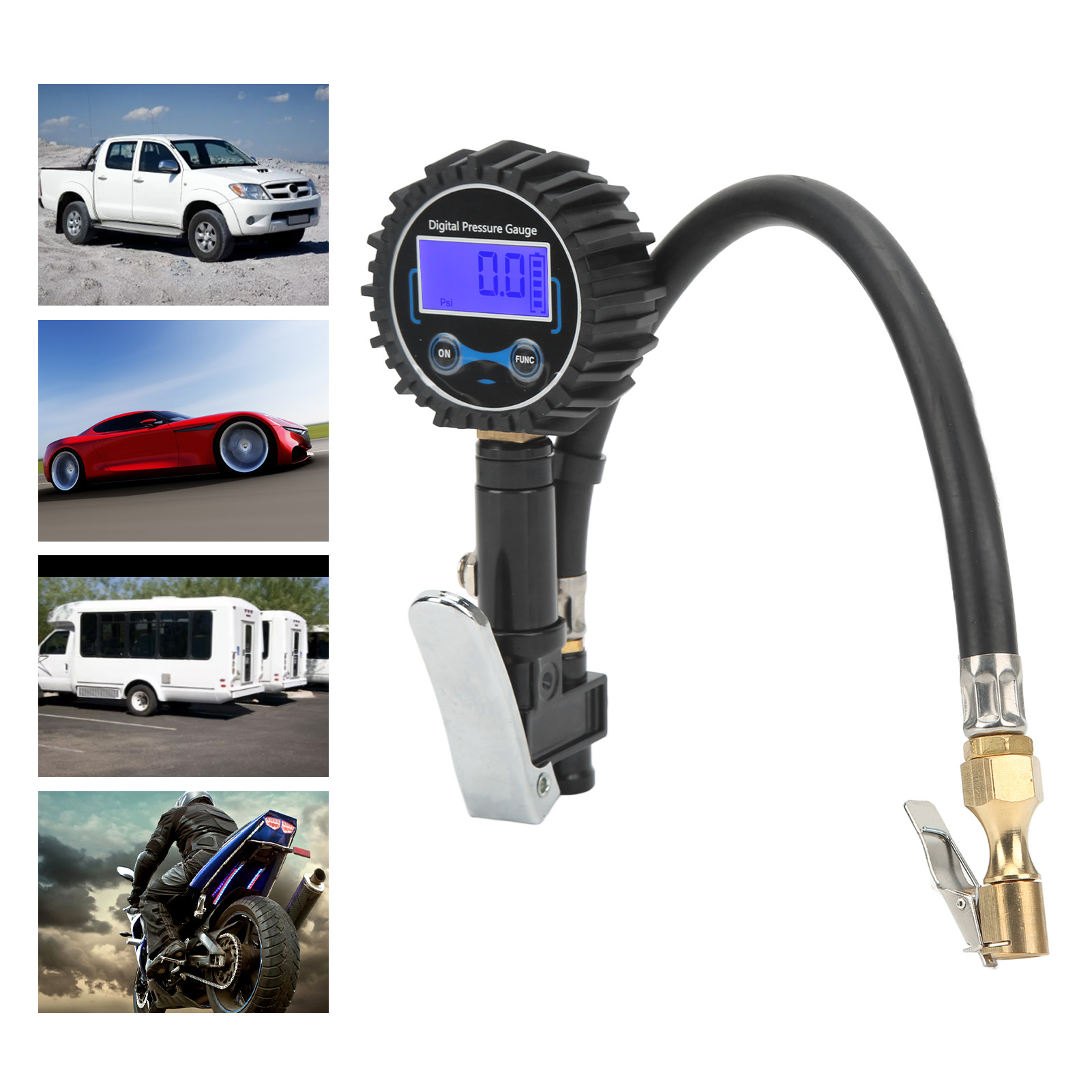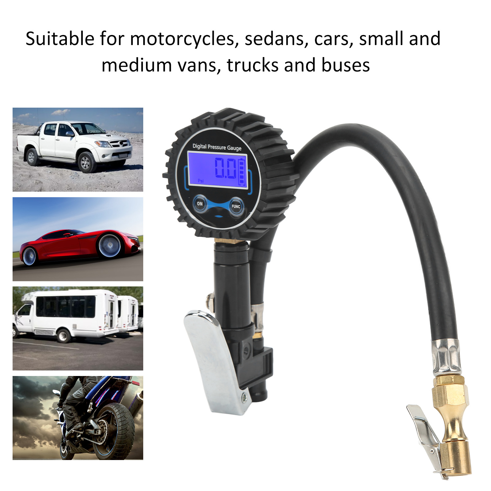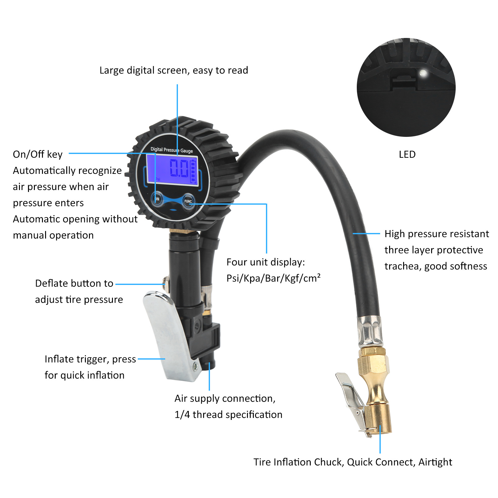 1、Multifunctional: The tire pressure gauge supports up to 200PSI, and the accuracy is within ±1 PSI. In addition to reading tire pressure, it can also deflate and inflate. 2、4 Pressure Units: Comes with 4 optional units: PSI, BAR, KG/CM², KPA for a wide range of applications, from bicycles to heavy trucks. 3、Large Digital Display Screen: The digital tire pressure gauge is easy to correct the pressure, easy to read, and can display the test value in 2‑3s. 4、Automatic Off: If there is no operation for 15 seconds, it will automatically turn off to save battery power. Data can be read clearly even in the dark. 5、Durable Material: Quality aluminum alloy, brass, thickened silicone protective cover and heavy duty rubber hose ensure durability and sturdiness.