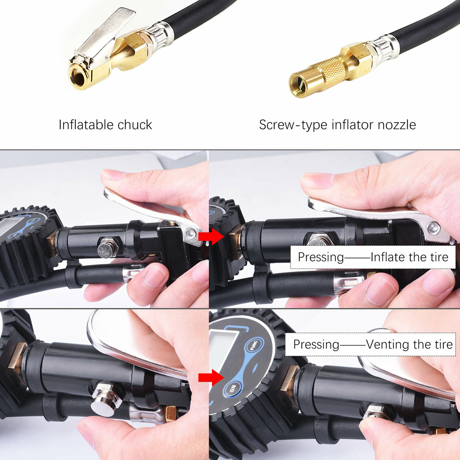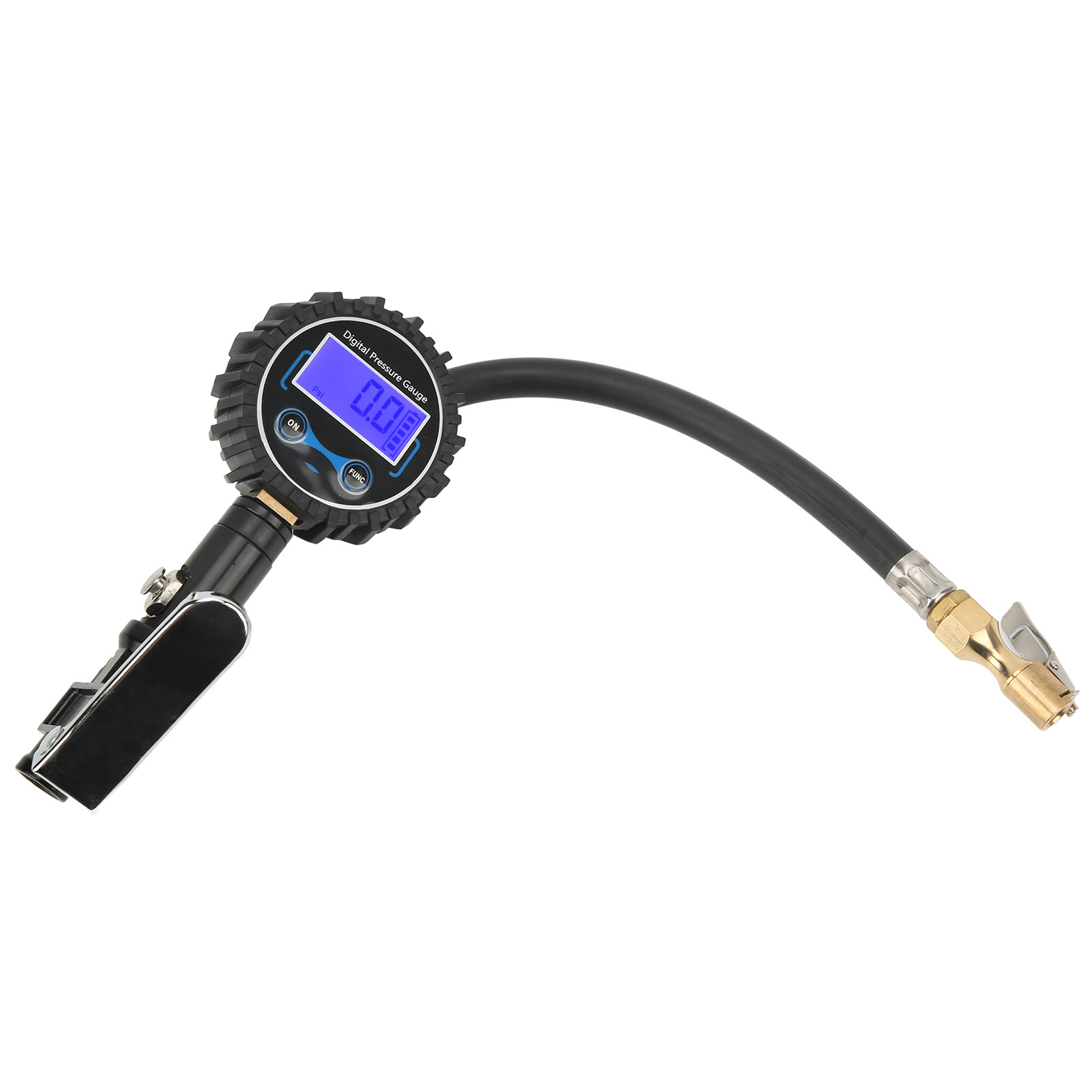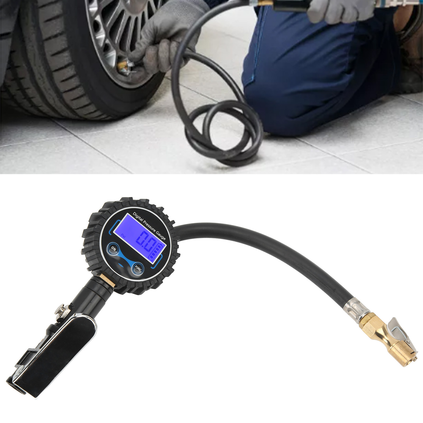 1、Multifunctional: The tire pressure gauge supports up to 200PSI, and the accuracy is within ±1 PSI. In addition to reading tire pressure, it can also deflate and inflate. 2、4 Pressure Units: Comes with 4 optional units: PSI, BAR, KG/CM², KPA for a wide range of applications, from bicycles to heavy trucks. 3、Large Digital Display Screen: The digital tire pressure gauge is easy to correct the pressure, easy to read, and can display the test value in 2‑3s. 4、Automatic Off: If there is no operation for 15 seconds, it will automatically turn off to save battery power. Data can be read clearly even in the dark. 5、Durable Material: Quality aluminum alloy, brass, thickened silicone protective cover and heavy duty rubber hose ensure durability and sturdiness.