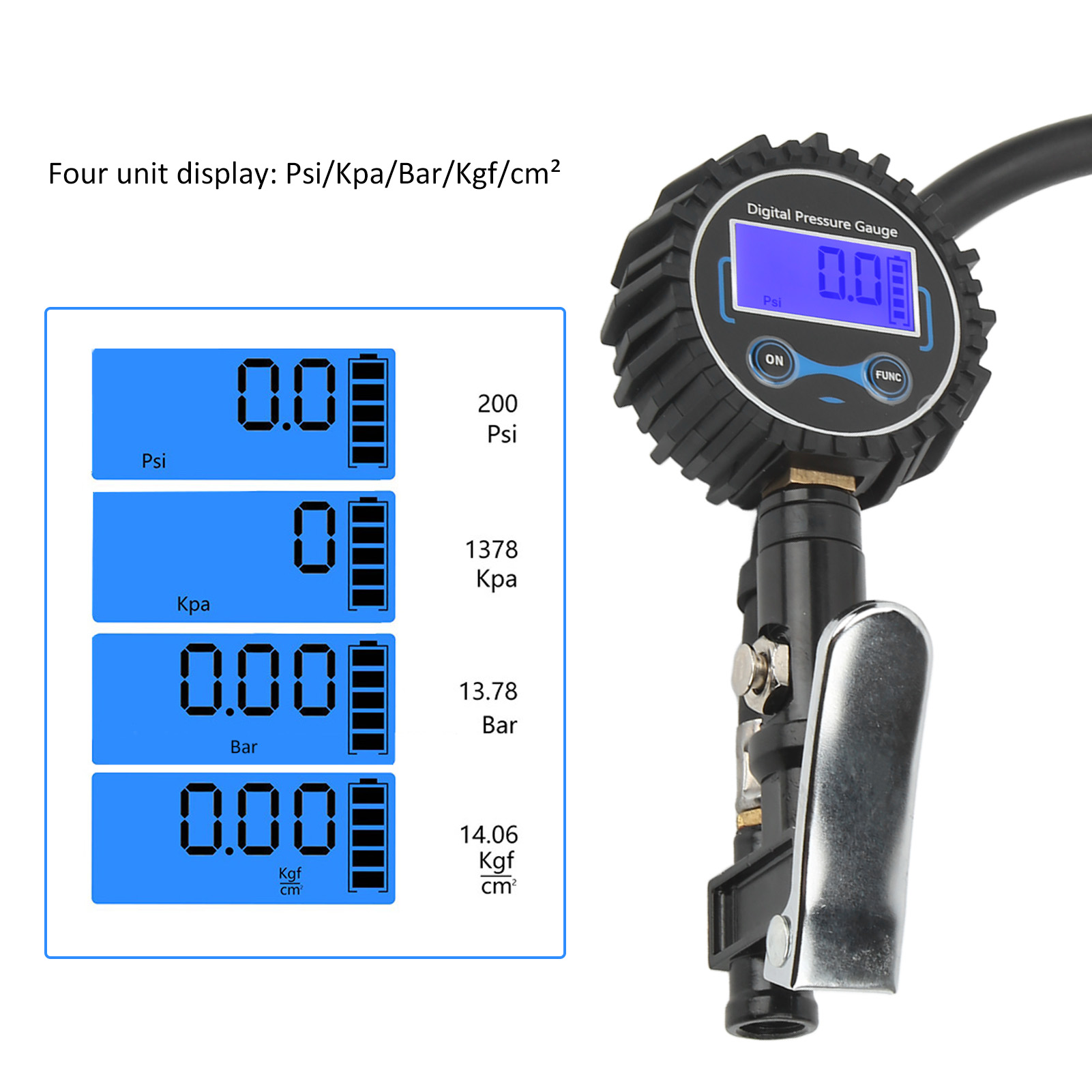 Four Pressure Units: Psi, Kpa, Bar , Kgf/cm²
