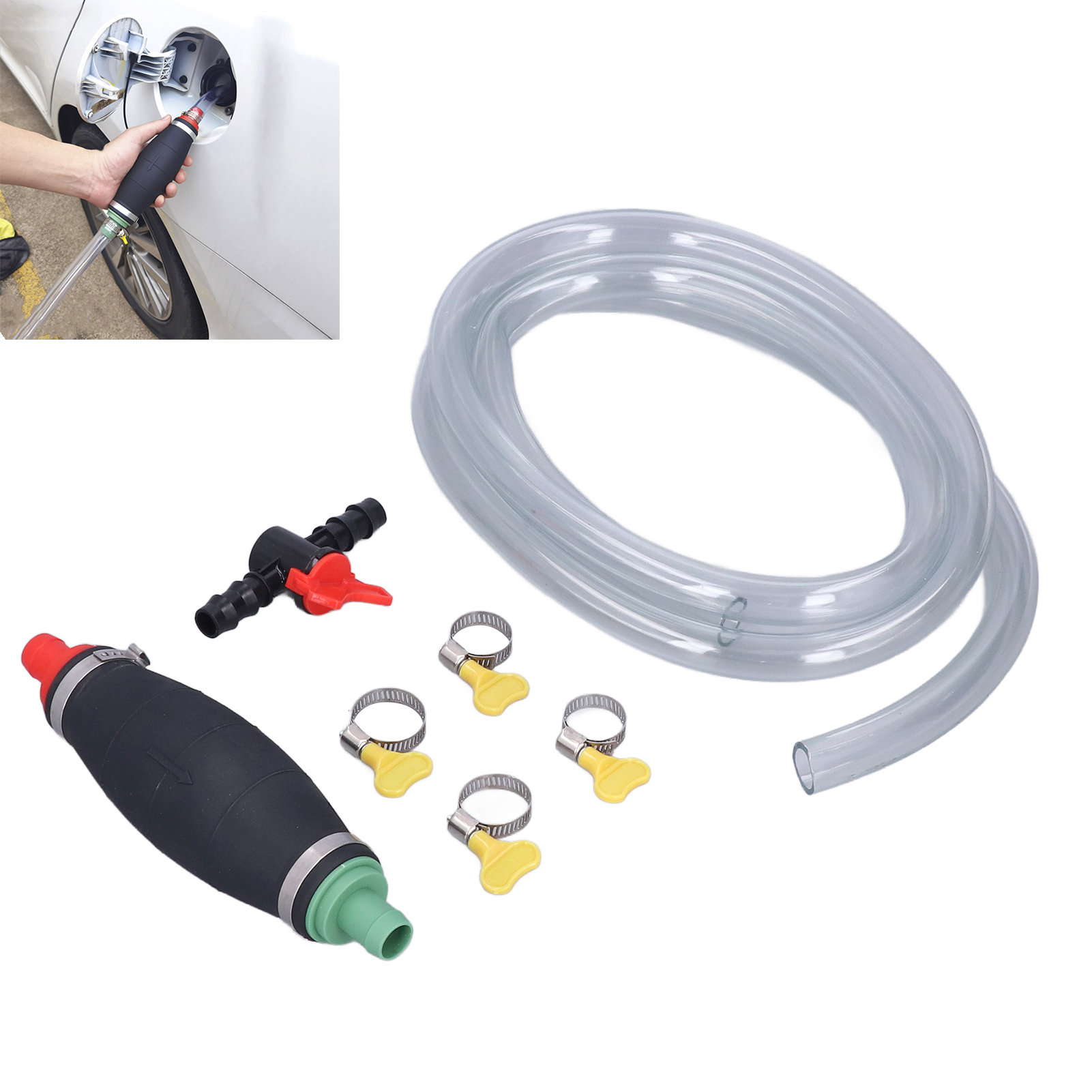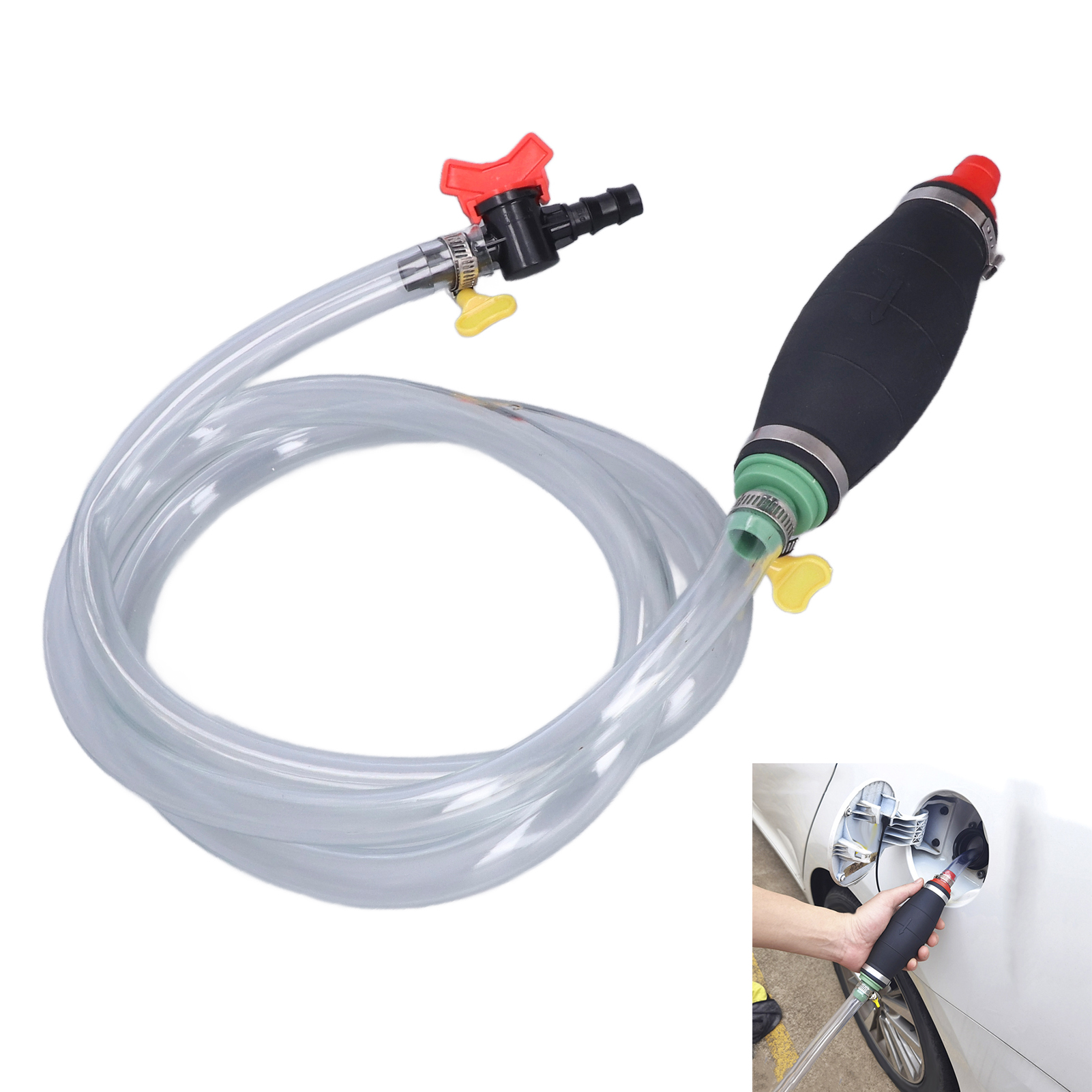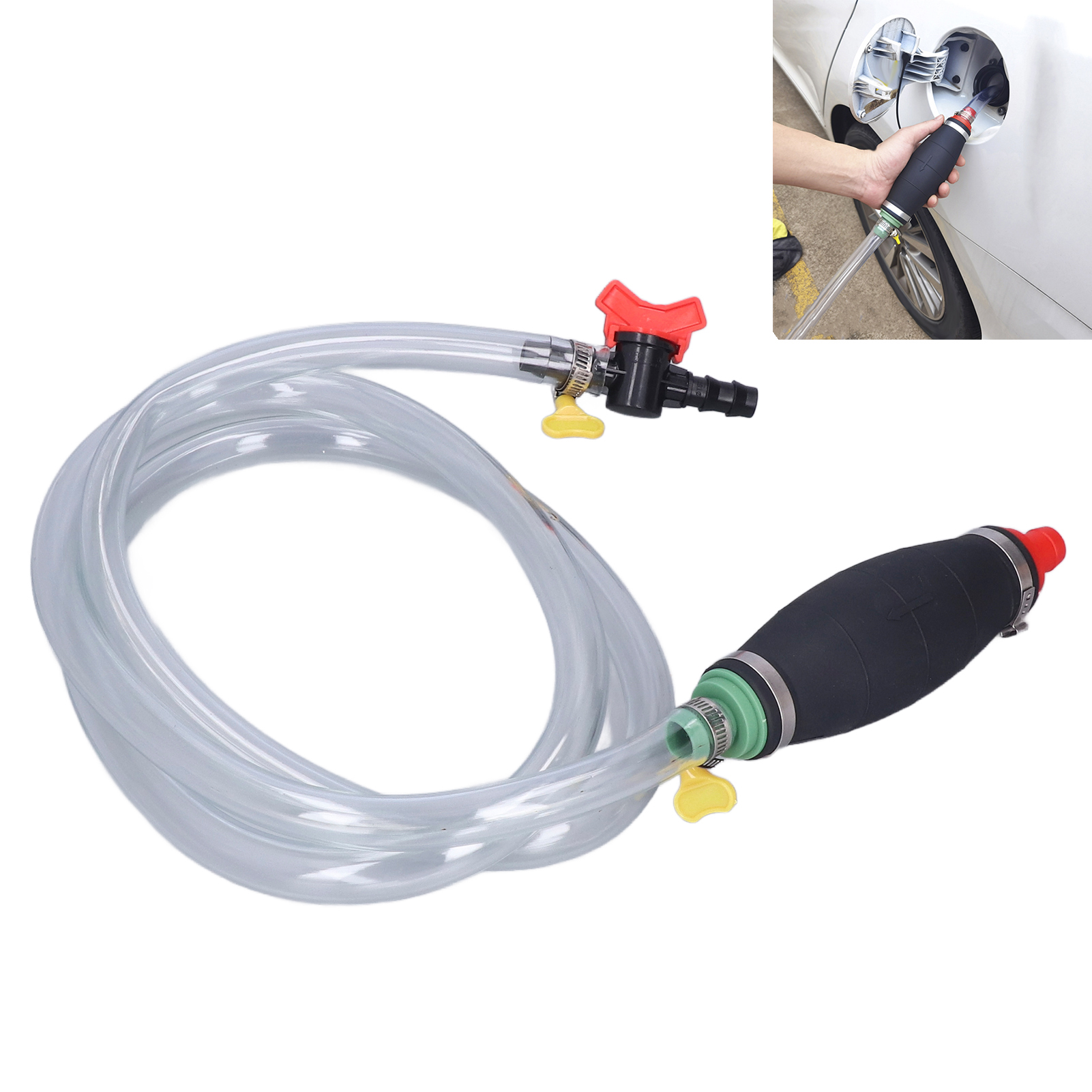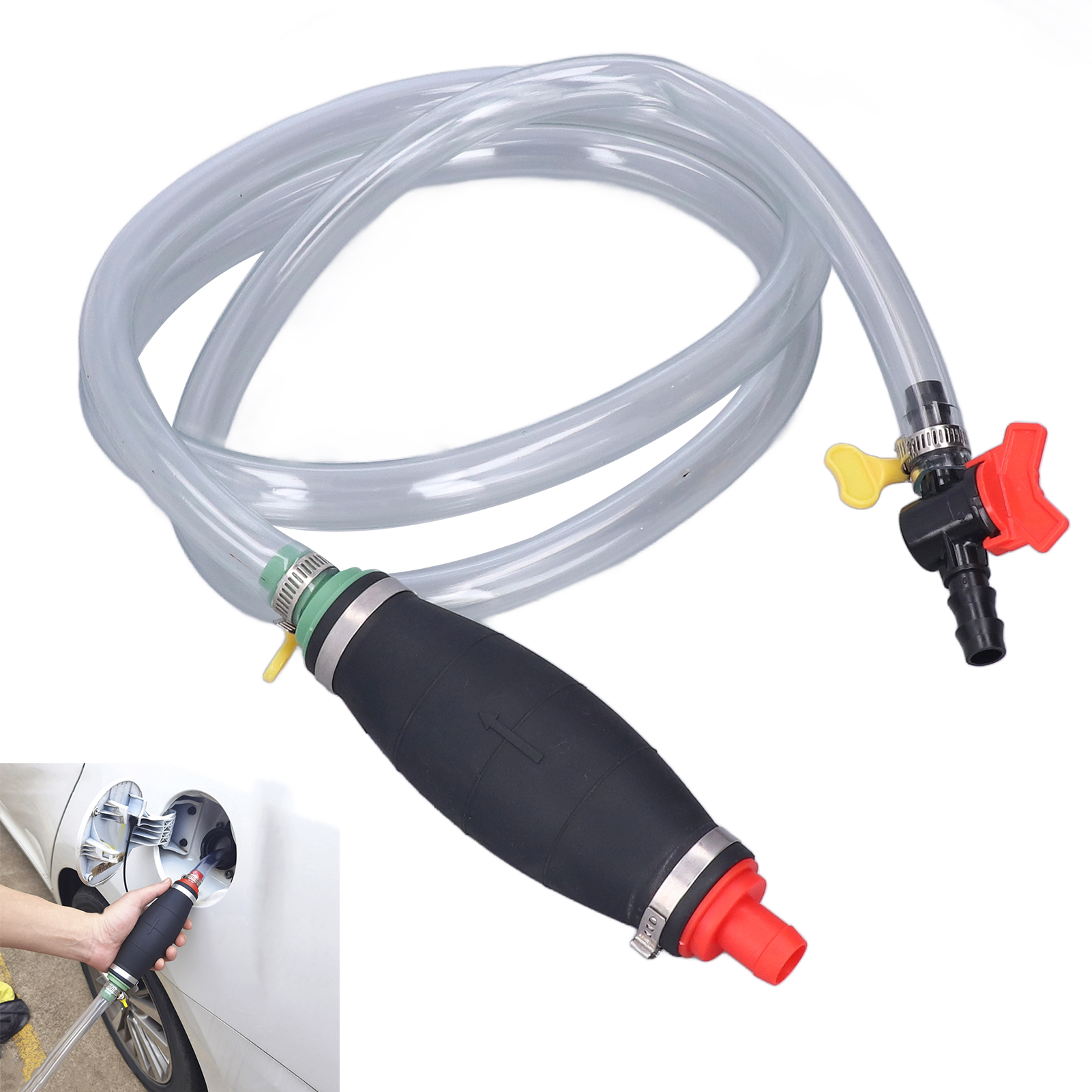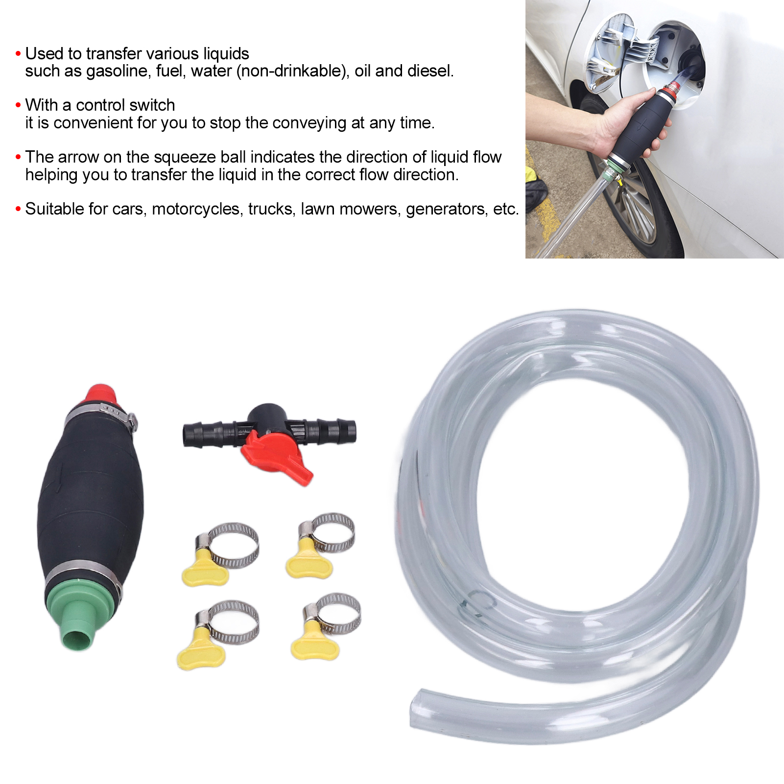 1、Wide Range of Uses: Used to transfer various liquids, such as gasoline, fuel, water (non‑drinkable), oil and diesel. With a control switch, it is convenient for you to stop the conveying at any time. 2、High Quality Materials: Thicker rubber squeeze ball and thicker hose wall, durable, environmentally friendly, and harmless to the environment. 3、Arrow Indication: The arrow on the squeeze ball indicates the direction of liquid flow, helping you to transfer the liquid in the correct flow direction. 4、Anti Leakage: Equipped with chuck locks at both ends, the hose can be tightly connected to the squeeze ball, so that the liquid will not leak. 5、Application: Suitable for cars, motorcycles, trucks, lawn mowers, generators, etc. It is also a good choice for fish tanks or small swimming pools. Light weight, easy to carry and store.