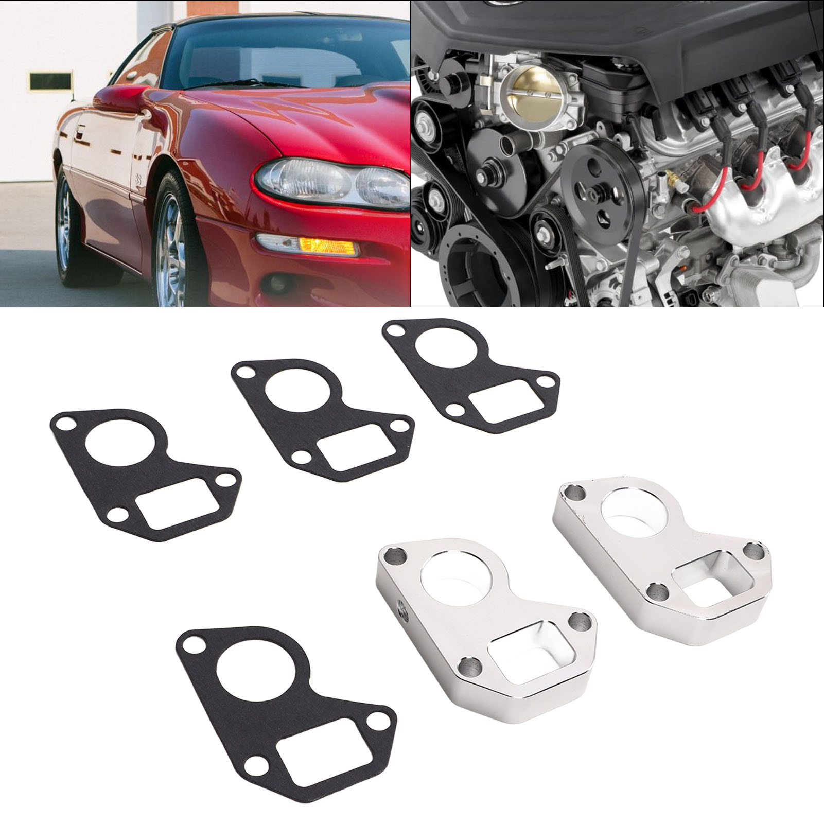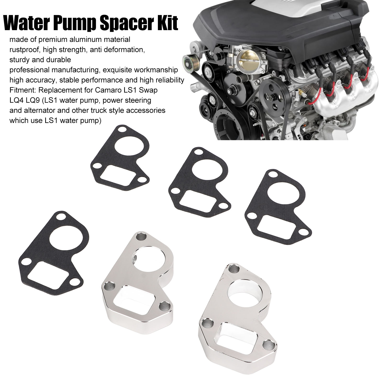 1、Fitment: Water pump spacer adapter swap kit is replacement for Camaro LS1 Swap LQ4 LQ9, for LS1 water pump, power steering and alternator, etc. 2、Premium Material: Water pump spacer kit is made of premium aluminum material, rustproof, high strength, anti deformation, sturdy and durable. 3、Function: Engine water pump spacer kit enables easy installation of low position intake manifolds, and possibly simpler radiator hose routing. 4、Excellent Performance: Professional manufacturing, exquisite workmanship, high accuracy, stable performance and high reliability. 5、Simple Installation: The installation is simple, direct replacment for the old or broken one, convenient for using, save your time and energy.