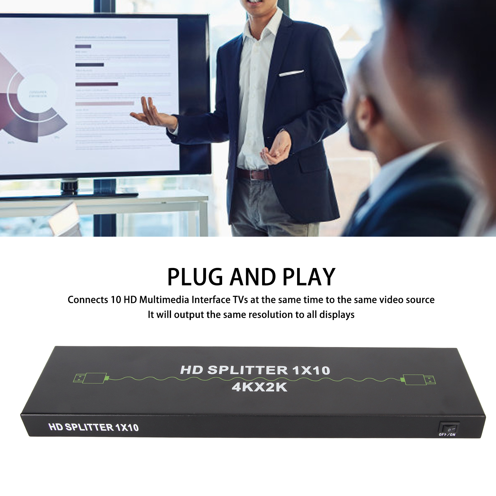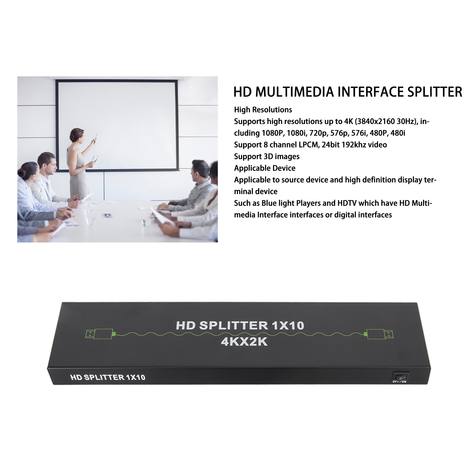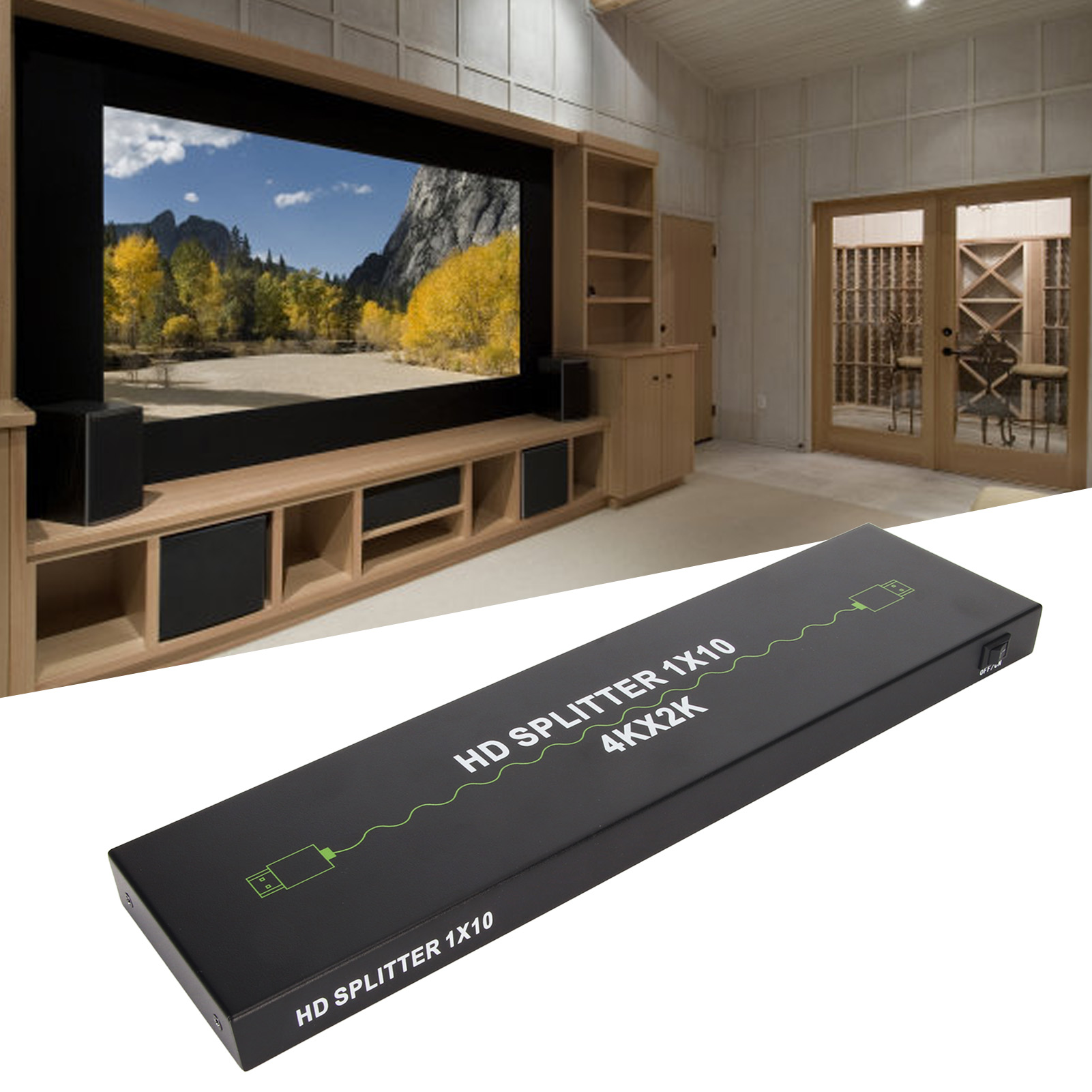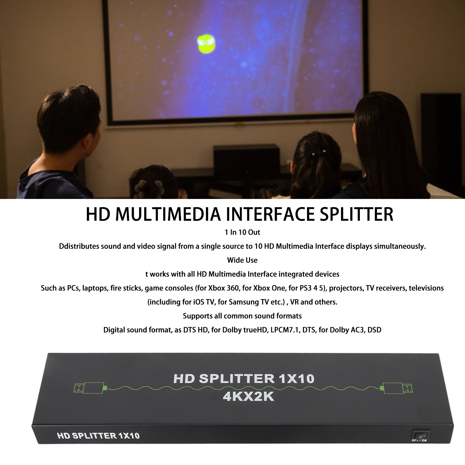 1、1 IN 10 OUT: 1x10 HD Multimedia Interface splitter distributes sound and video signal from a single source to 10 HD Multimedia Interface displays simultaneously. Supports all common sound formats. 2、WIDE USE: It works with all HD Multimedia Interface integrated devices, such as PCs, laptops, fire sticks, game consoles (for Xbox 360, for Xbox One, for PS3 4 5), projectors, TV receivers, televisions (including for iOS TV, for Samsung TV etc.) , VR and others. 3、HIGH RESOLUTIONS: HD Multimedia Interface splitter supports high resolutions up to 4K (3840x2160 30Hz), including 1080P, 1080i, 720p, 576p, 576i, 480P, 480i. Support 8 channel LPCM, 24bit 192khz video. Support 3D images. 4、APPLICABLE DEVICE: 4K HD Multimedia Interface splitter is applicable to source device and high definition display terminal device such as Blue light Players and HDTV which have HD Multimedia Interface interfaces or digital interfaces. 5、PLUG AND PLAY: 1 in 10 out HD Multimedia Interface splitter connects 10 HD Multimedia Interface TVs at the same time to the same video source. It will output the same resolution to all displays. Digital sound format, as DTS HD, for Dolby trueHD, LPCM7.1, DTS, for Dolby AC3, DSD.