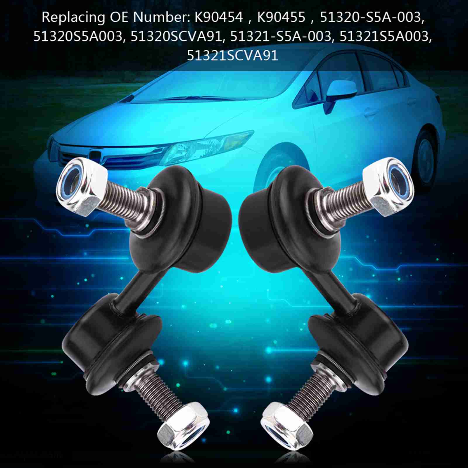 1、100% brand new aftermarket Suspension Sway Bar End Link Kit with premium quality 2、All metal construction ensures its strength and durability 3、Powder-coated finish for long-lasting rust and corrosion resistance 4、Replacing OE number for reference: K90454, K90455, 51320-S5A-003, 51320S5A003, 51320SCVA91, 51321-S5A-003, 51321S5A003, 51321SCVA91 5、Fit for Honda Civic / Element / Acura / RSX / CR-V