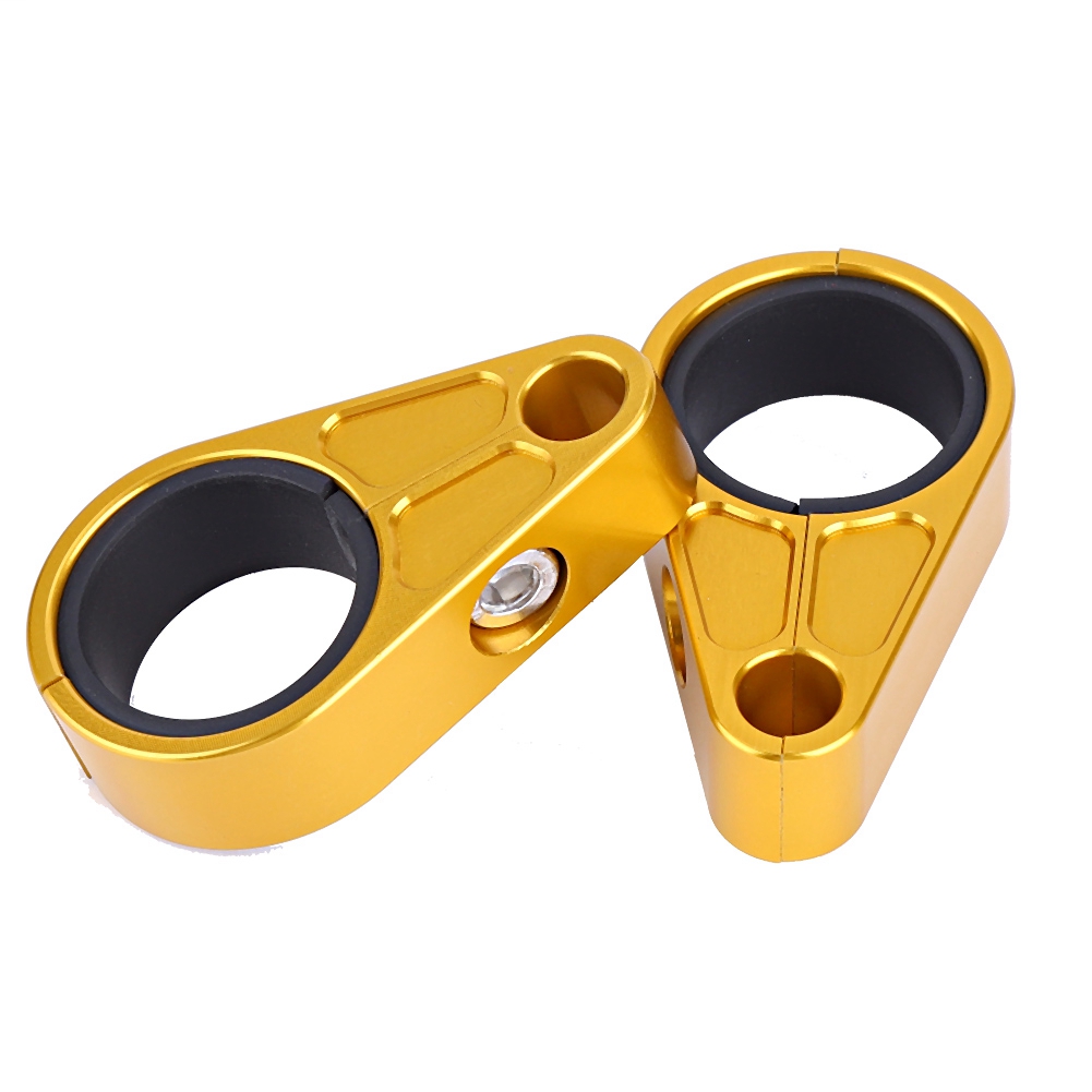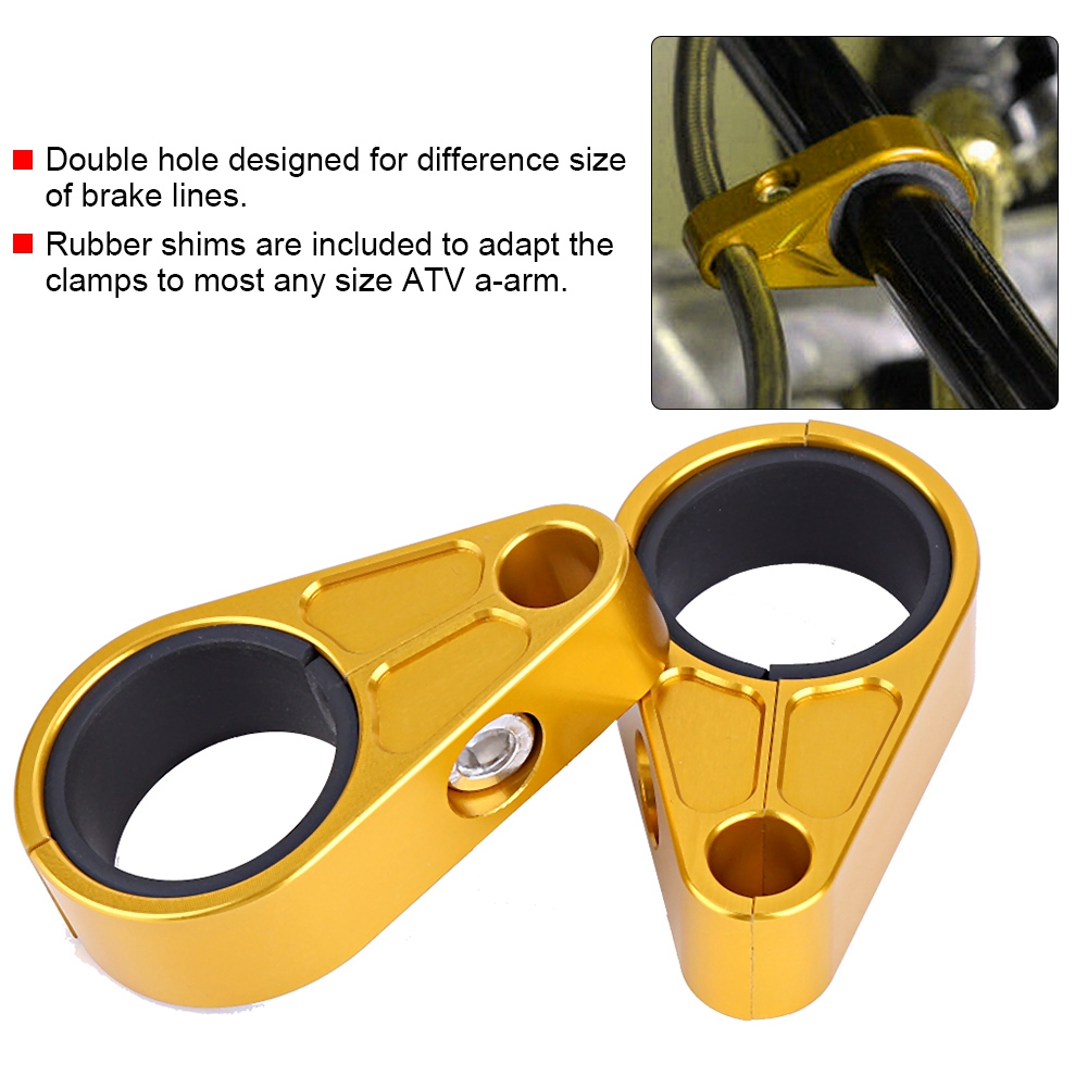 1、CNC machined from billet 6061-T6 aluminum alloy. 2、Premium quality, anodized surface finish, exquisite appearance. 3、Double hole designed for difference size of brake lines. 4、Rubber shims are included to adapt the clamps to most any size ATV a-arm. 5、Sold in pairs, there are five colors to choose from.