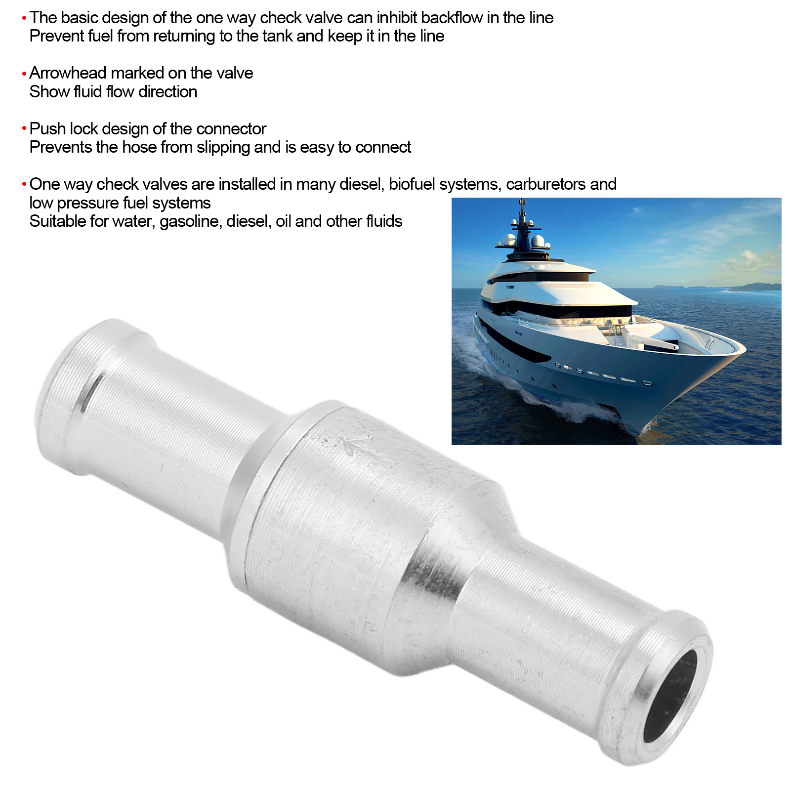 1、Function: The basic design of the one way check valve can inhibit backflow in a line. The arrowhead marked on the valve shows the direction of fluid flow, preventing fuel from returning to the tank and keeping it in the line. 2、Characteristic: The push lock design of the connector prevents the hose from slipping off and is easy to connect. The surface is anodized, the appearance is beautiful, and the thread strength is outstanding. 3、Application: One way check valves can be installed in many diesel, biofuel systems, carburetors, and low pressure fuel systems where you desire fuel flows in only one way. Suitable for water, gasoline, diesel, oil and other fluids. 4、Premium Material: The nonreturn check valve body is made of high‑quality aluminum alloy and has a longer service life than plastic. Stable characteristics and high reliability. 5、Easy to Install: Connect the fuel line according to the small arrowhead on the valve. You can use some hose clamps to ensure that the pipe does not fall off. The design is simple and easy to operate.