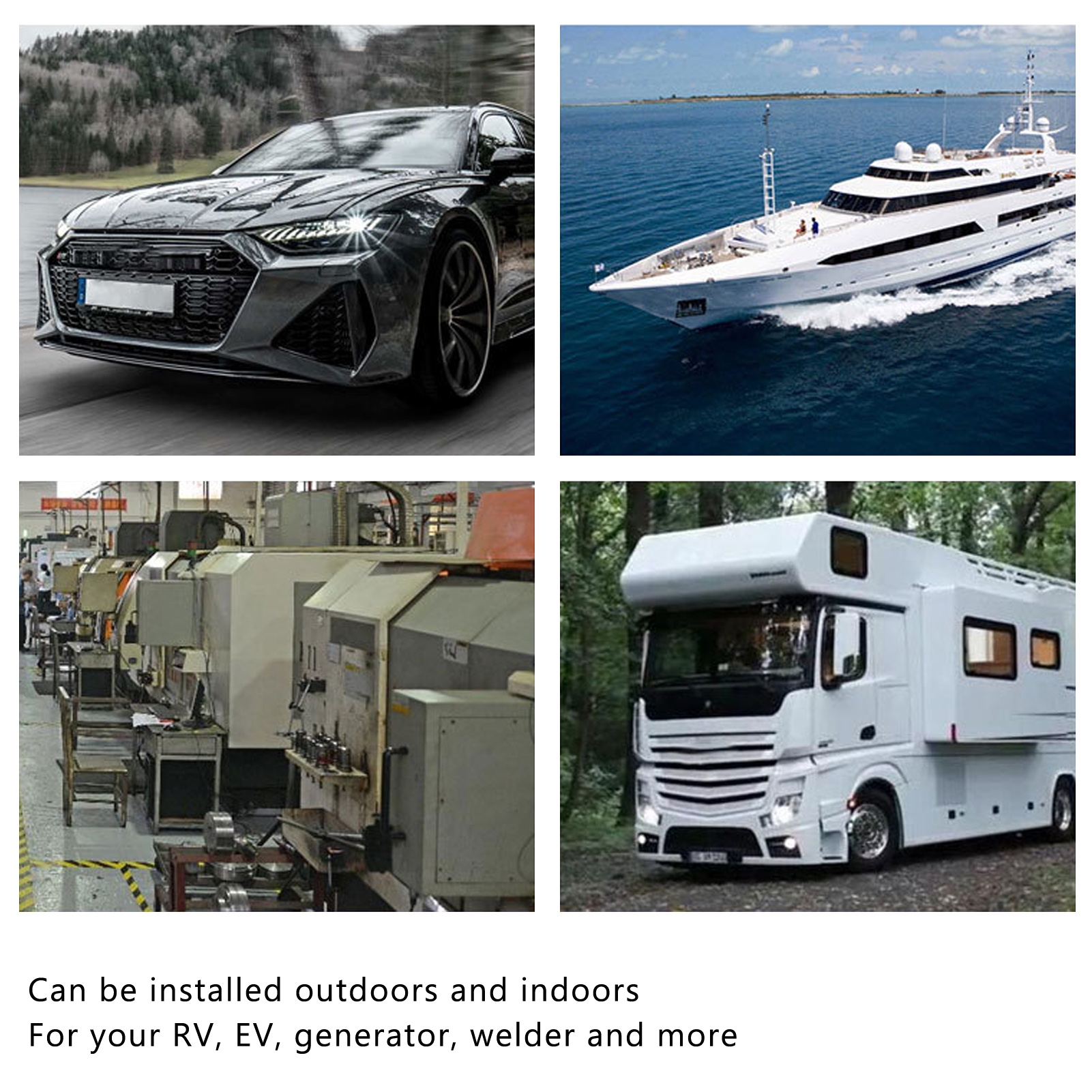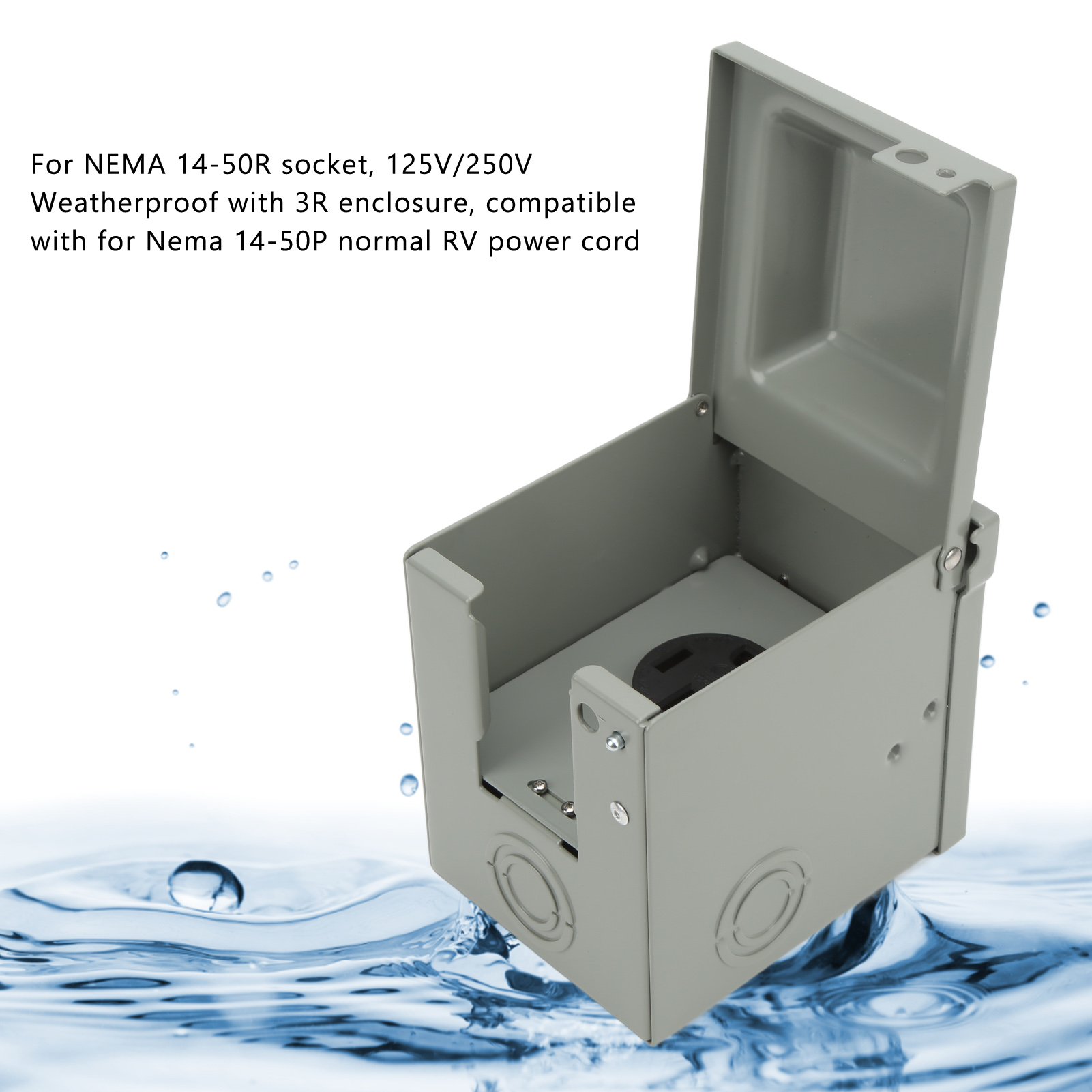1、Fitment: For NEMA 14‑50R electrical receptacle panel, /, weatherproof with 3R enclosure, compatible with for Nema 14‑50P normal RV power cord. 2、Large Space: Even with a large handle or a heavy duty stiff rated wire, there's plenty of space to close the lid when the power cord is plugged in. 3、Wide Applications: Power outlet box can be installed both outdoors and indoors for easy connection and charging, suitable for your RV, electric vehicle, generator, welder, and more. 4、Installation: It is recommended that you go through the top wiring and just unscrew the screw easily. There are plenty of good solid construction konckouts on the bottom and sides, which is not easy to knock it out. 5、Durable Material: Waterproof receptacle panel is made of premium steel material, anti rust, wearproof, sturdy and durable, can be used for a long time.